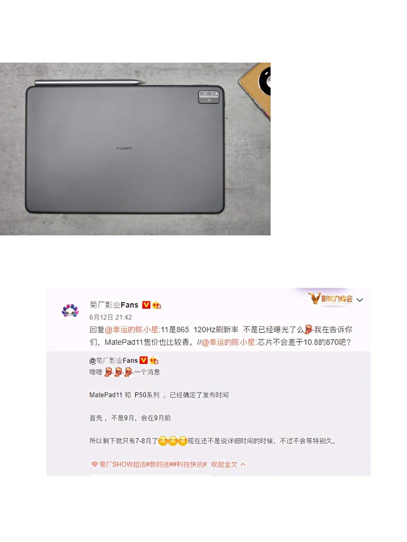 👍根据知名大V透露,华为P50系列将于下半年九月份前发布,预计将会在七八月就能够上市销售,届时华为MatePad11 平板电脑也将和P50 系列手机同台亮相;而华为 MatePad 11 配备了一块 10.95 英寸 60/120Hz 分辨率为 2560 x 1600的IPS屏幕,搭载了高通骁龙865处理器,不支持4G、5G网络,只支持 WiFi 网络,配备 6GB + 64GB/128GB 存储,还支持MicroSD 卡与第二代手写笔,出厂预装 HarmonyOS 2.0 系统;