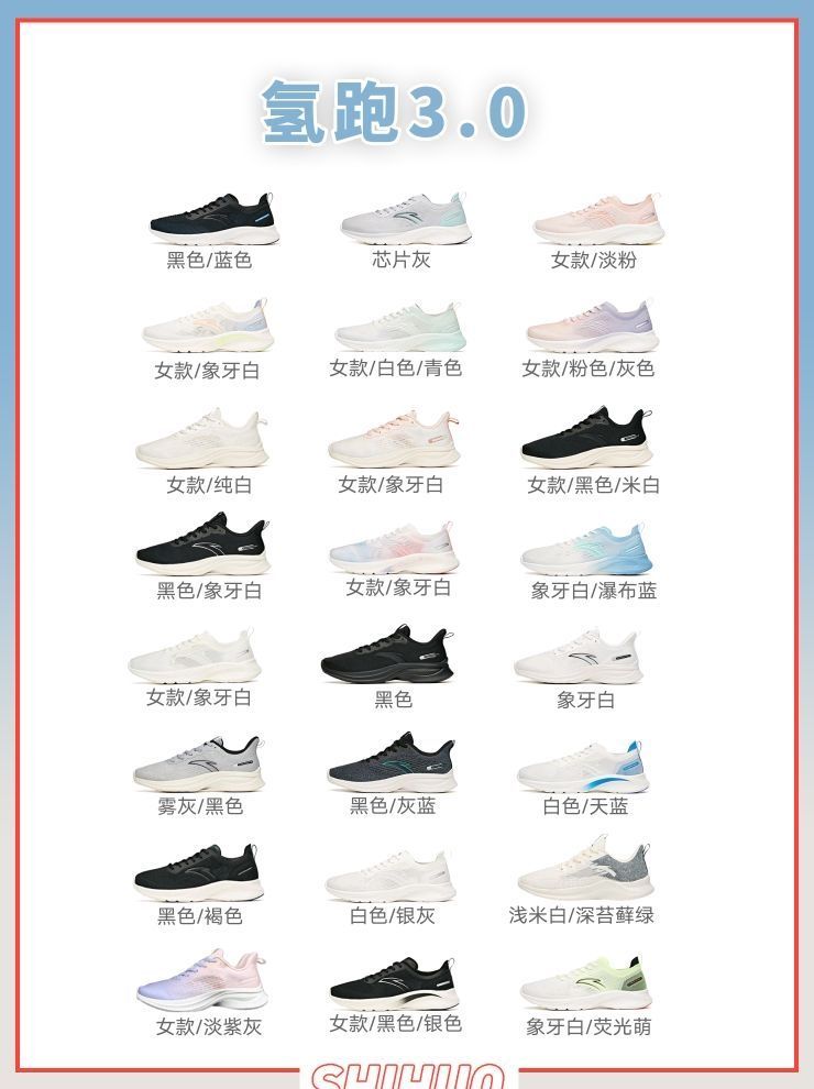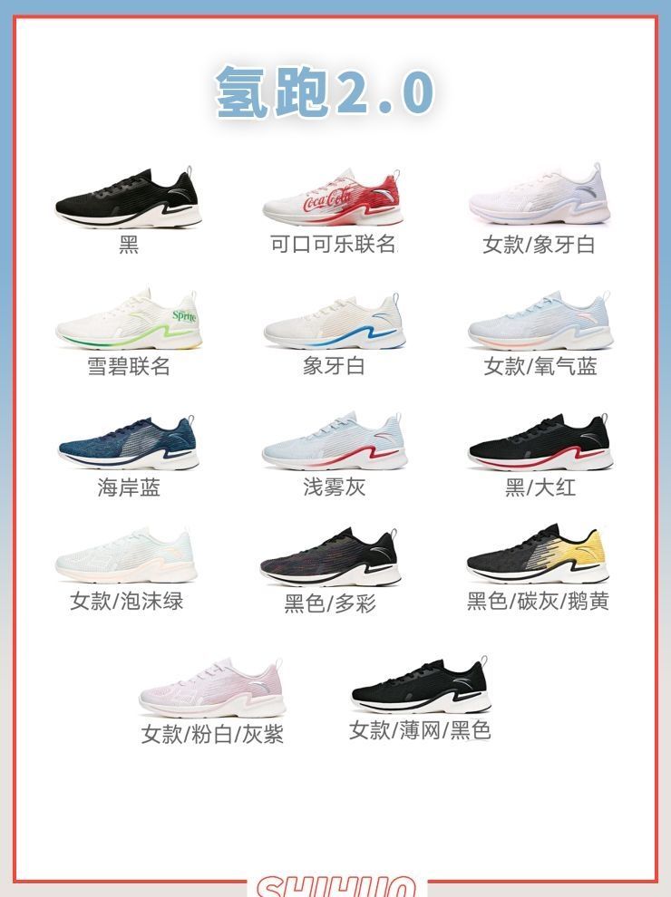 氢跑3.0 识货价格:100💰~300💰 配色版本:25双 CLOUDKNIT帮面轻盈透气,打造舒适凉爽的穿着体验。鞋口充棉U型设计,鞋口充棉,为脚踝带来柔软触感。后跟拉绳设计,方便穿脱。鞋中底采用轻质EVA,缓震同时提高弹性,释放能量缓震回弹,舒适包裹。全新舒适跑大底,延用氢跑3.0树叶设计灵感,轻质柔软。 氢跑2.0 识货价格:100💰~300💰 配色版本:15双 鞋采用一体织鞋面,看起来...