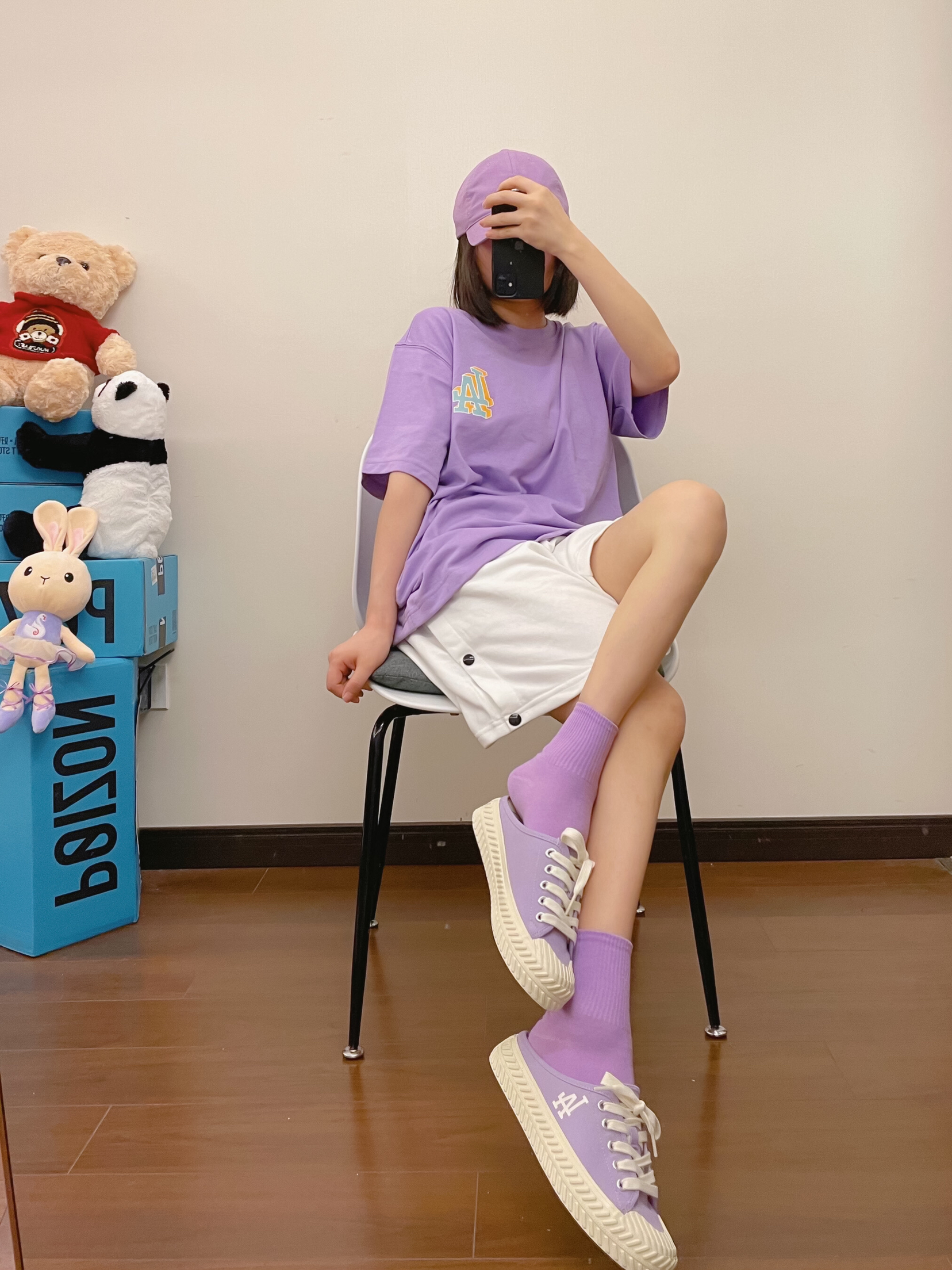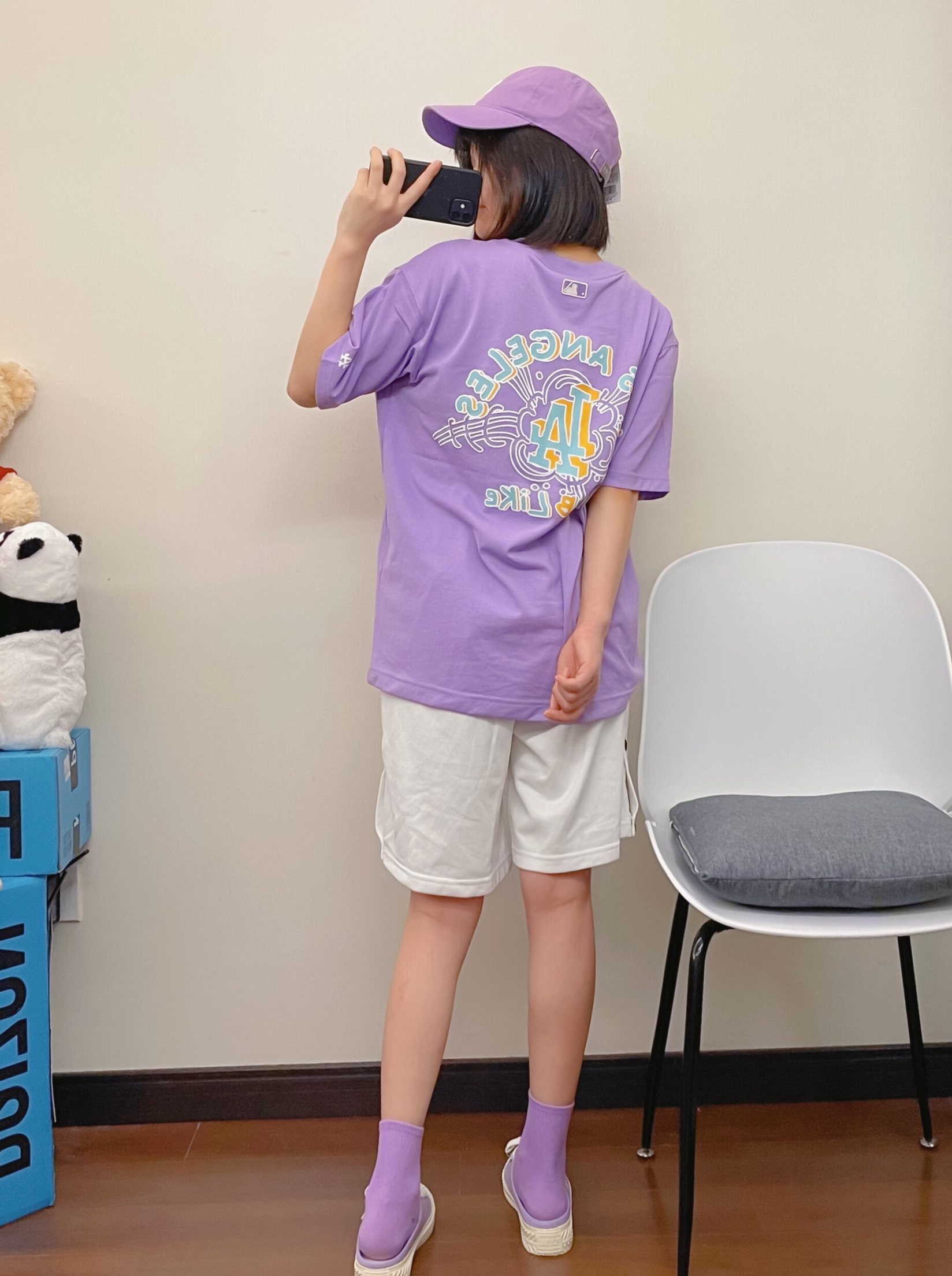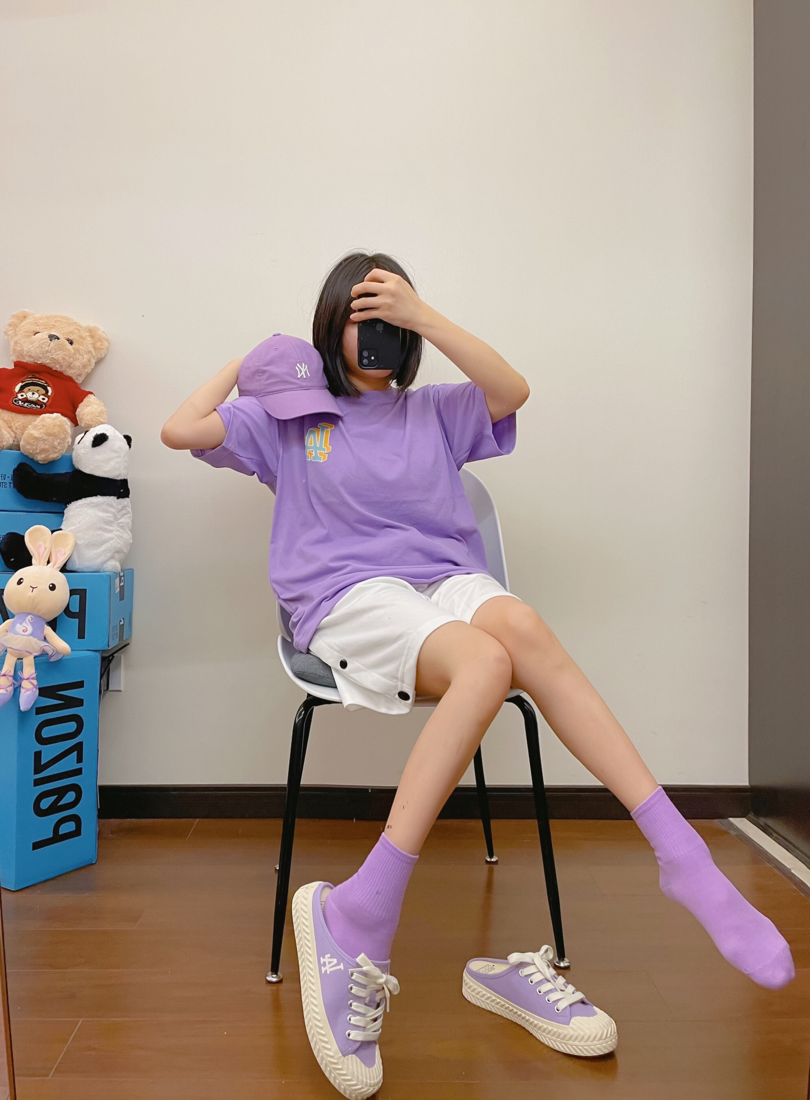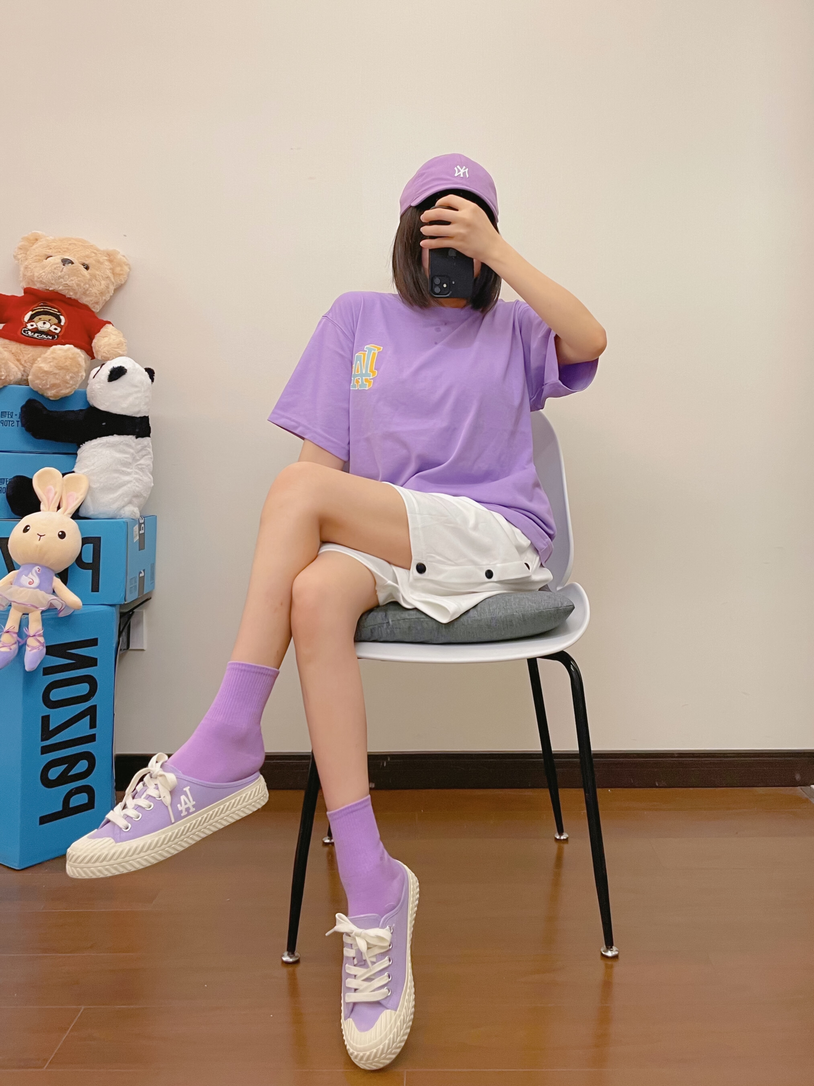 💜MLB紫色T 💜白短裤 💜MLB紫色半拖鞋 💜紫色帽 💜同色系搭配 首尾呼应色 穿插白色搭在中间就不会显得繁重 紫色的长袜 搭配紫色的半拖真的特别有型 搭配感十足 帽子衣服的紫色都是浅色的 颜色特别相近 很有套装的那个味 💜上衣料子很薄 特别适合夏天 鞋底有稍微一点点的增高 很好看 高矮都适合