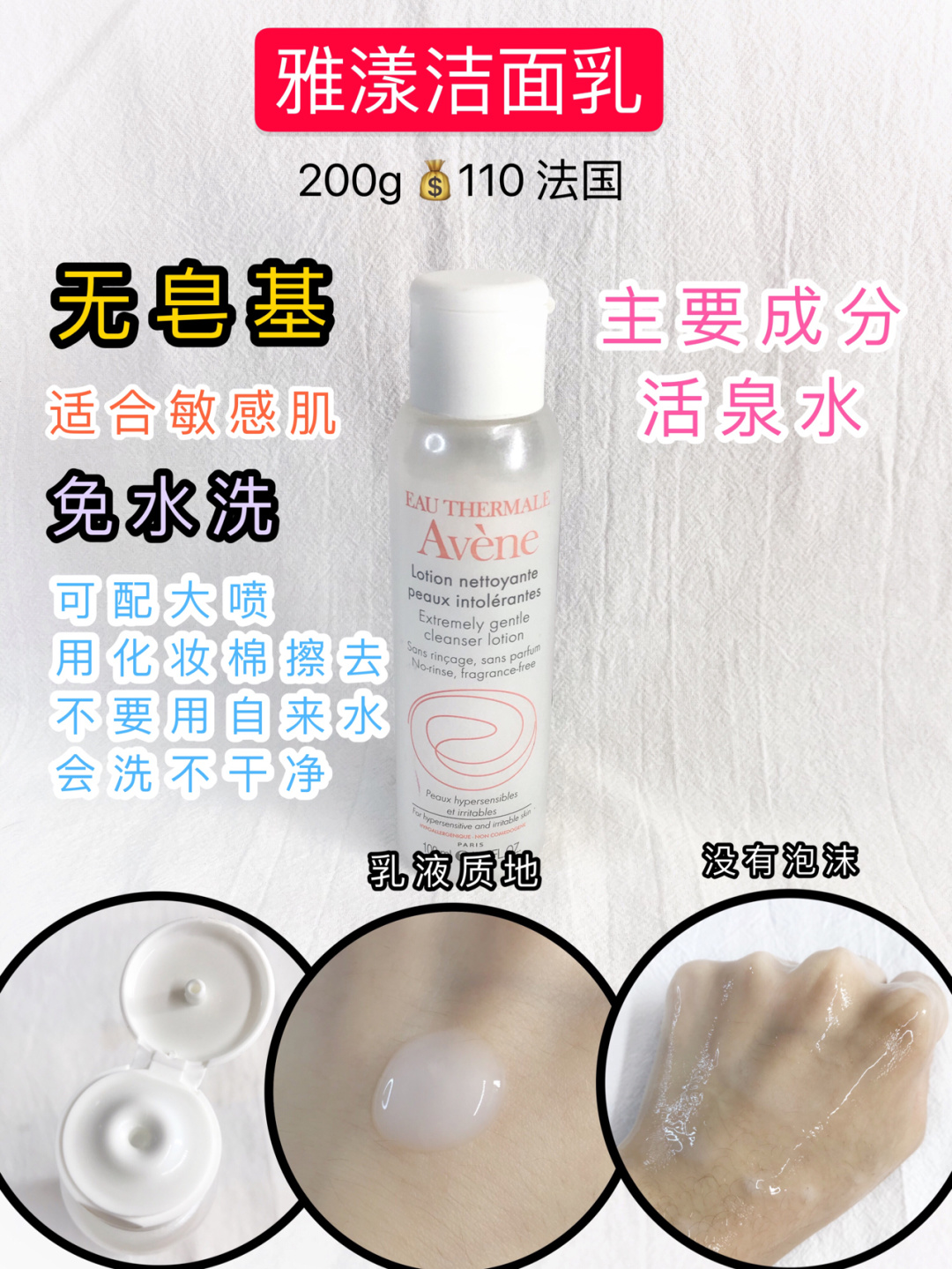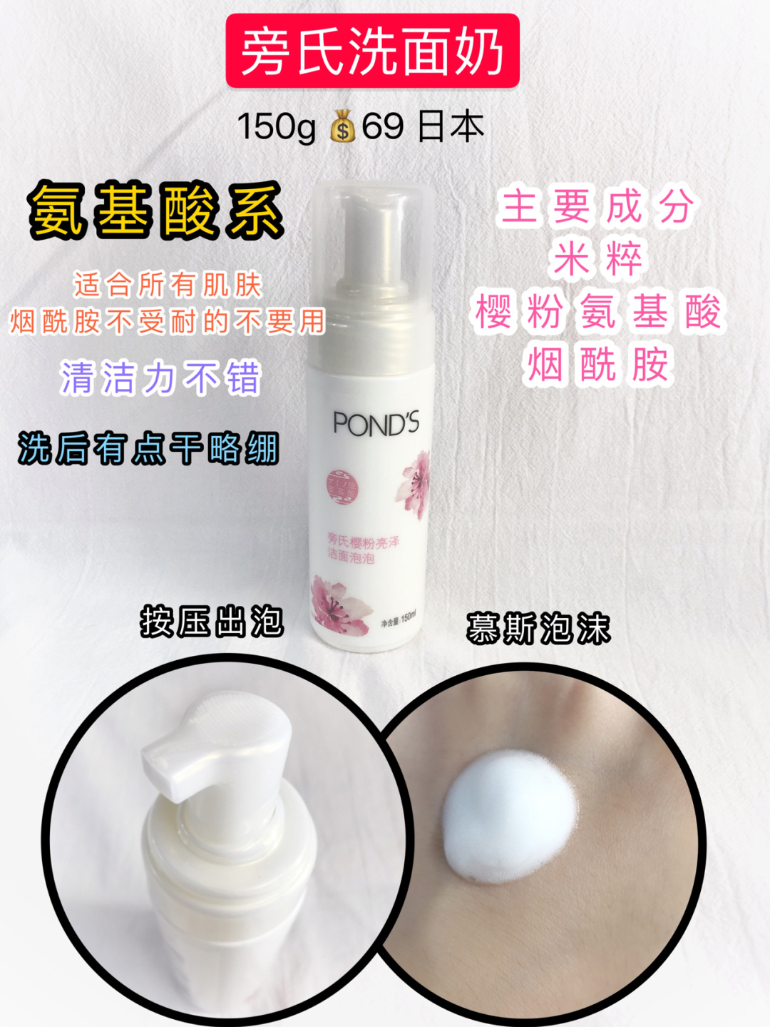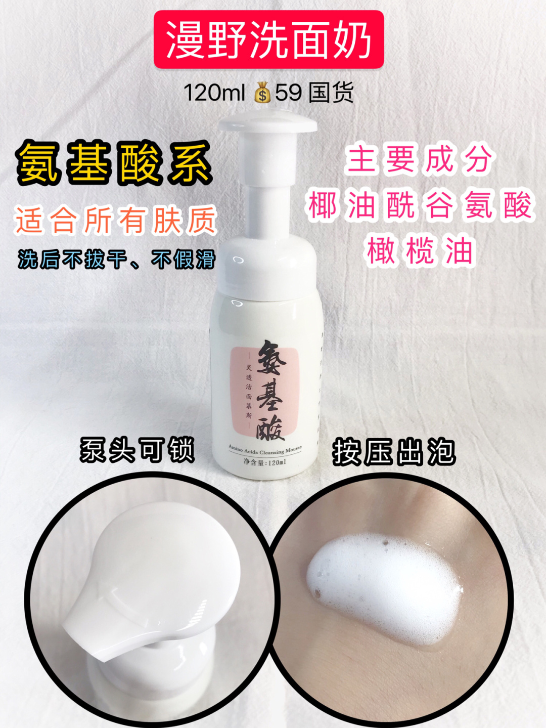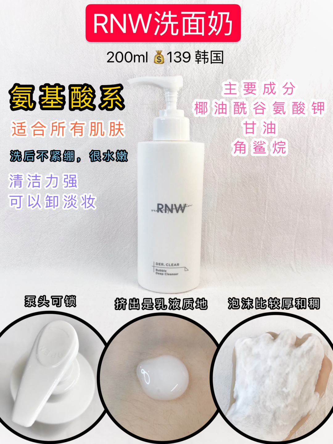 本篇笔记关联了RNW 云朵氨基酸洁面泡沫洗面奶 深层清洁毛孔自发泡 洁净保湿、谷雨 氨基酸舒颜洁面液 细腻不伤肤 150ml、雅漾 修护舒缓敏感肌温和清洁免洗洁面乳 调理肌肤 温和不刺激等商品,为用户提供真实的使用体验和购买参考。