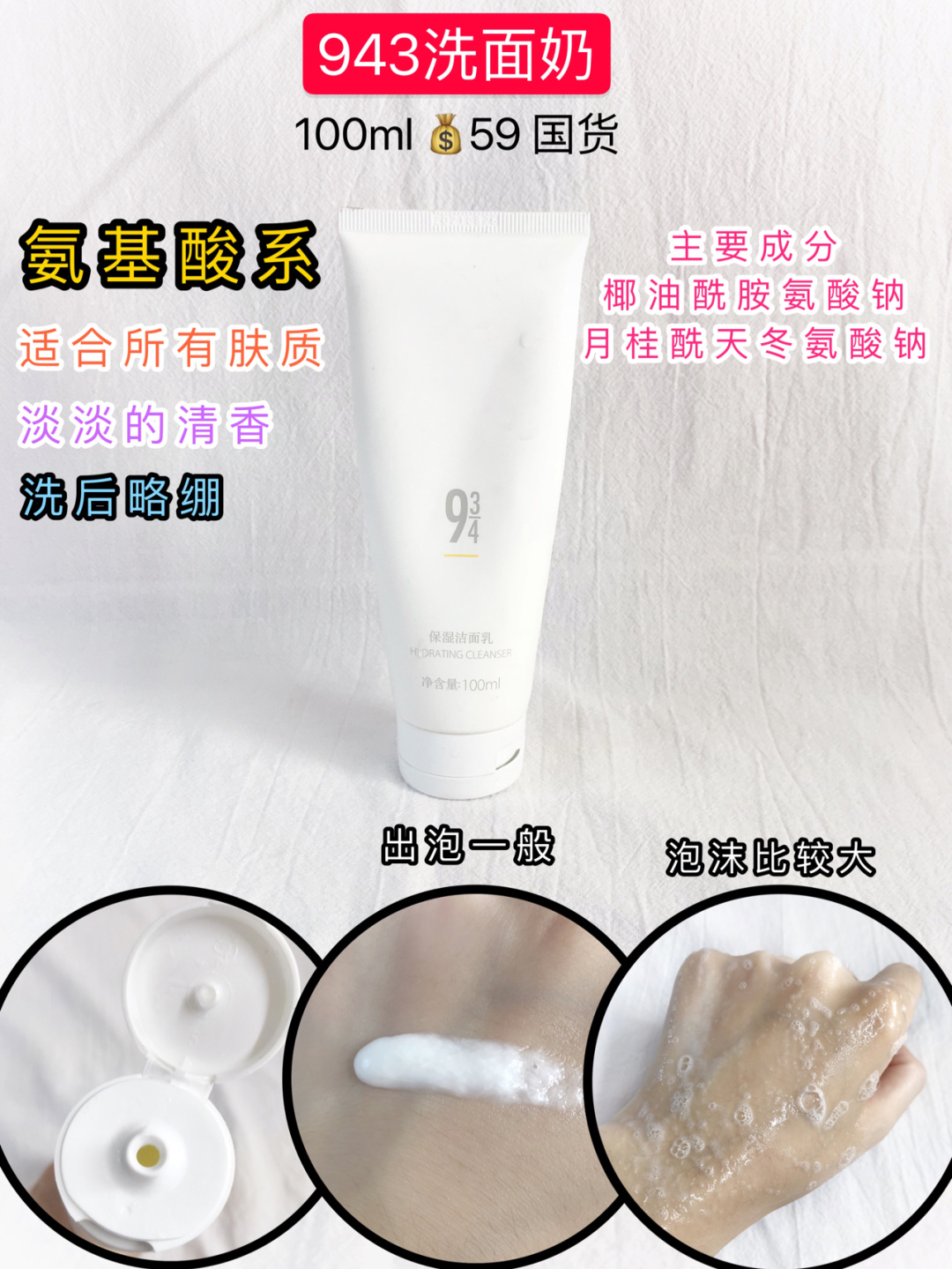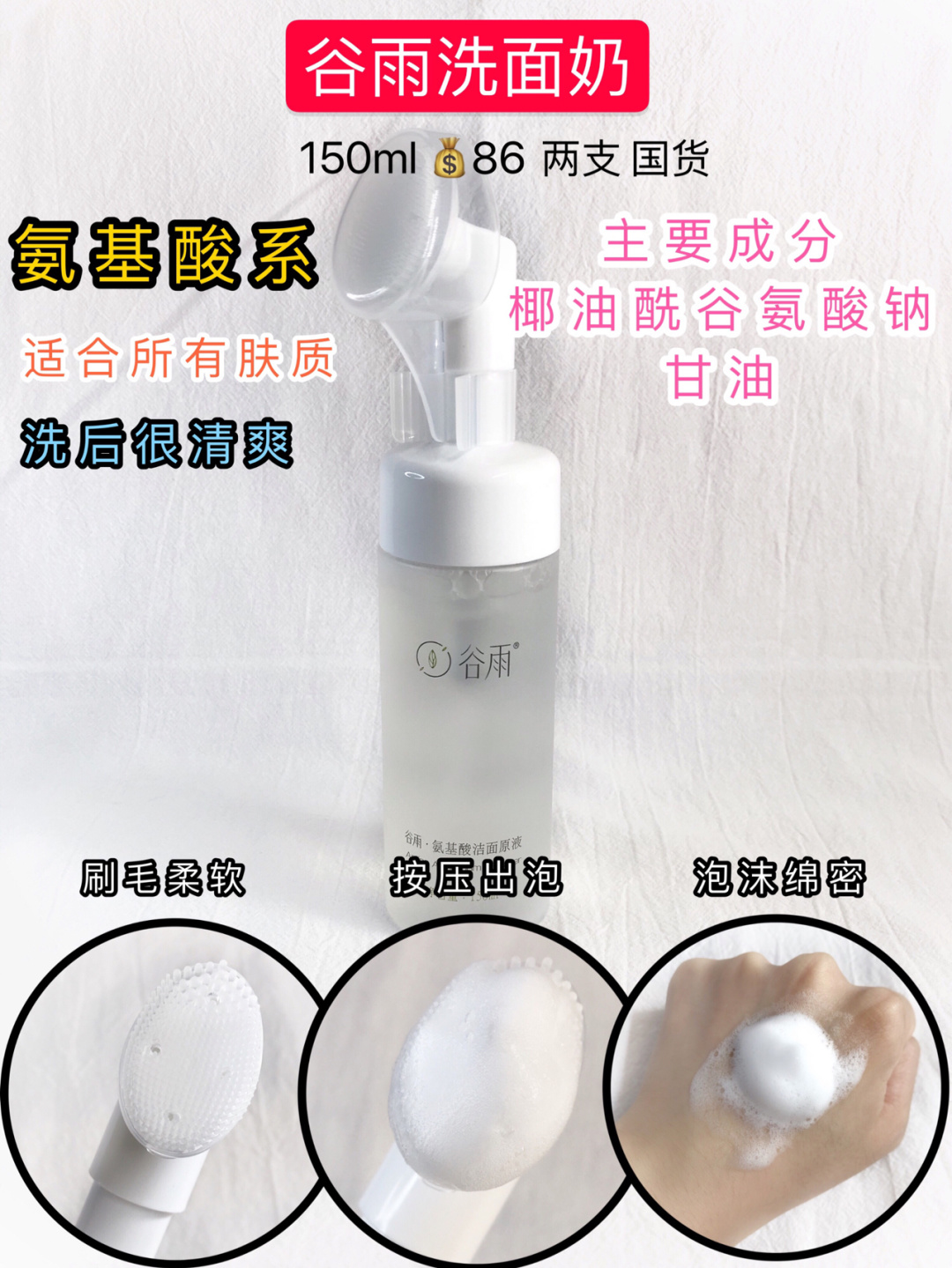 9款热门洗面奶测评!油皮干皮敏感肌选对氨基 洗面奶有【氨基酸系】温和清洁、【皂基系】清洁力度强,刺激性也大 建议油皮早上氨基酸,晚上一周3-4次皂基。干皮氨基酸就够了。敏感肌选弱酸性氨基酸、甜菜碱 一、氨基酸系不含皂基 1谷雨 150ml 86两支 国货 泡沫:按压出泡,很软绵 主成分:椰油酰谷氨酸钠、甘油 适合所有肤质 刷毛柔软细腻,灵活度OK,一点不鸡肋 刷头粗细结合,luna同款,粗刷T区,...
