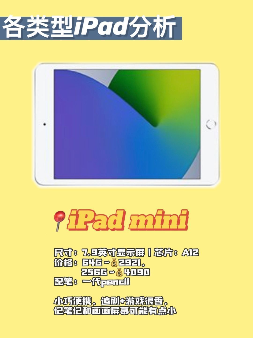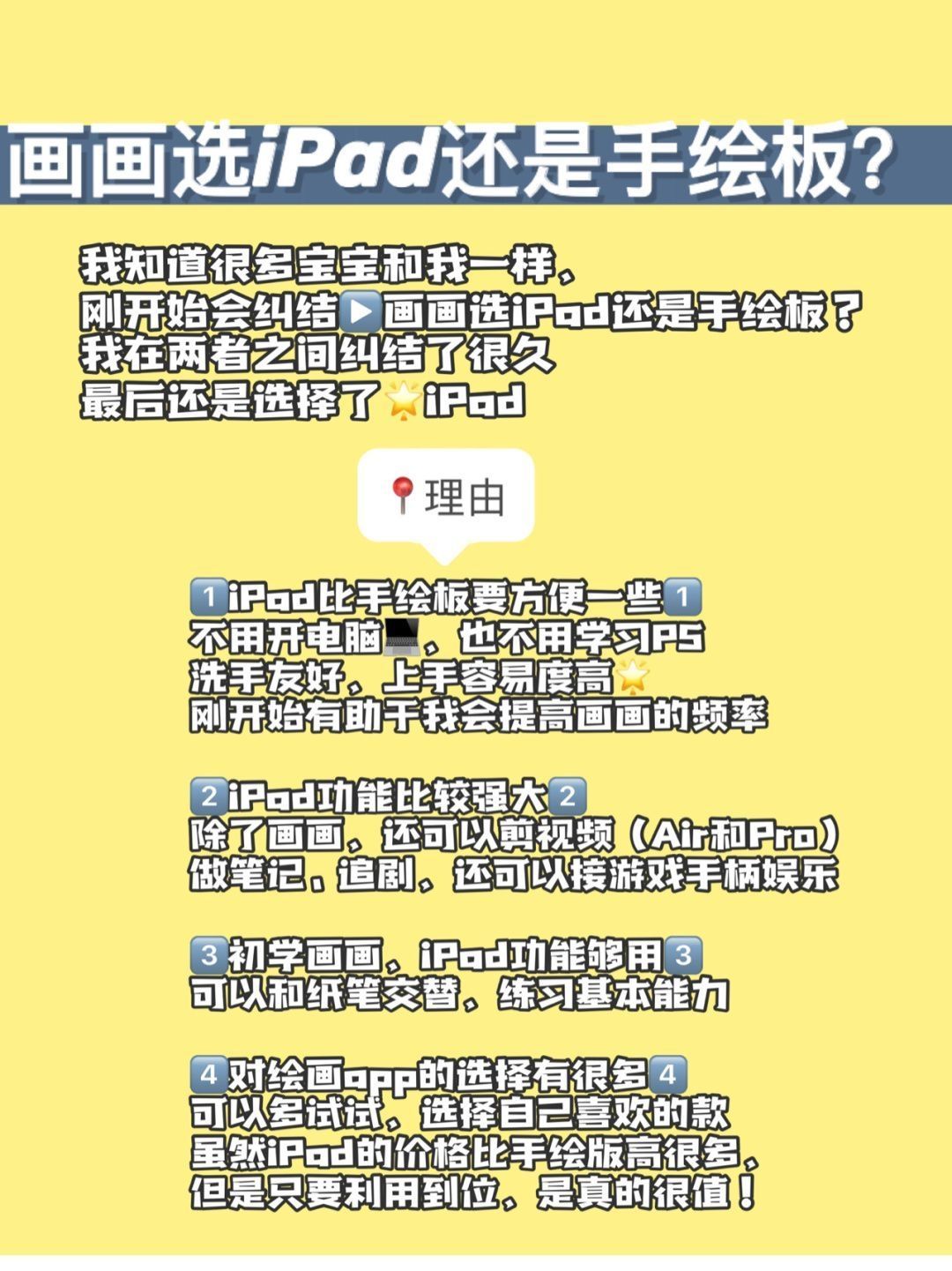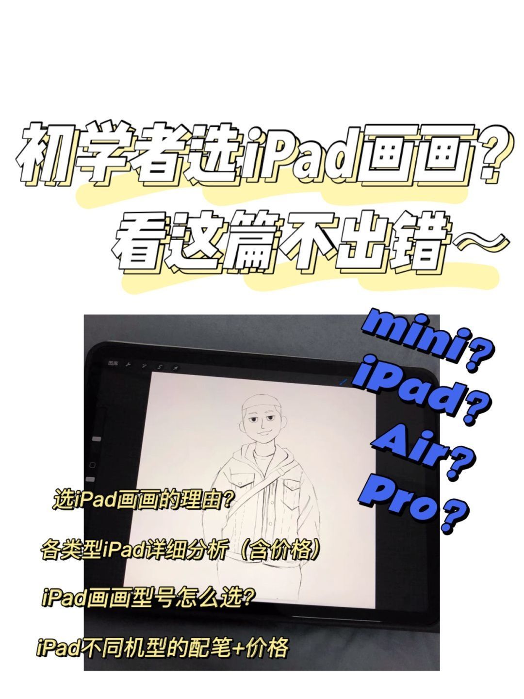 我知道很多宝宝和我一样, 刚开始肯定纠结▶️画画选iPad还是手绘板? 我也在两者间纠结了比较久的时间 最后还是选择了iPad😬 。 🔘理由🔘 1️⃣iPad比手绘板要方便一些 2️⃣iPad功能比较强大 3️⃣初学画画,iPad功能真的够了 4️⃣对绘画app的选择有很多 。 🔘iPad型号🔘 iPad(官网)主要有四种类型的iPad:(详细看图3-6) 1️⃣iPadmini5 2️⃣iPad...
