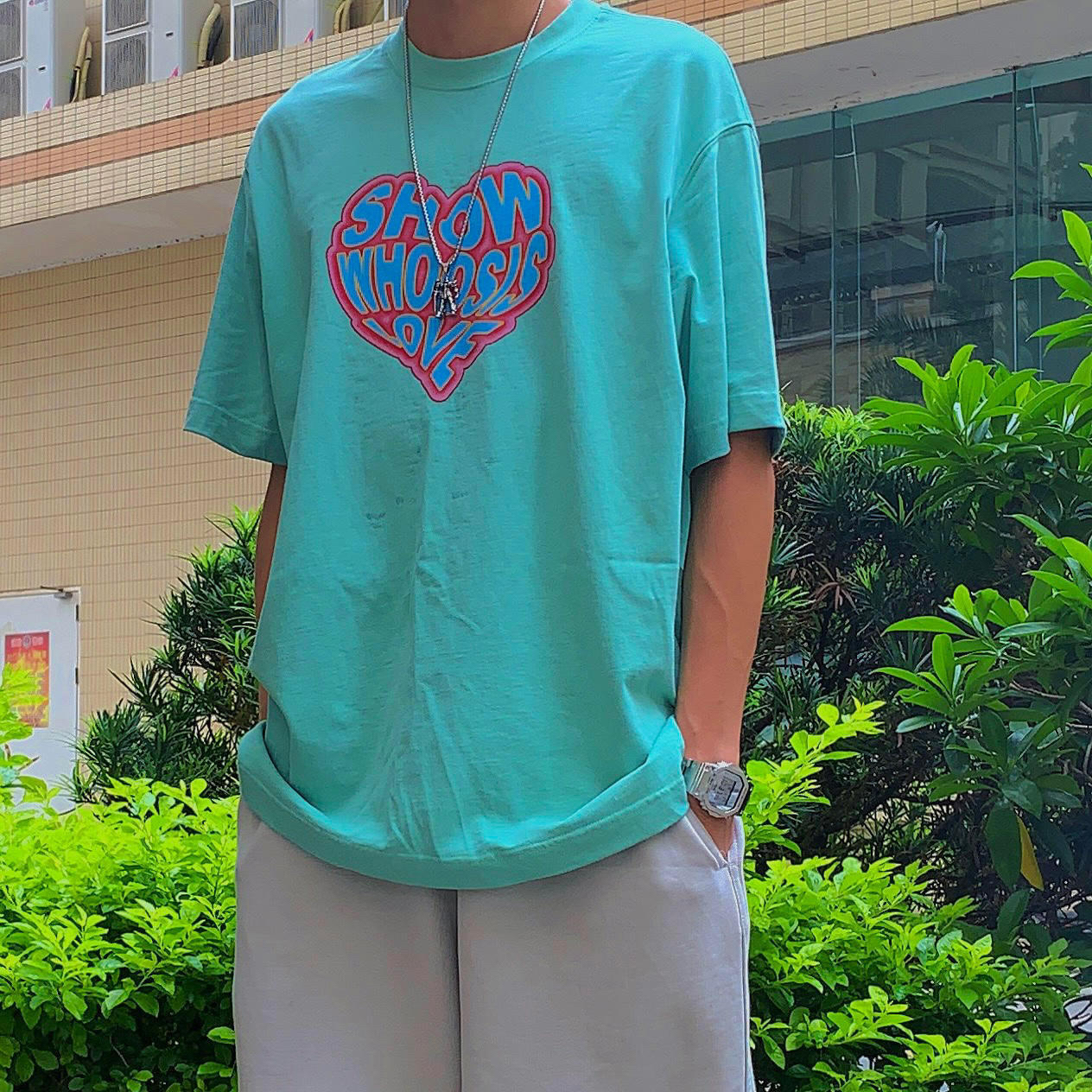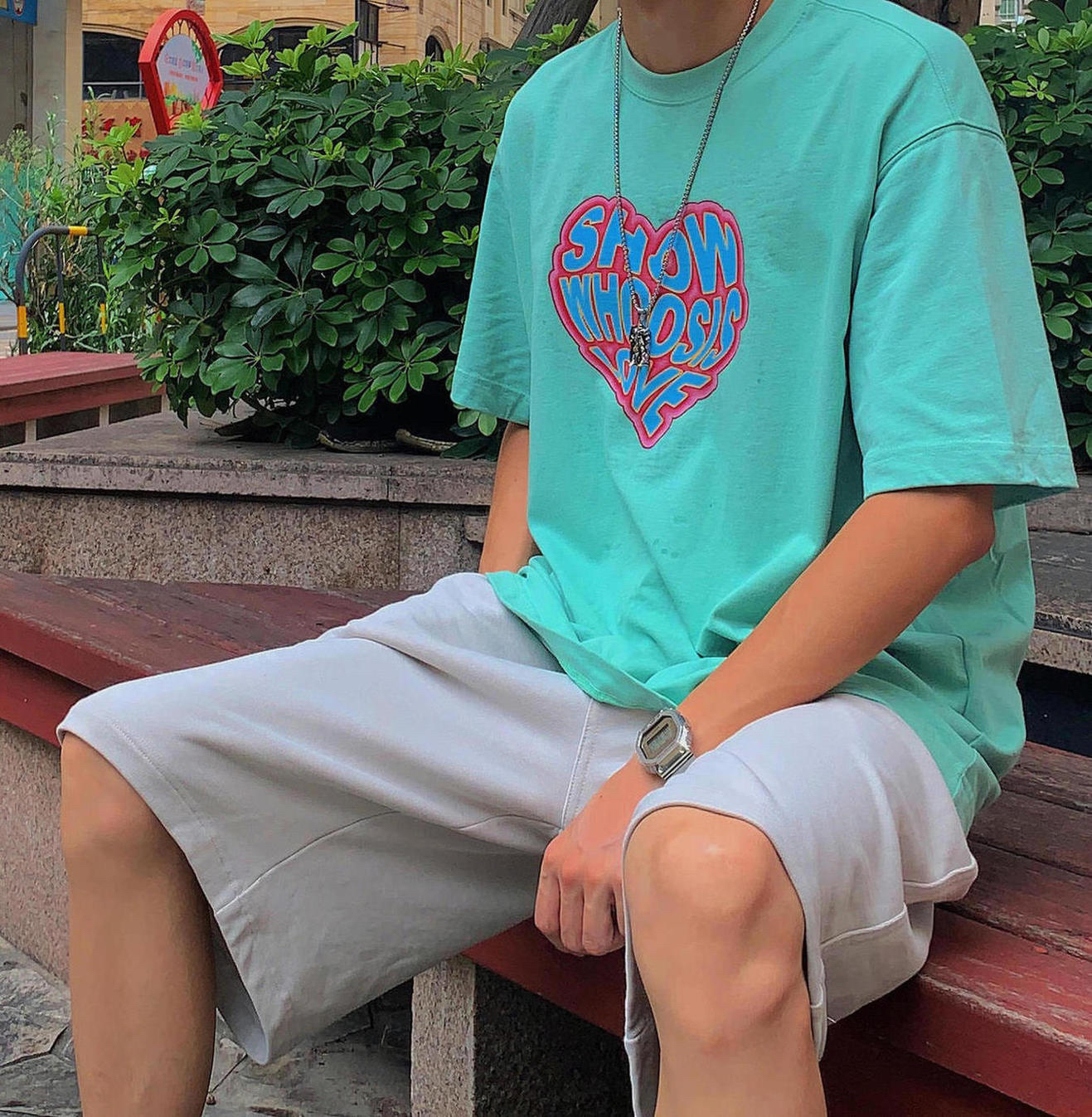 👔:WHOOSIS 一件绿色T袖衣柜必备,绿色🍃看起来就很有夏天的感觉,爱心💗印花的点缀,让整体简约而不单调,最近喜欢的单品之一了。 👖:SimpleProject 灰白色的休闲短裤,搭配各种颜色的上衣都不会出错,百搭色。 👟:AF1 鞋子选择百搭空军,清爽出门👏