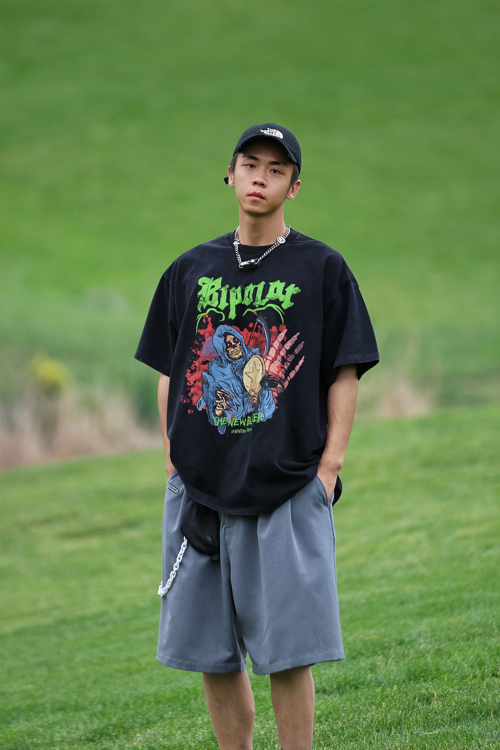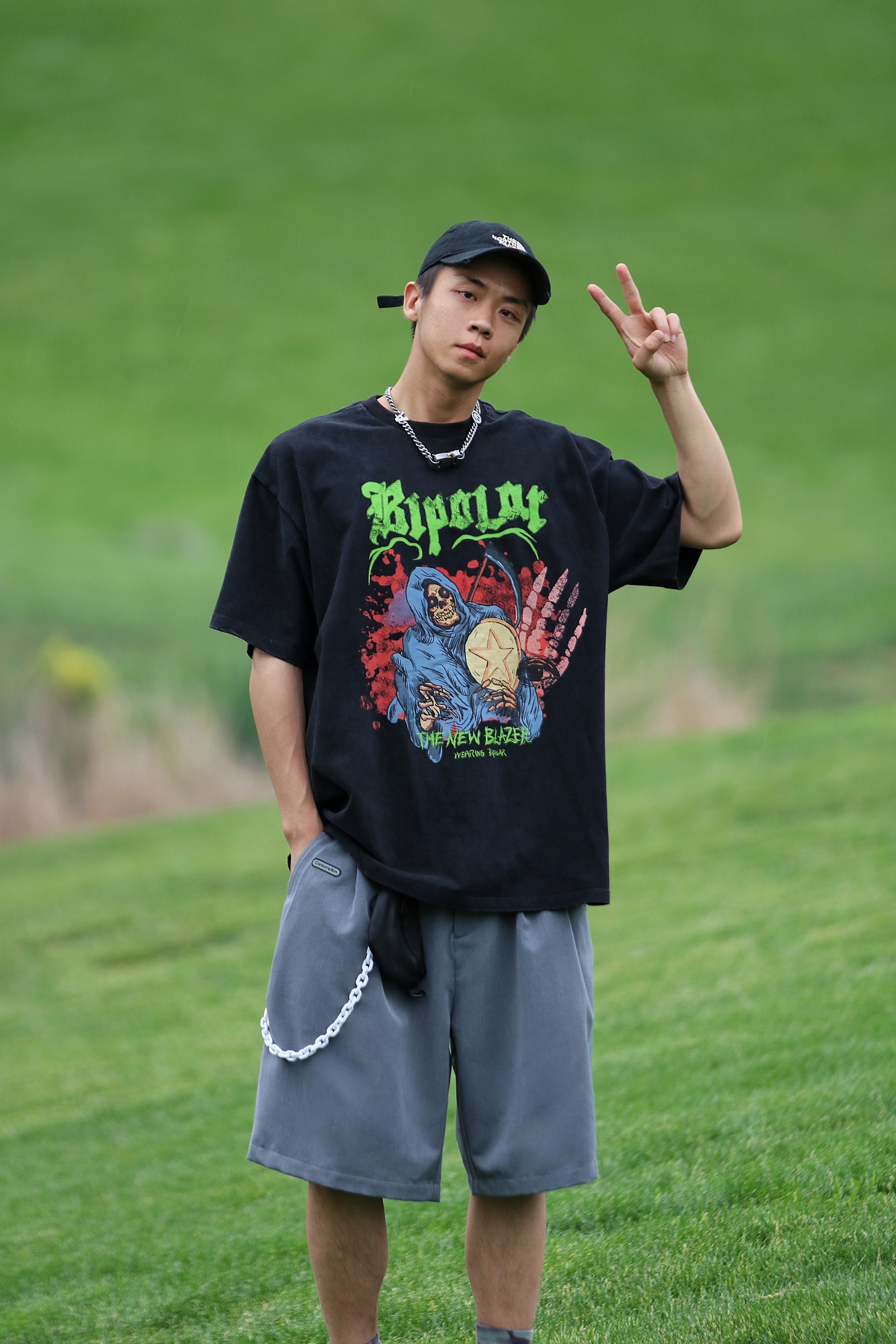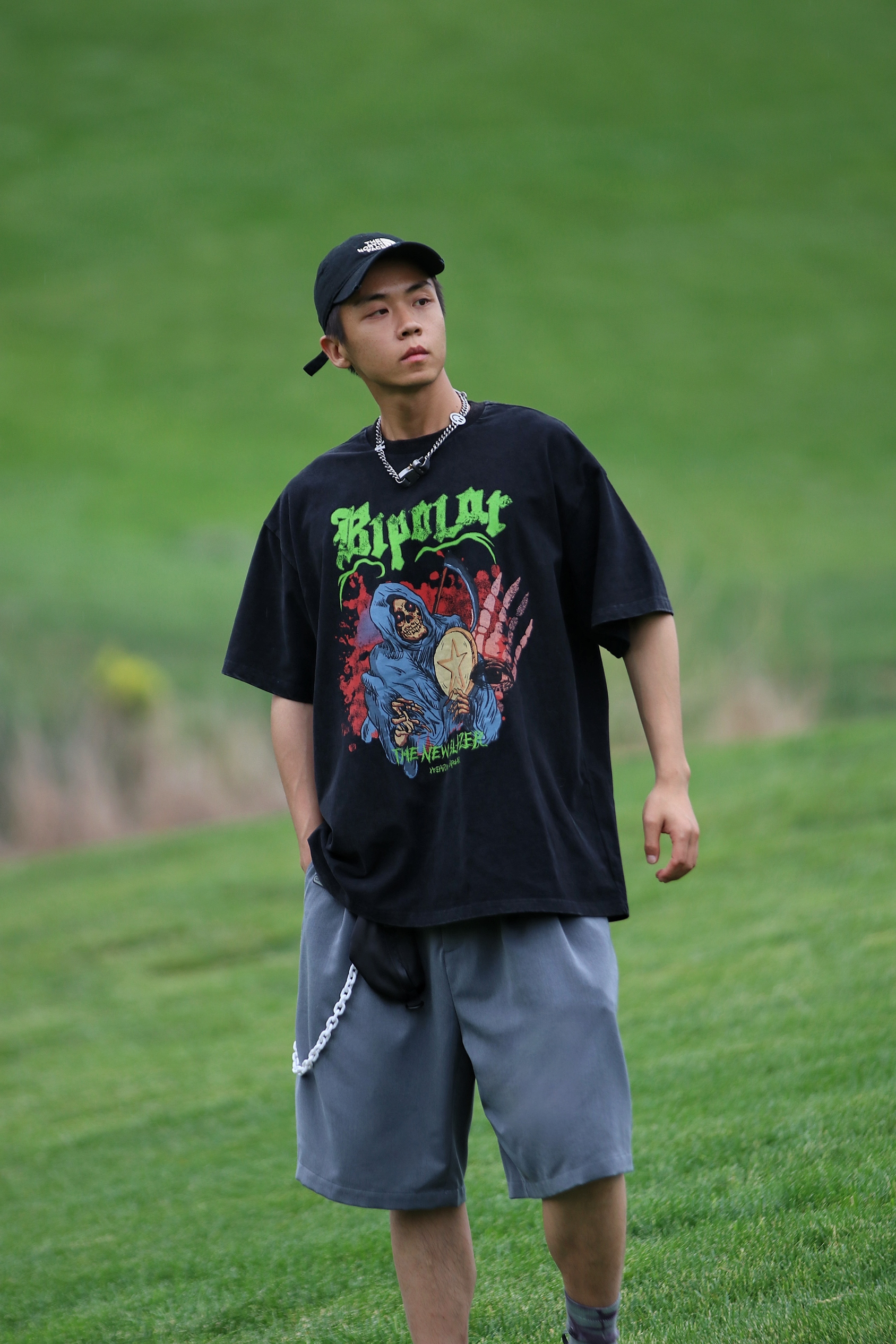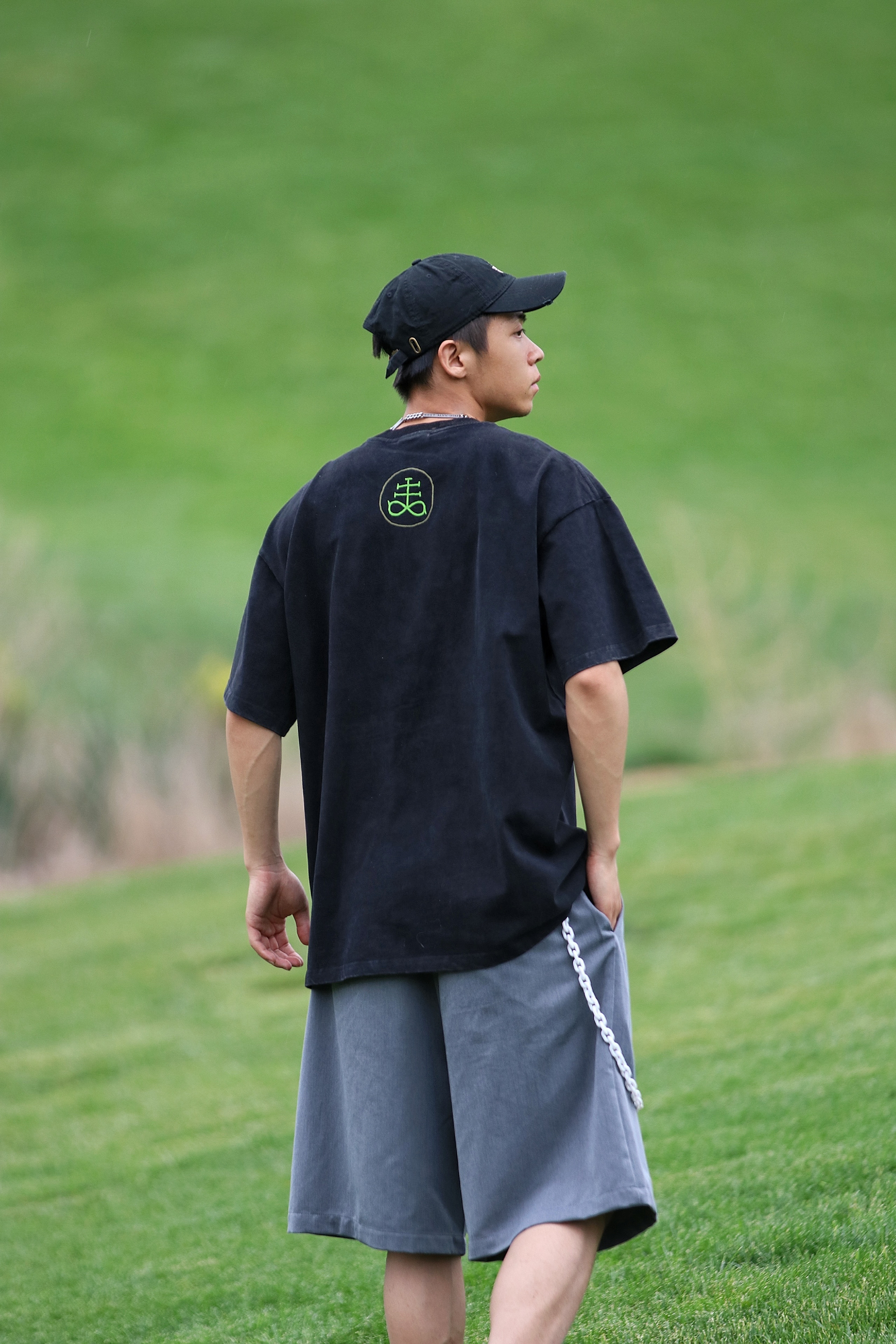 郭子单品分享 短袖: BIPOLAR 短裤:GLOWING STUDIO 挂饰:GLOWING STUDIO 鞋子: HOKA ONE ONE 短袖的胸口印花很有设计感的彩色涂鸦设计,所以下装就不要选择太过于鲜艳的颜色,灰色西装短裤是一个很好的过渡和压制,为了避免上衣太过于单调,腰包挂链是个不错的选择,再搭配黑色的鞋子,和上衣形成颜色呼应,整体感就出来了。