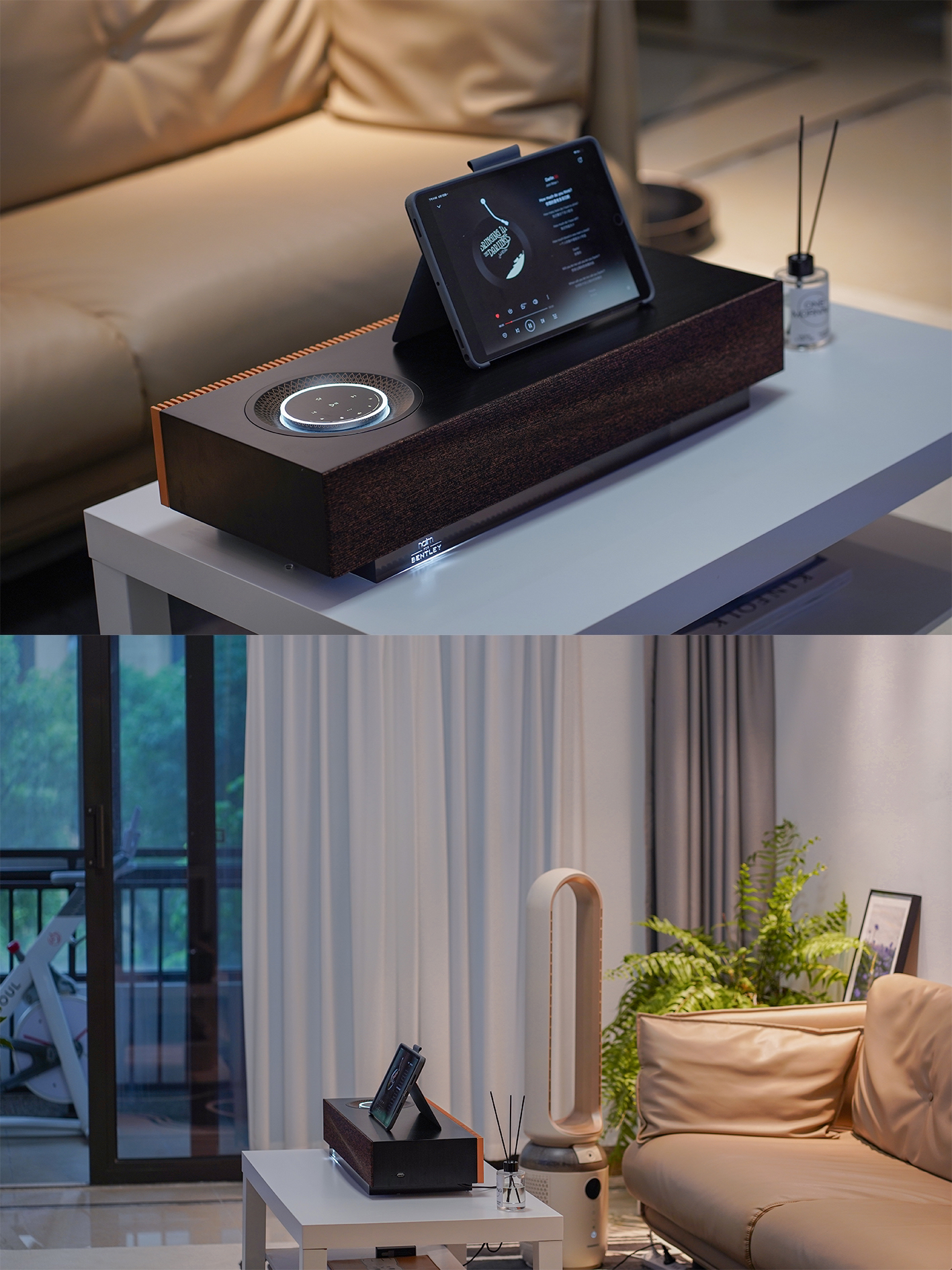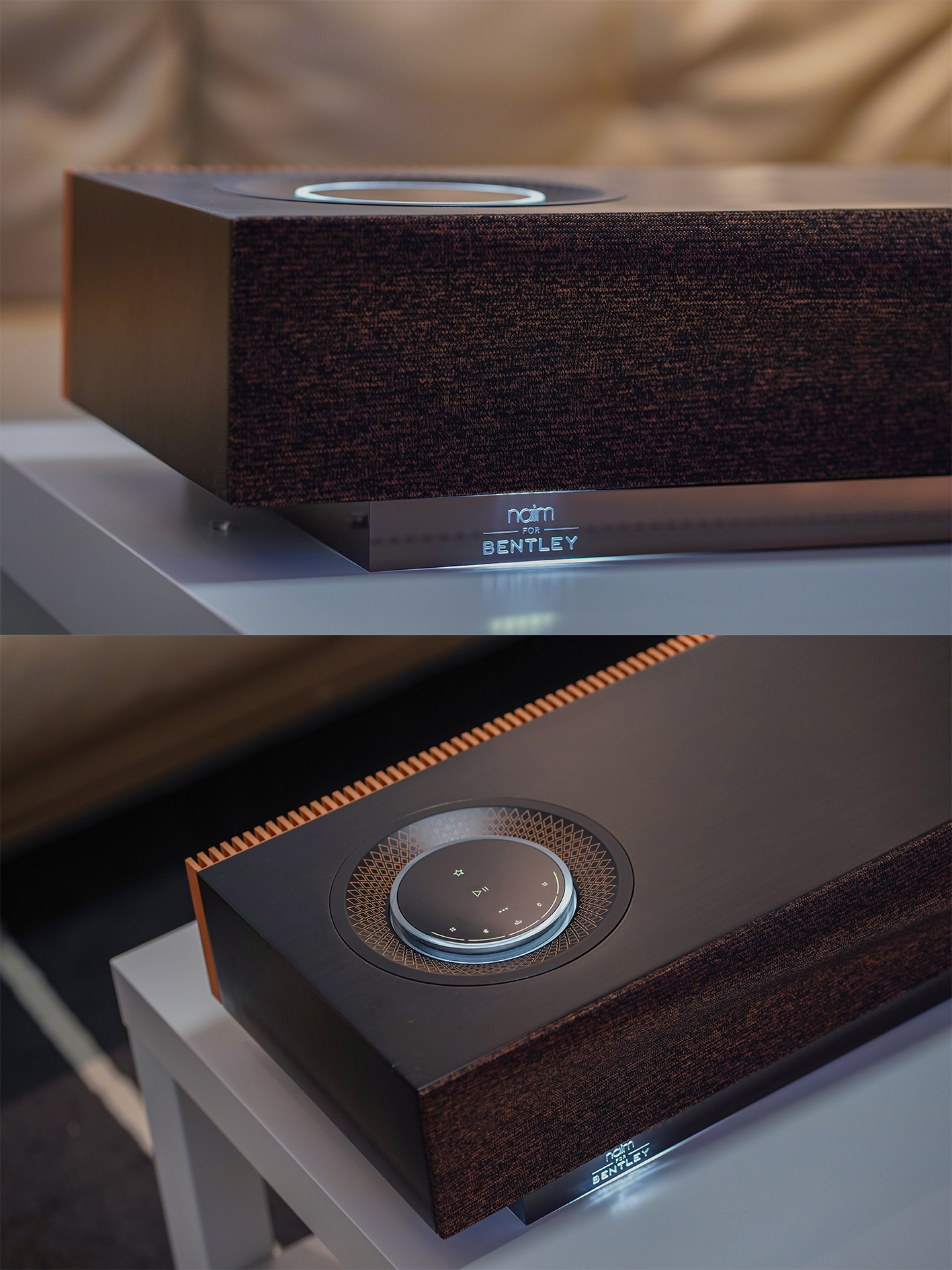宾利款Mu-so2,方正的身形、纤薄的机身,与品牌低调沉实的秉性一致,宾利版对比普通版,音响机身顶部换成了非洲阿尤斯树硬木制成,机顶的触控圆盘也添加了菱形的雕刻图案♣️,素雅却落落大方,简洁里又带着质感的精致。