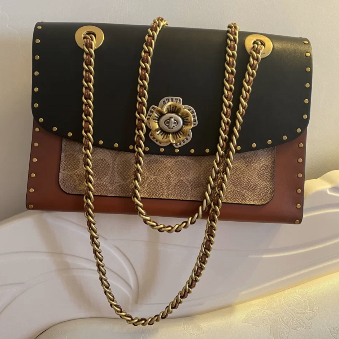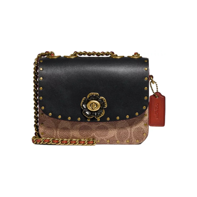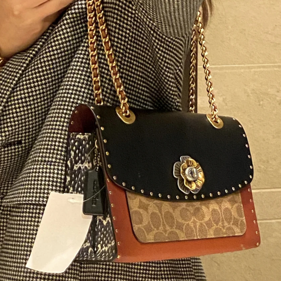 本篇笔记关联了Coach Madison 16 迷你 山茶花老花拼色小牛皮涂层铆钉翻盖链条帆布配皮旋锁扣件小方包单肩包斜挎包 黑棕色等商品,为用户提供真实的使用体验和购买参考。