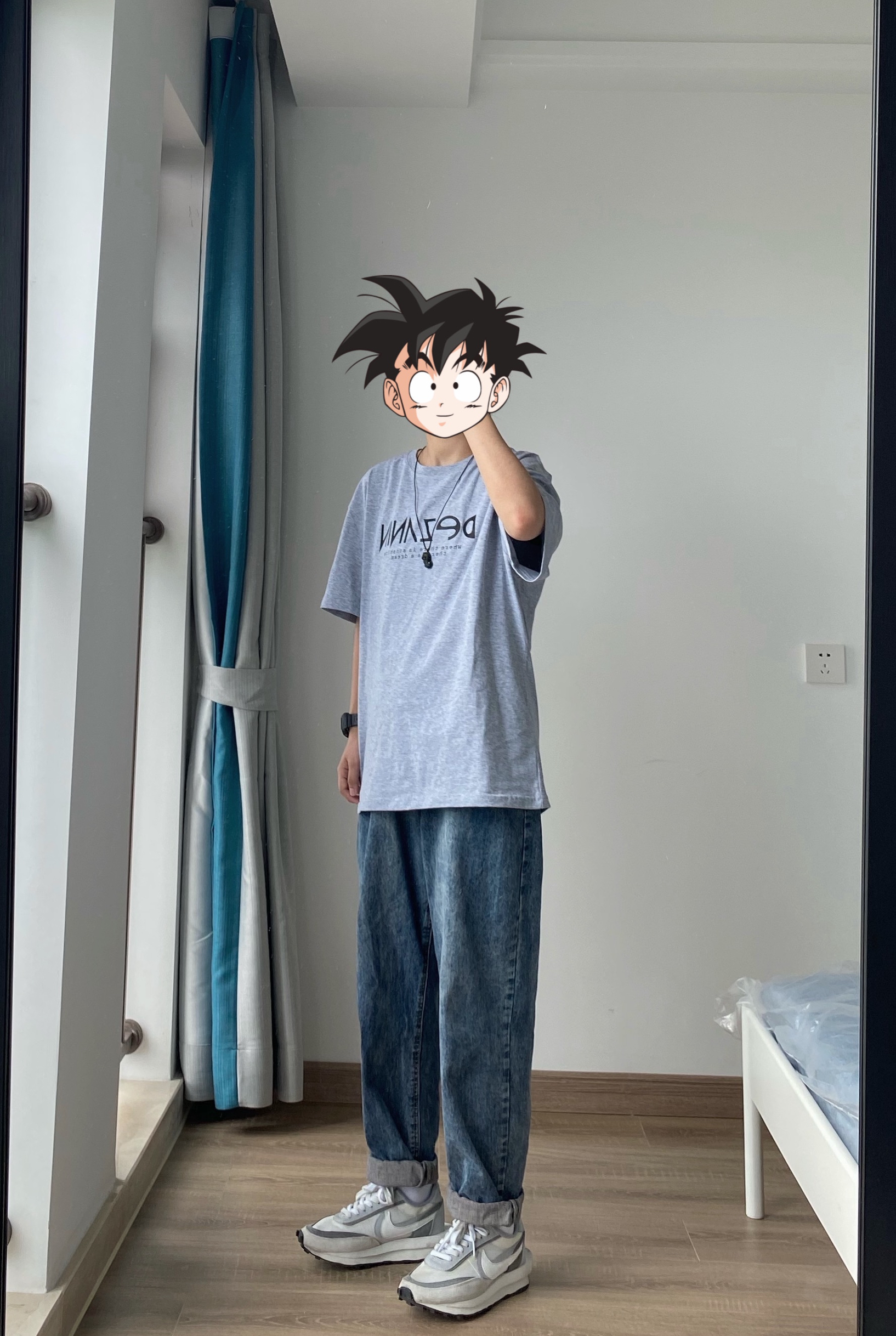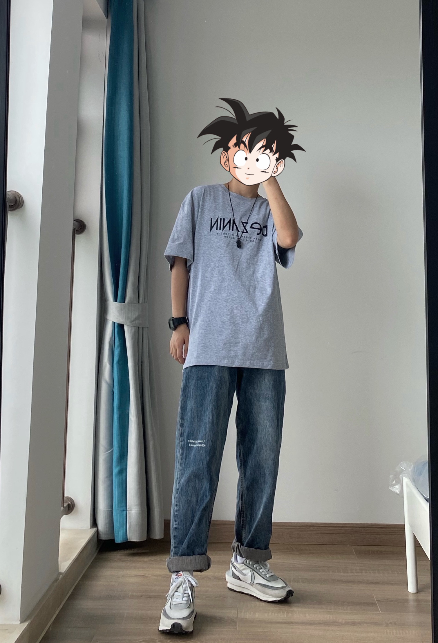 👖废克赛文水洗蓝色宽松牛仔裤 裤脚我挽了三层刚刚好 宽松版型的 👕DZN LAB灰色短袖T恤 薄薄的夏天穿很凉快 👟Nike x sacai联名 整体是灰色➕蓝色➕白色的风格 简约清新
