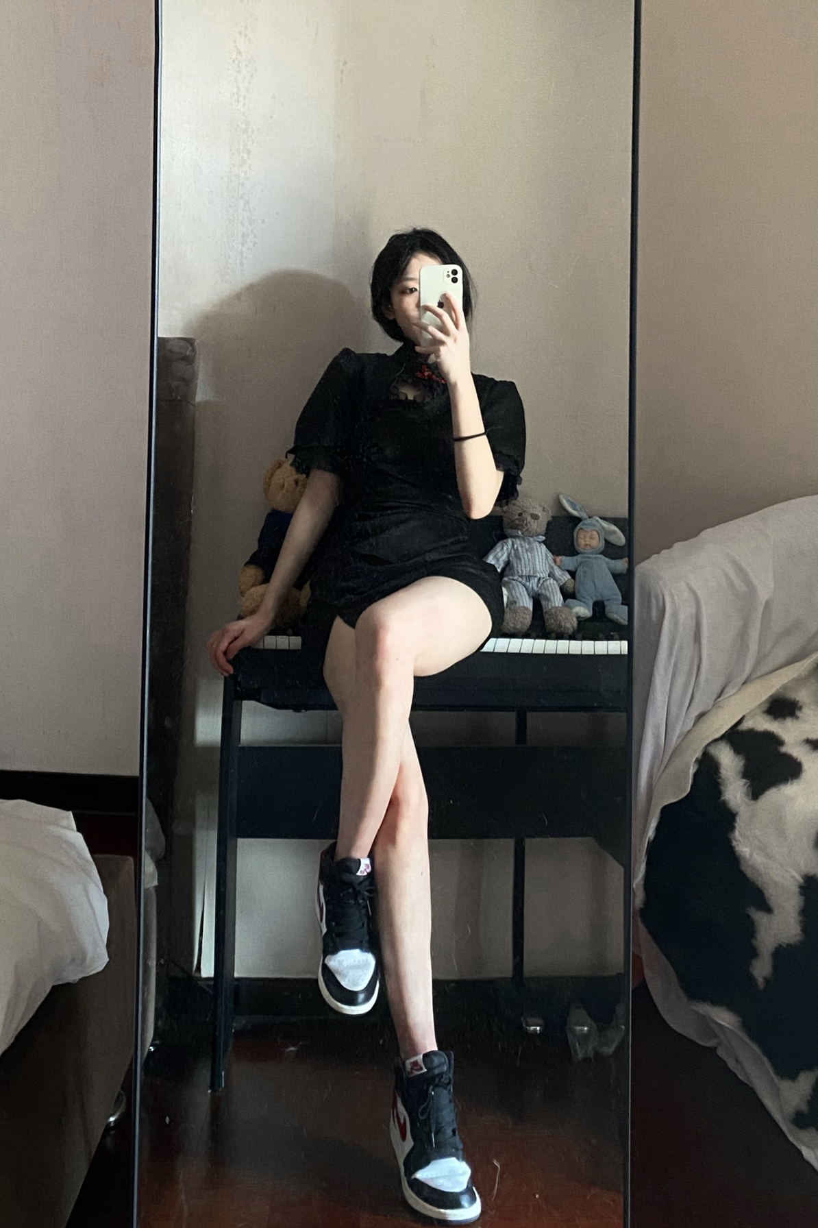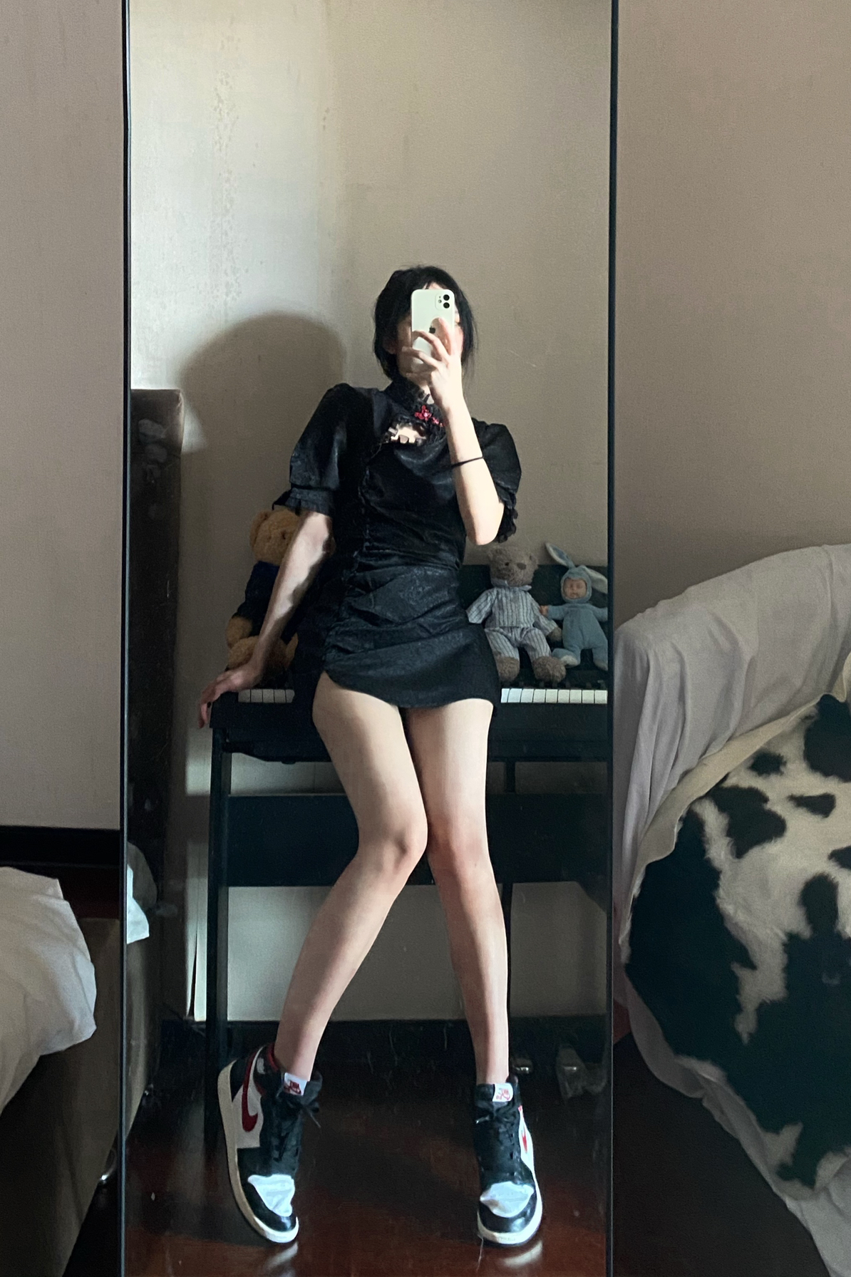 谁说穿旗袍就不能穿球鞋昂 黑色旗袍红色扣 黑色aj1红钩这样的呼应不绝吗!