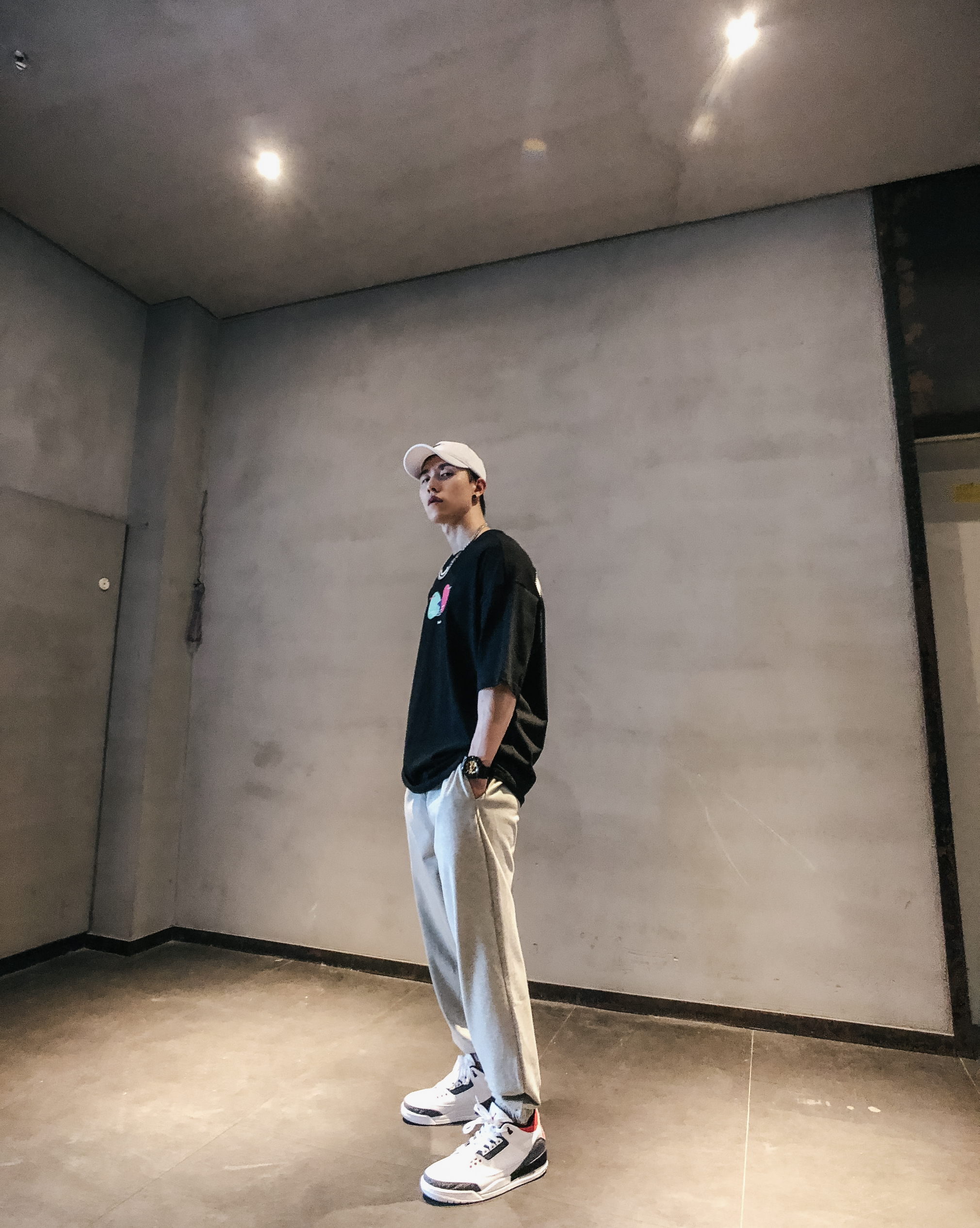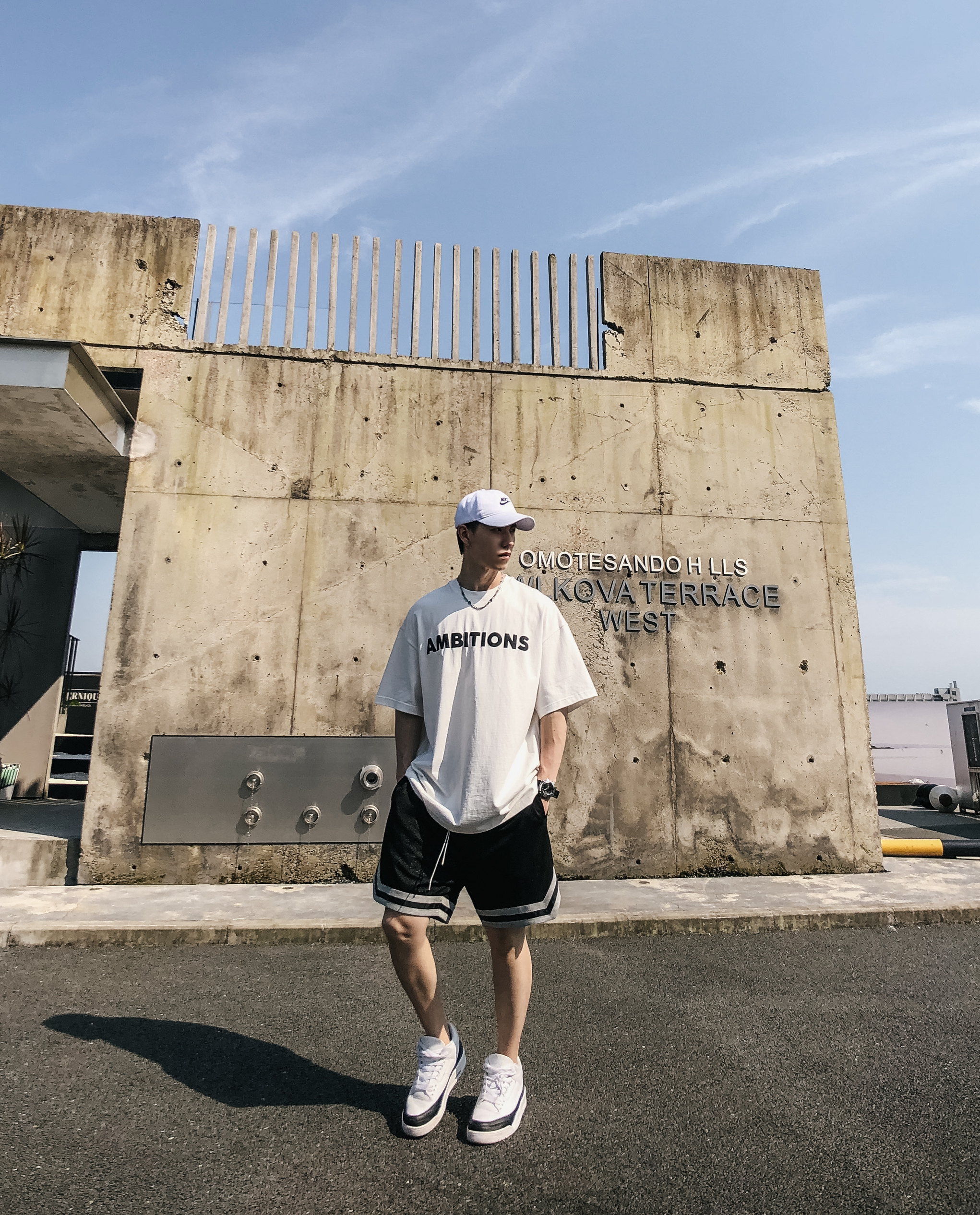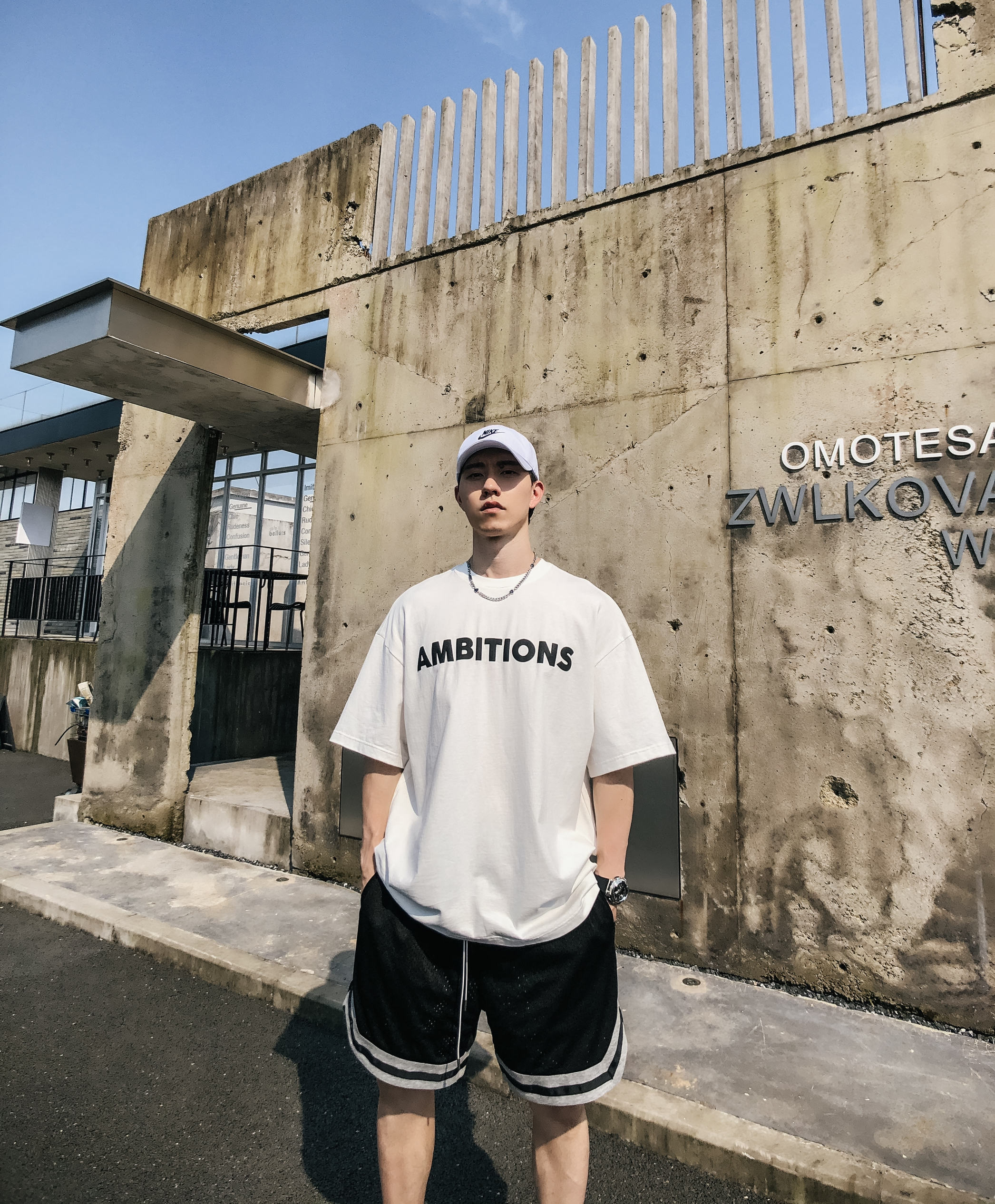 穿搭🉐🆒: 🌈T恤:版型很oversize ,100%精梳棉,舒适度到位,相当ok。 🌈短裤:双面穿 面料柔软,透气,舒服,爽。裤长膝盖以上,显腿长。 * 🧢帽子:nike * 💫项链:omt旗舰店 * ⌚手表:卡西欧 g shock * 👕上衣:哈林哥studio * 🩳裤子:哈林哥studio * 👟鞋子:aj3 藤原浩