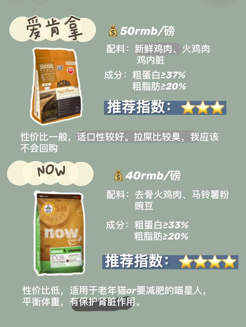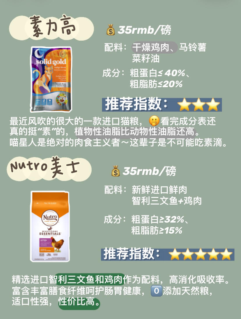 大家期待已久的进口猫粮测评终于来了!相信对新晋或资深铲屎官都会有帮助。 ✨✨✨ 我主要参考以下几项指标: 🔸配料中肉含量多最好,粗纤维素含量越少越好。 🔸详见图二 1⃣️ 素力高 |💰35rmb/磅 风吹的很大的进口猫粮,🤭看成分表还真的挺“素”的,植物性油脂比动物性油脂还高。喵星人是绝对的肉食主义者~ 🙇🏻配方和性价比方面都表现不错。就是豆类多,植物蛋白比重大。热量较高,容易发胖。...