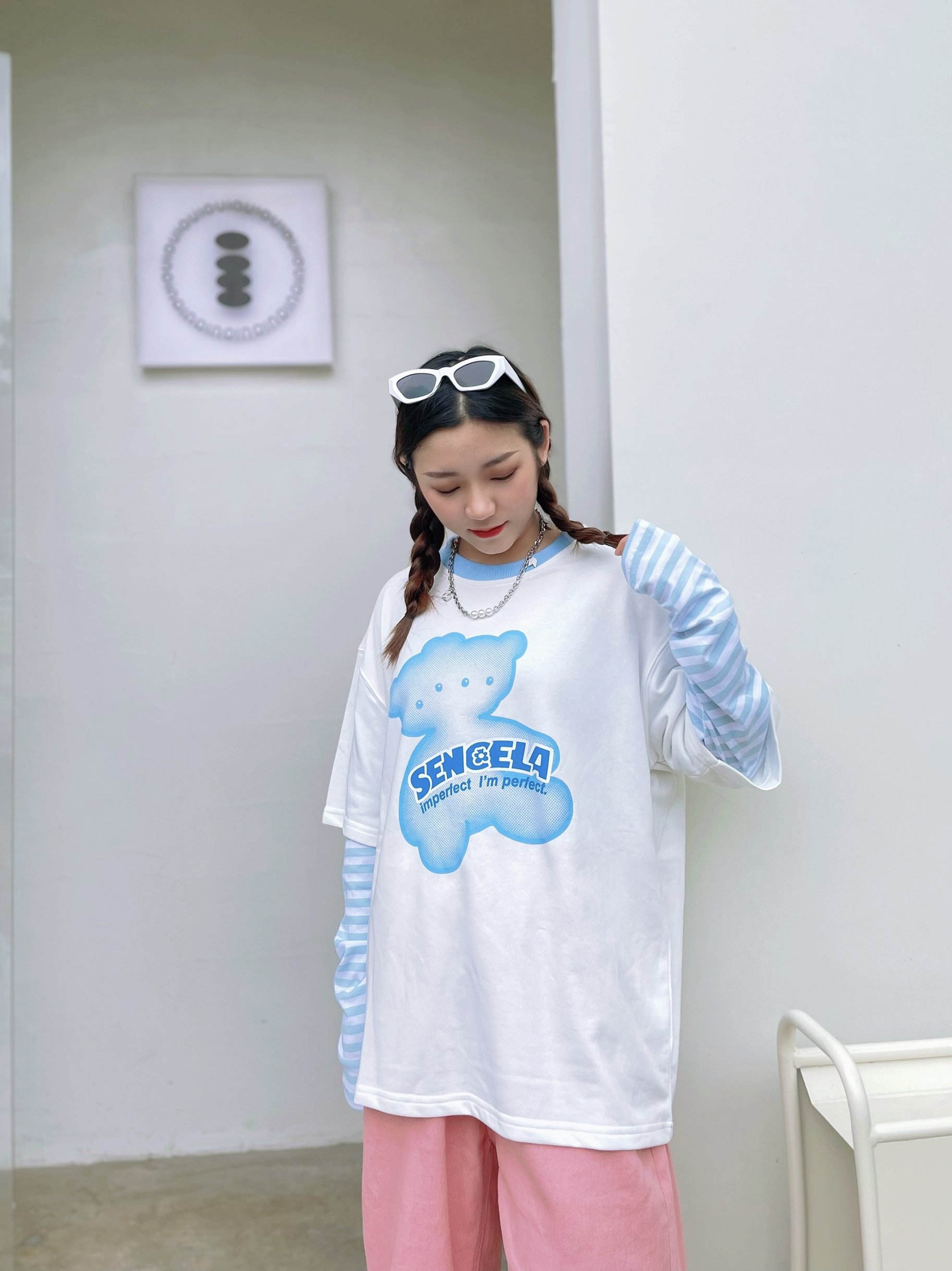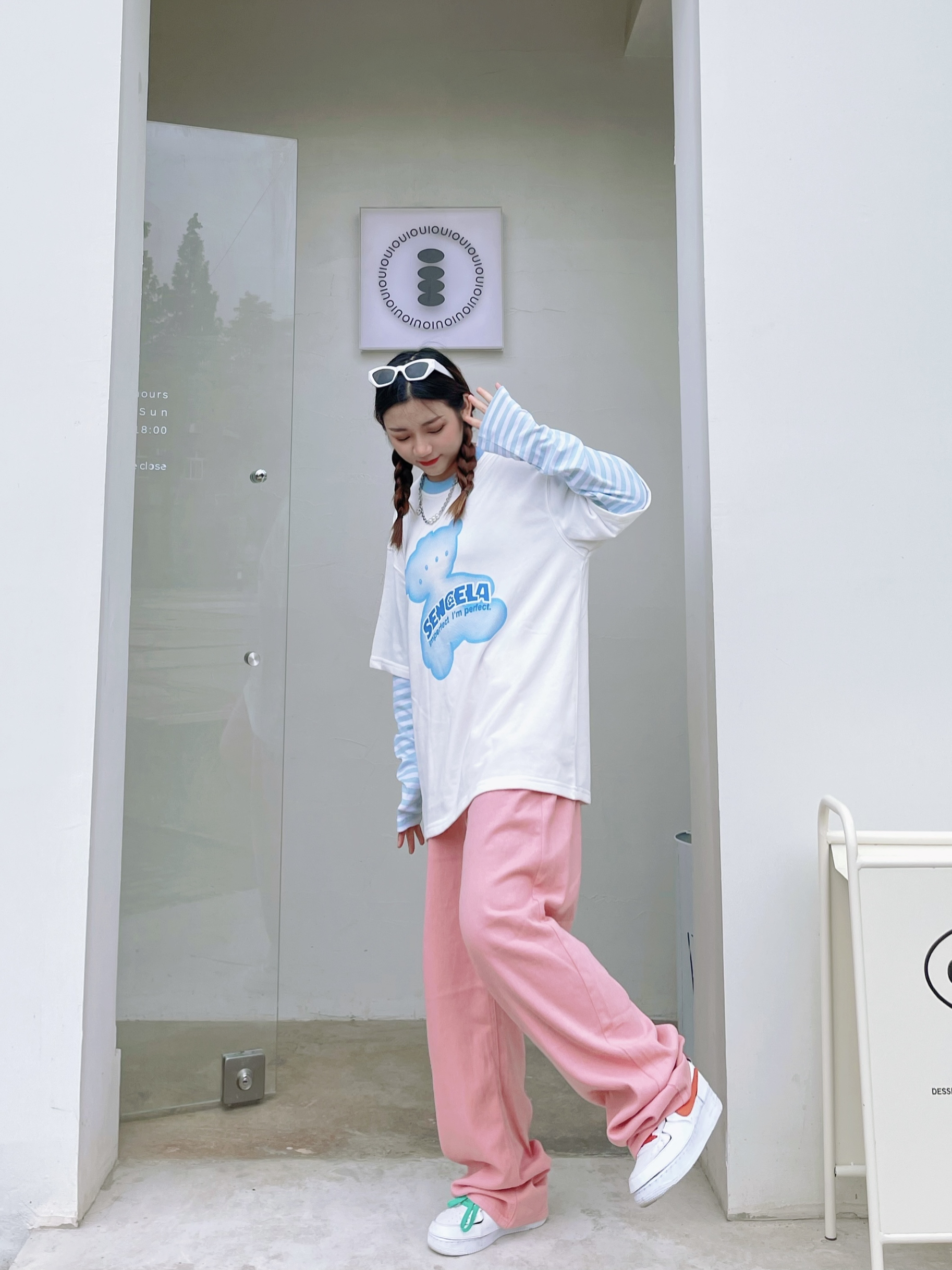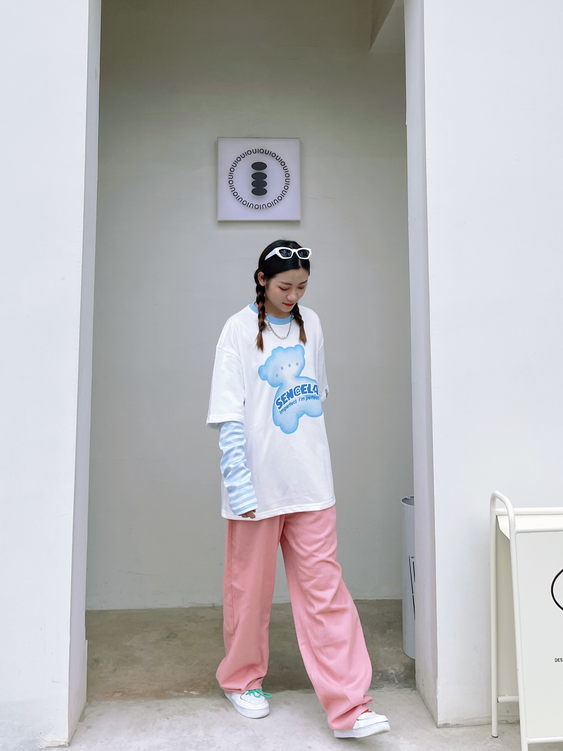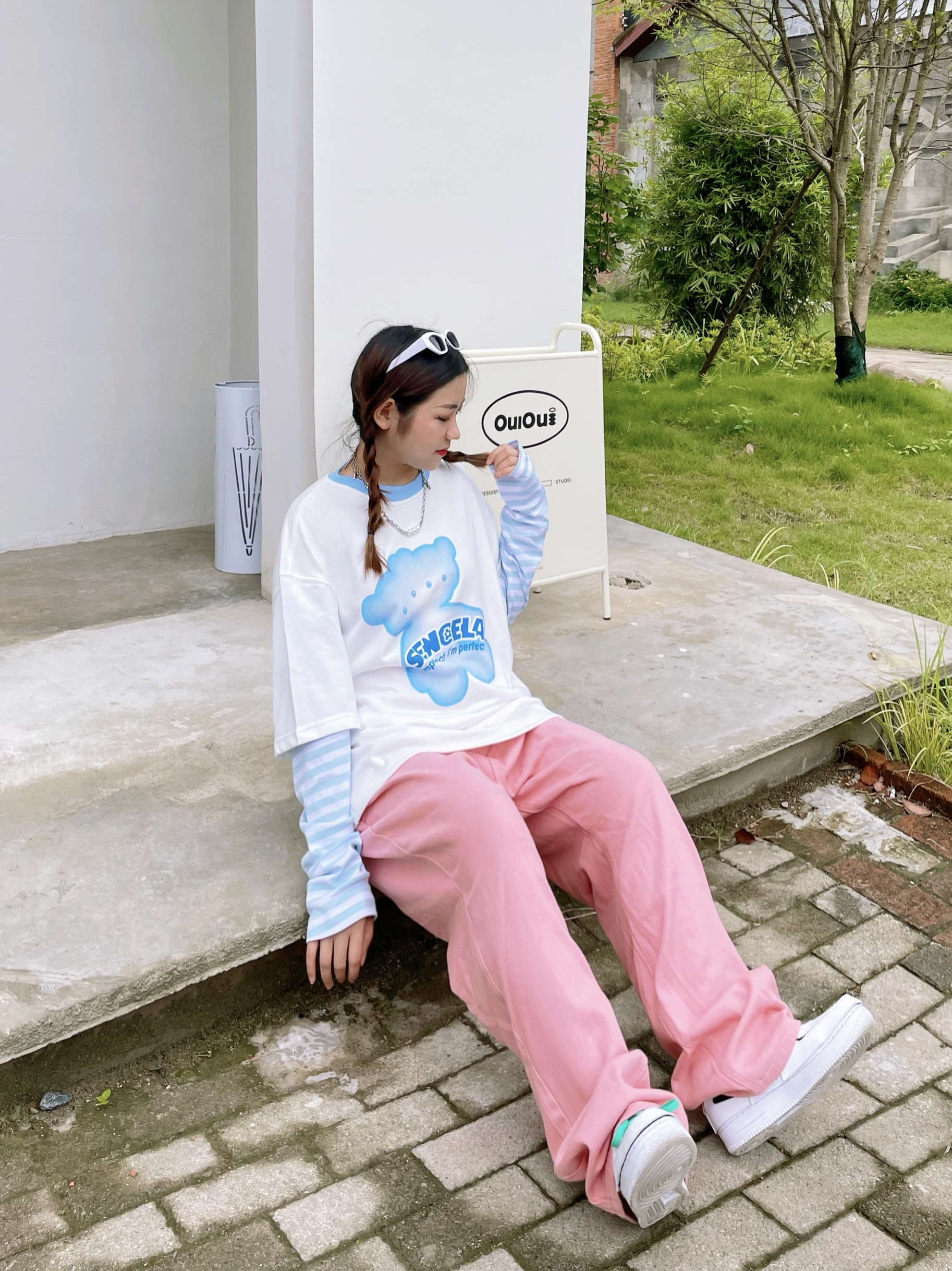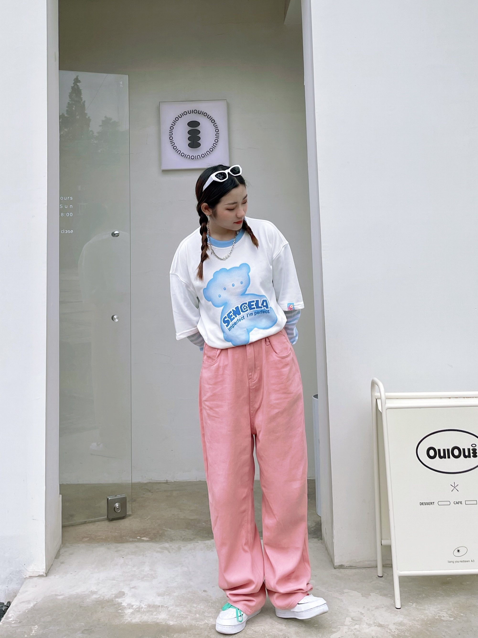 简单的T恤可爱的图案 假两件的设计也是很不错的哟 整个颜色搭配很舒服😌 宽松的版型很好搭配 小个子当然要搭配一条长裤 这样会拉伸整体比例 把衣服扎紧裤子显得腿更长哟 粉色可以搭配出撞色的感觉 重点是这个白色墨镜加分 还有一个珍珠项链可盐可甜 搭配一双可以随意DIY的AF1 根据自己喜欢来搭配鞋面 👔 #SENCELA 👖ZNZW旗舰店 👟 #NIKE 项链 #BABAMA