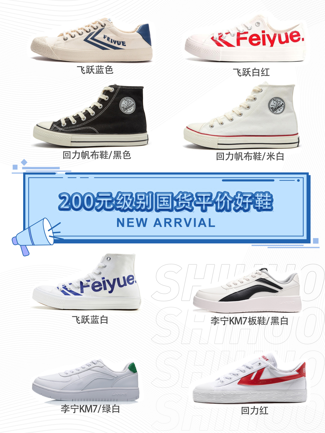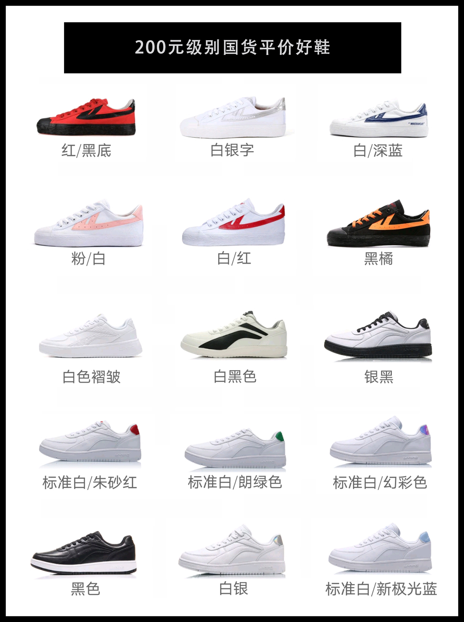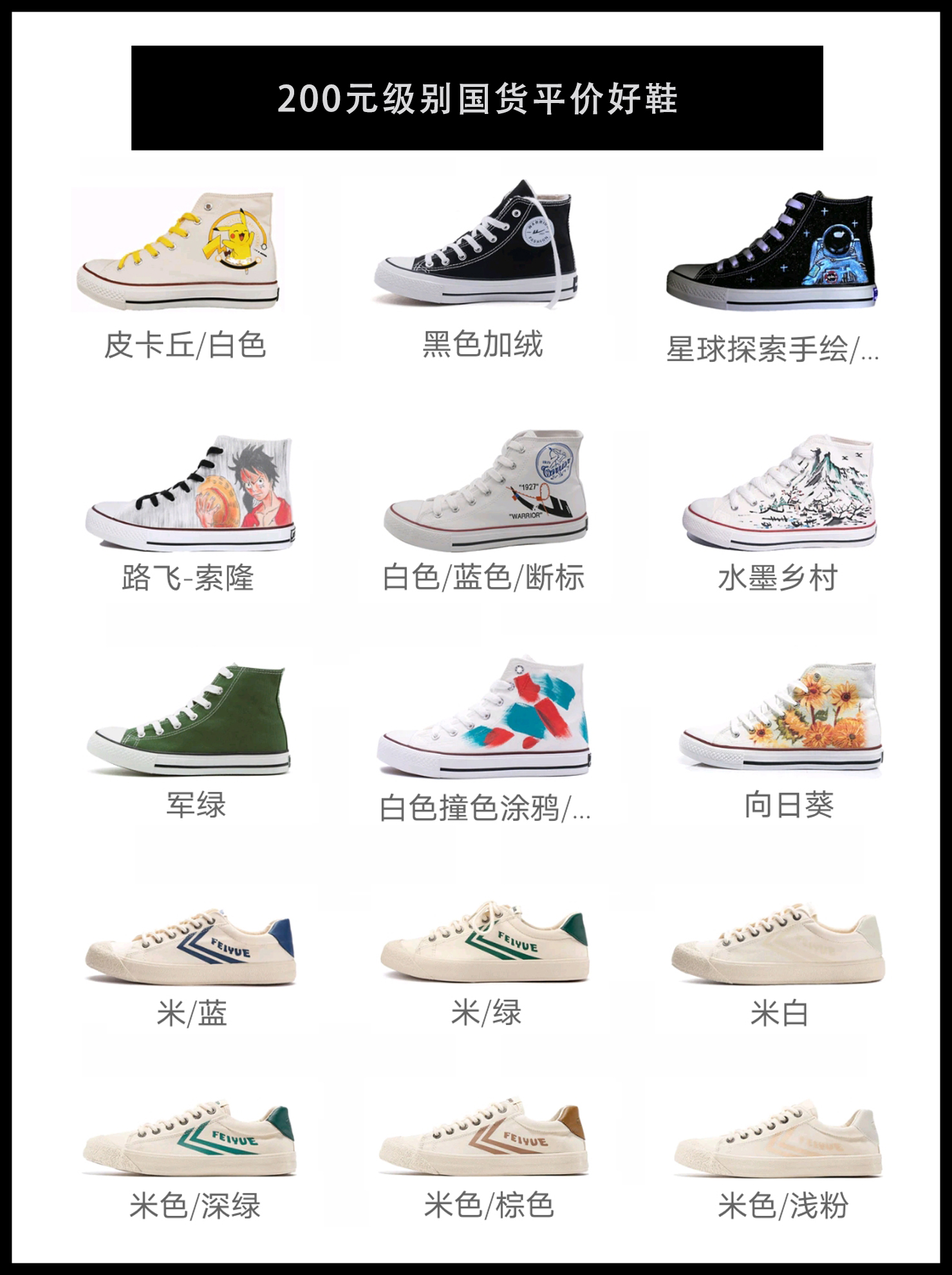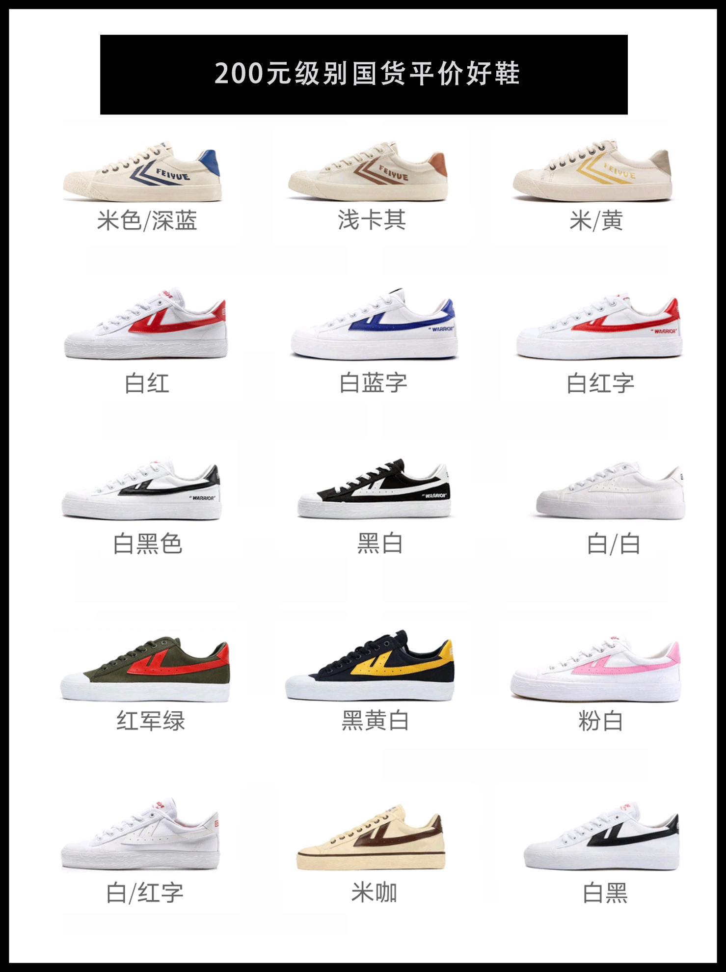酷暑来临,相信小伙伴们也迎来了漫长的暑假,炎炎夏日,为大家推荐以下200元内的国产评价好鞋! 回力帆布鞋:回力在80年代一直是国内帆布鞋和板鞋畅销的老大哥,平价又舒适,价格一直是低到所有人都可以消费得起,潮流的属性也是在鞋子上尽显。高低帮都可以选择,并且有特殊的鞋垫提供良好的脚感。简约百搭配色,清新文艺随意出街,橡胶鞋底,防滑耐磨! 飞跃帆布鞋:个性化的大字母印花LOGO,延续了飞跃鞋的经典鞋...