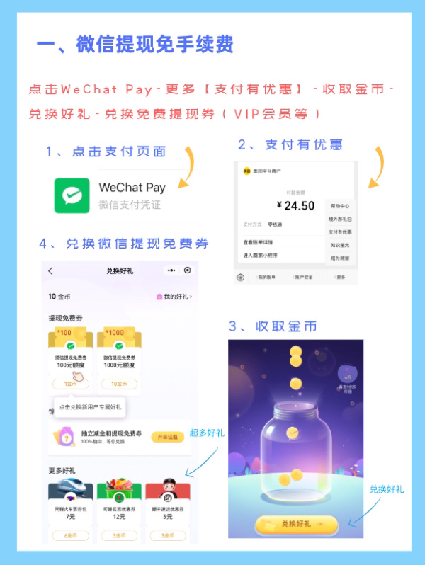 点击WeChat Pay-点击【更多】-点击【支付有优惠】-每日收取金币可以兑换好礼-最直接的可以领取【提现免费券】也有很多其他的优惠券哦~又一个省钱小技巧