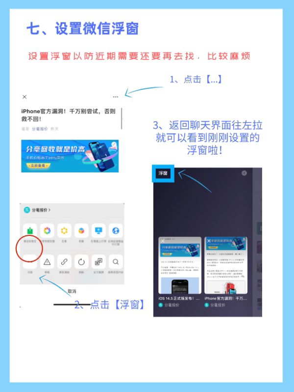 点击要设置的文章右上方的【…】-点击【浮窗】-返回聊天界面向右滑动就可以看到刚刚设置的浮窗内容,很快找到想要看的文章