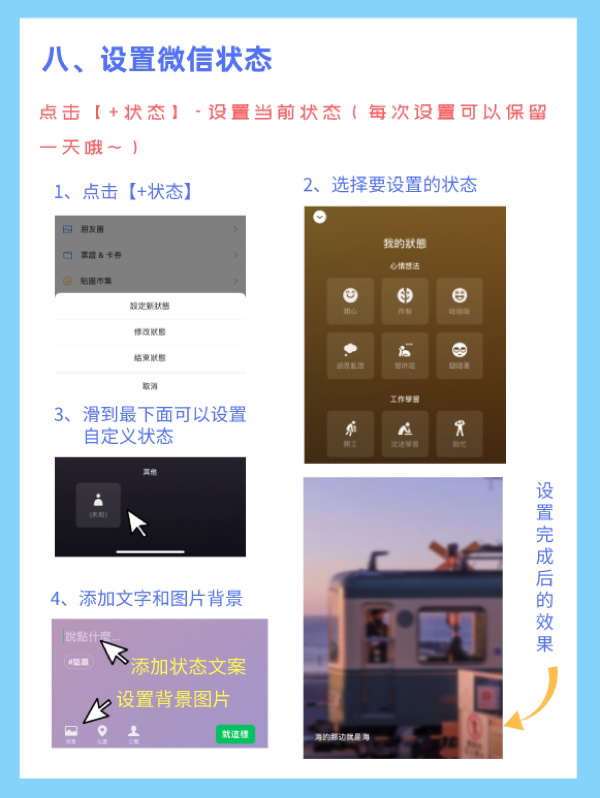 点击【我的】-➕状态-可以设置非常多的状态-下拉到最下面可以设置自定义状态(添加文案和图片背景)
