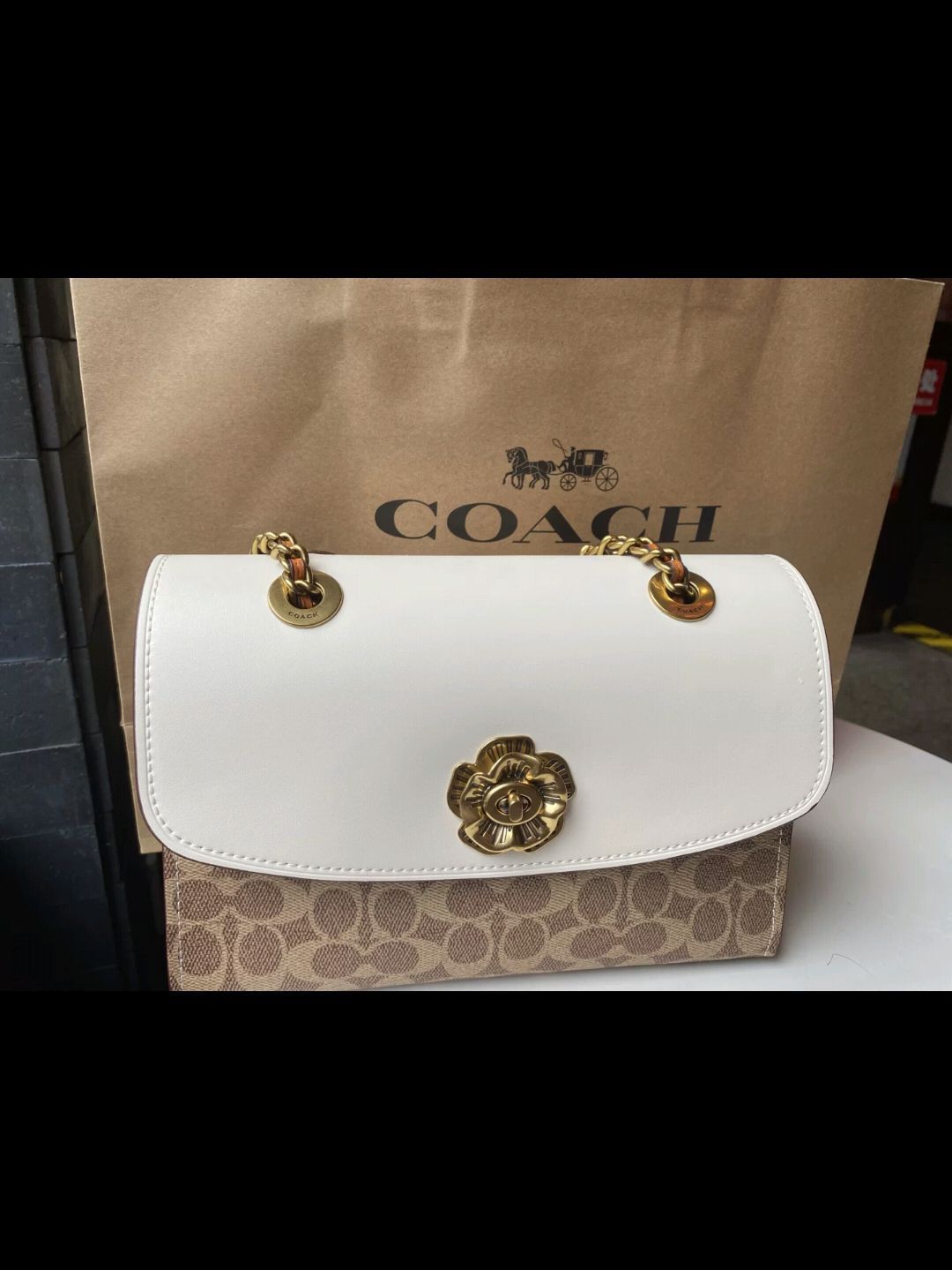 本篇笔记关联了Coach Parker 26 中号 山茶花老花满印涂层帆布配皮旋锁扣手提包链条单肩斜挎包 卡其配白色等商品,为用户提供真实的使用体验和购买参考。