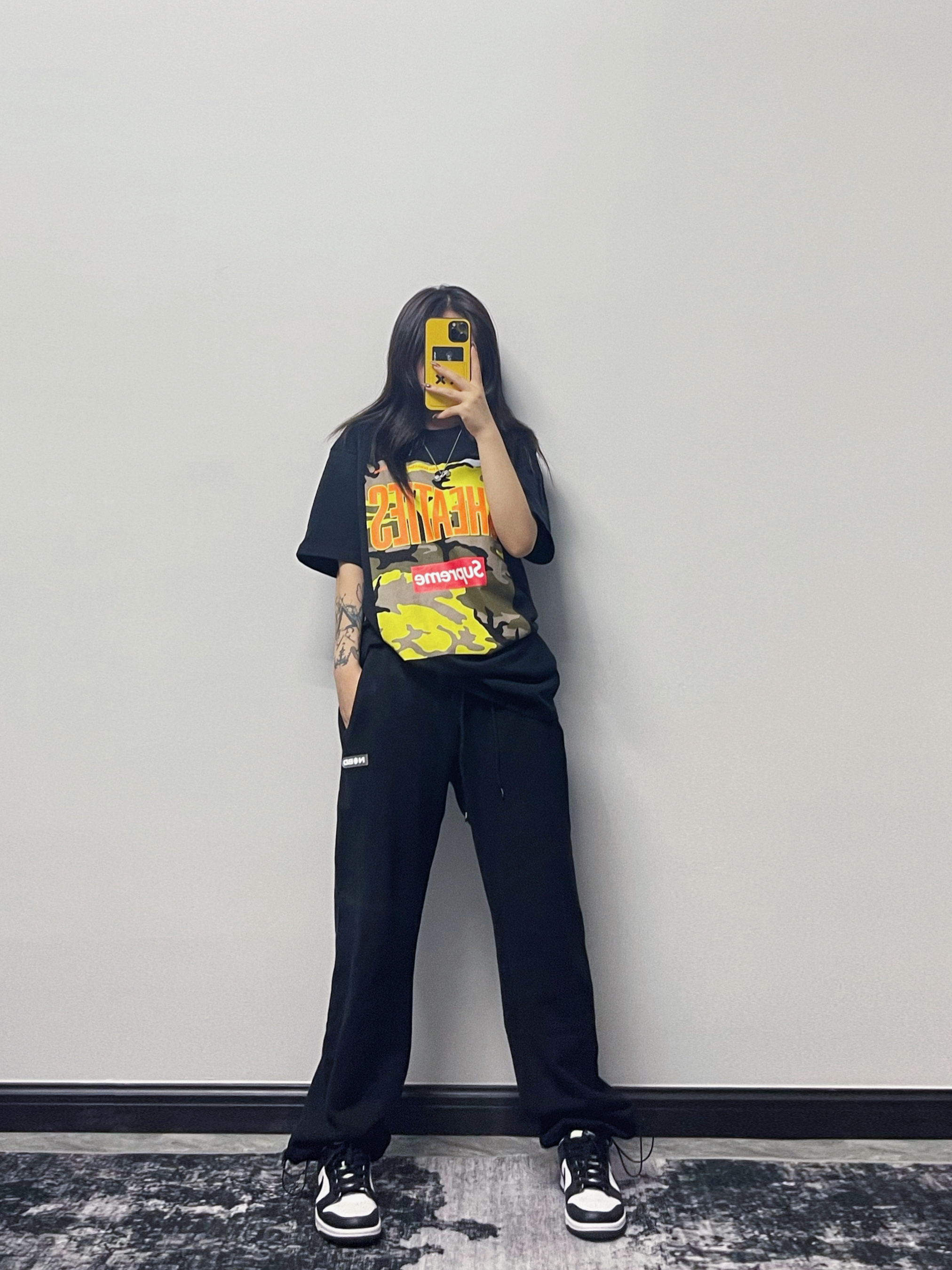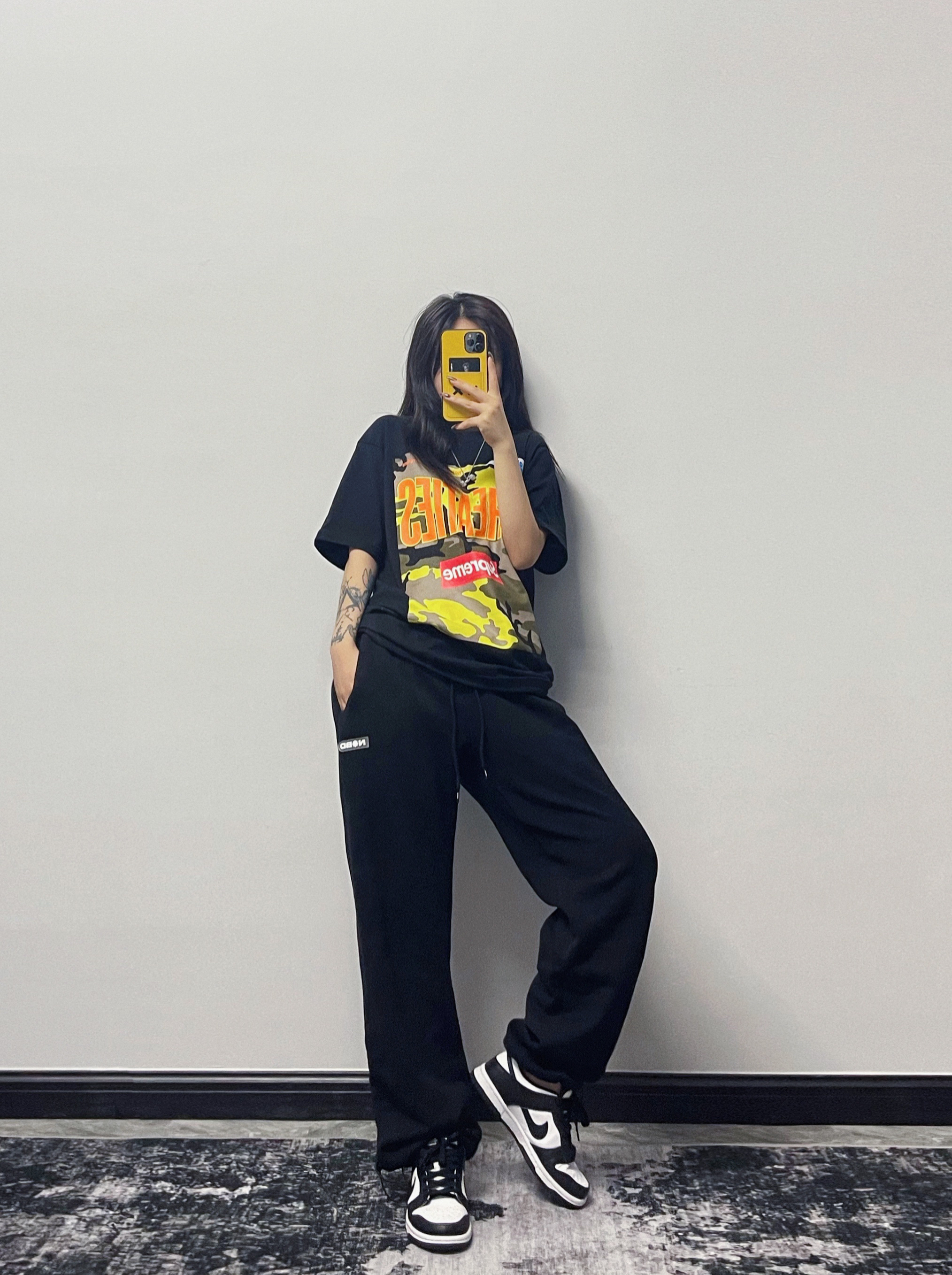 All Black才是yyds~~ 怎么穿都不会出错的黑色😎 日常出gai,上学,出去玩耍都🉑️~ 短袖:Supreme 裤子:NOBD 鞋子:Nike Dunk Low 项链:RAWNESS