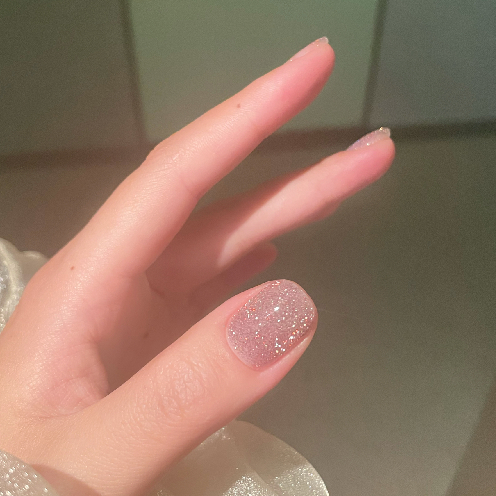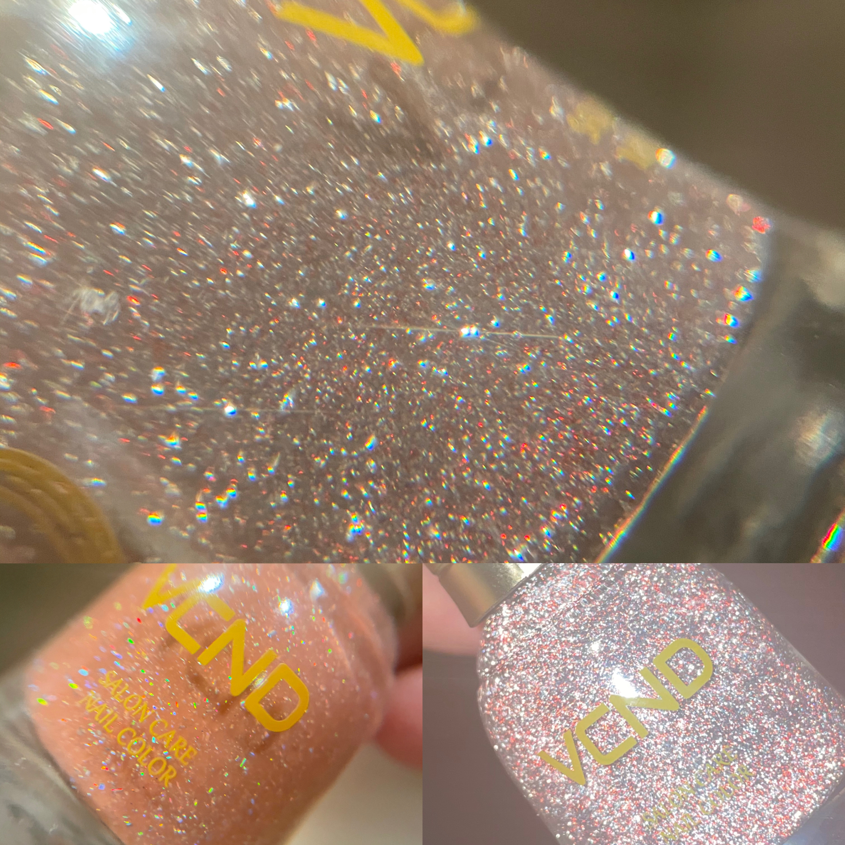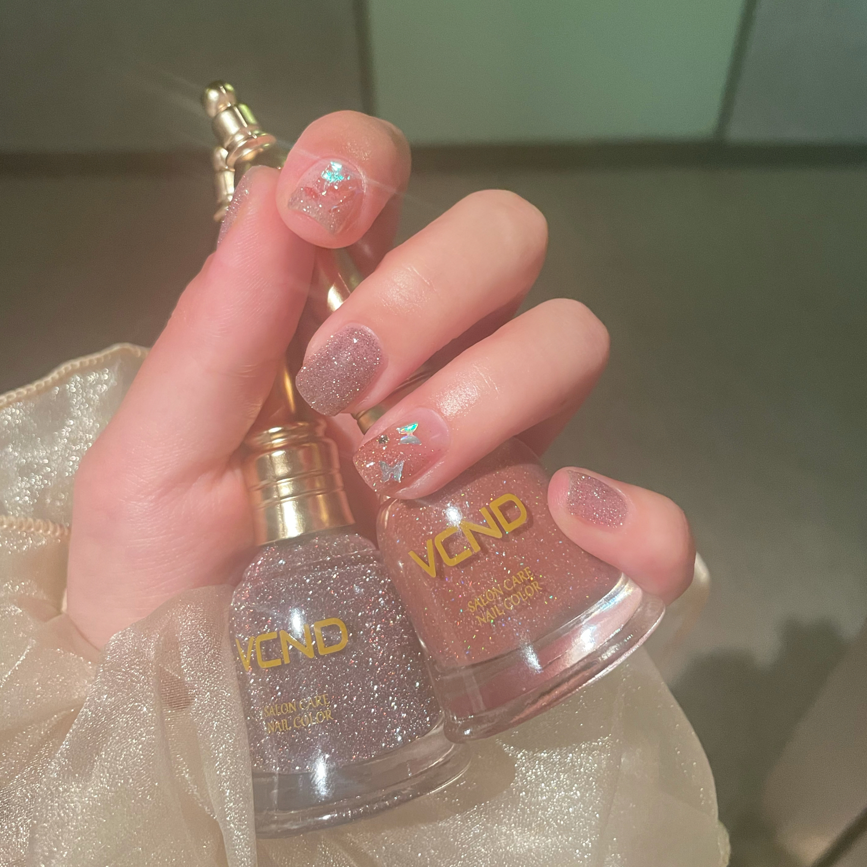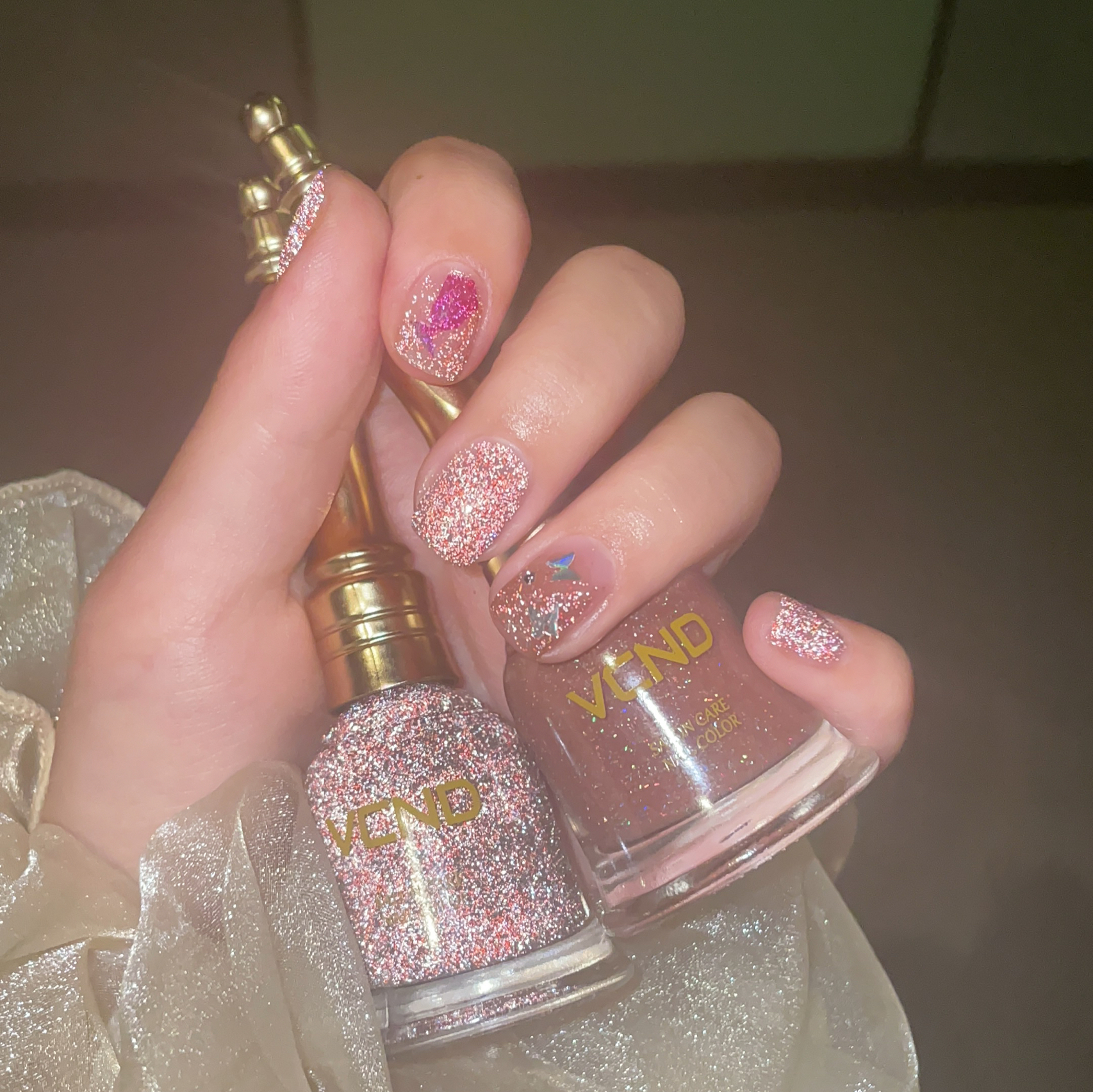 嗨喽呀宝宝们 今天给大家更新一款超级适合蹦迪的美甲 超级闪亮✨ 食指搭配了玻璃纸 不得不说碎钻和玻璃纸绝配呀 无名指做了小渐变 显得超级温柔 整手就是又A又甜🍓 用到的指甲油 VCND小铃铛 1⃣️E12流星罐头 2⃣️D15月亮与六便士 我真的好爱他们的包装 很高级的感觉 满满的宫廷风 ⚠️图片食指一遍效果 无名指一遍渐变效果 其余手指四遍效果 指甲油为水性指甲油