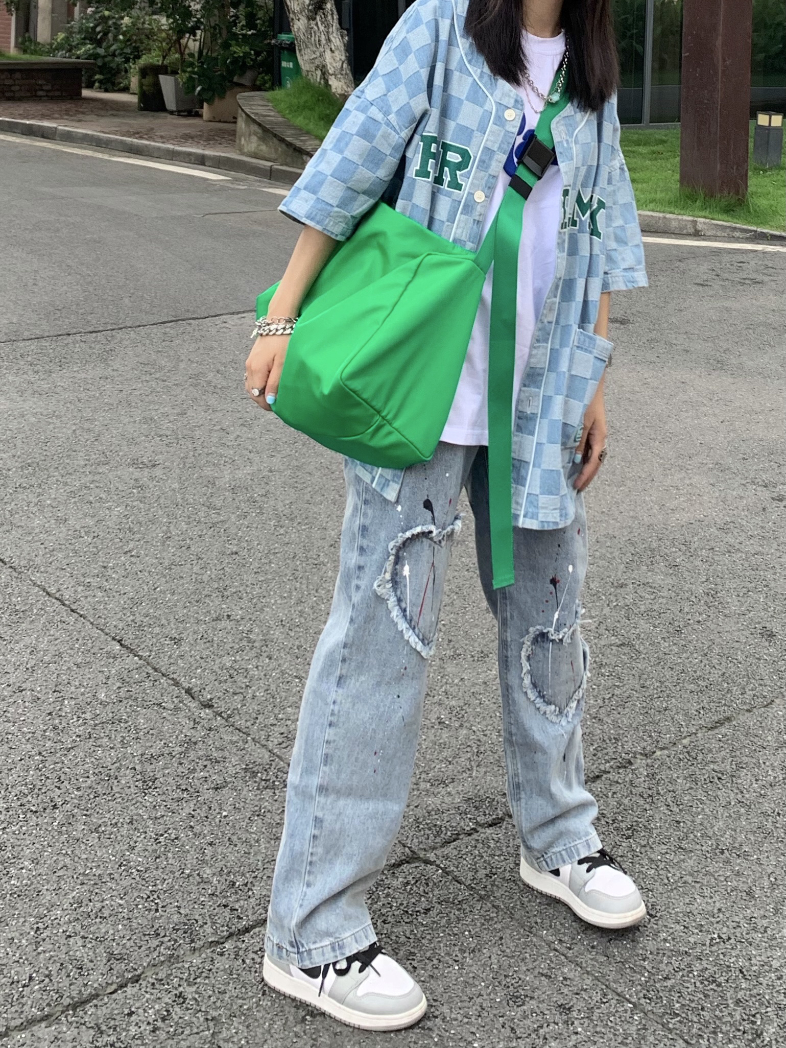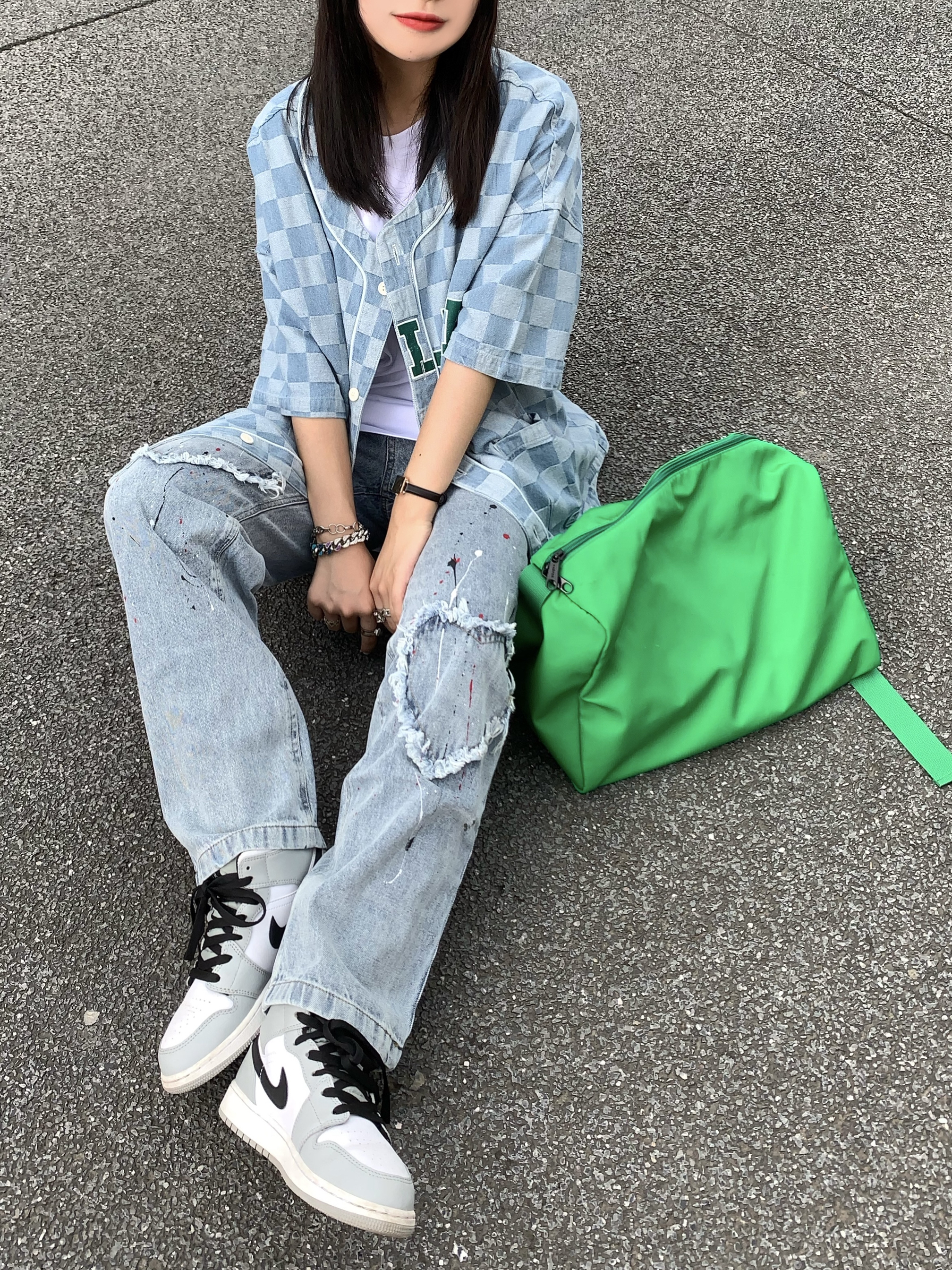 - 这双AJ1烟灰也太高级了8😜配色真的蛮高级的 挺适合女神们🧚♀️可甜可盐得我心水 这双可评为我坠爱的球鞋之一 😊 - ▪️牛仔格子外套:frlmk(m) 超好看的格子外套 很国潮风哦 酷妹甜妹都可以驾驭😁 ▪️泼墨爱心牛仔裤:frlmk 垂感很棒的裤裤哦 贴布爱心的设计更有层次哦 ▪️鞋子:aj1 烟灰 小dior ▪️绿色挎包:vaoper 小众的牌子 背着很时尚 这个绿色真的很醒目! ▪...