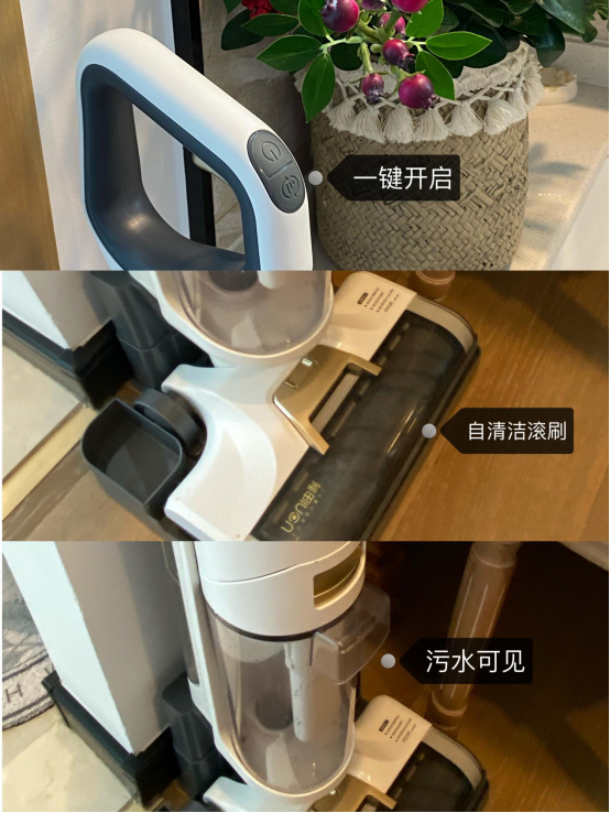 地毯和硬地板都是可以使用的,手柄上的按钮是一键开启工作,不小心打翻的泡面也可以直接清洁了~ 吸垃圾的同时也在拖地,污水箱和净水箱是分开的,每次打扫完把污水箱倒了用清水冲一下就好了。滚刷的话也不用麻烦的拆下来,它有个功能是可以自清洁的,太适合我这种懒人啦~