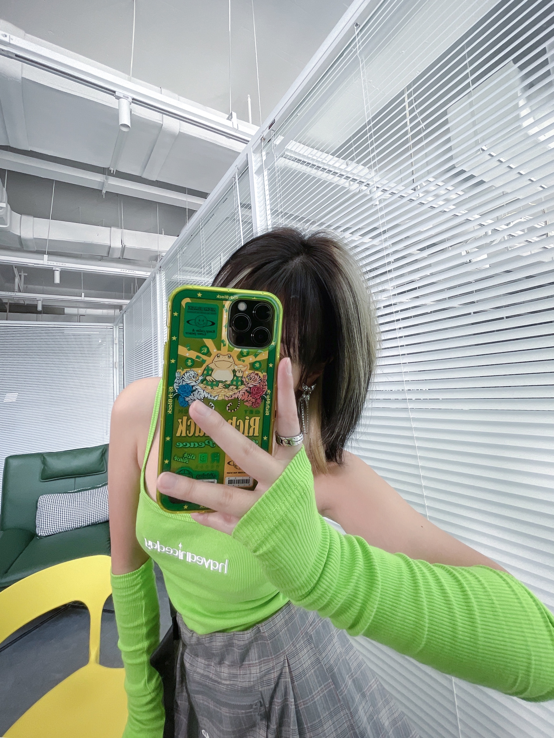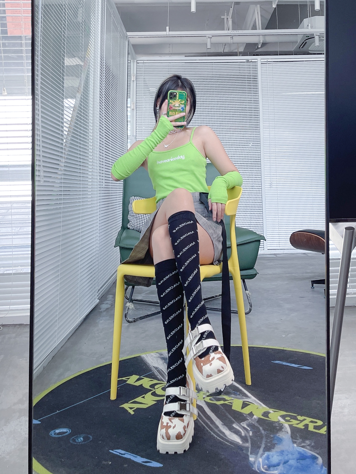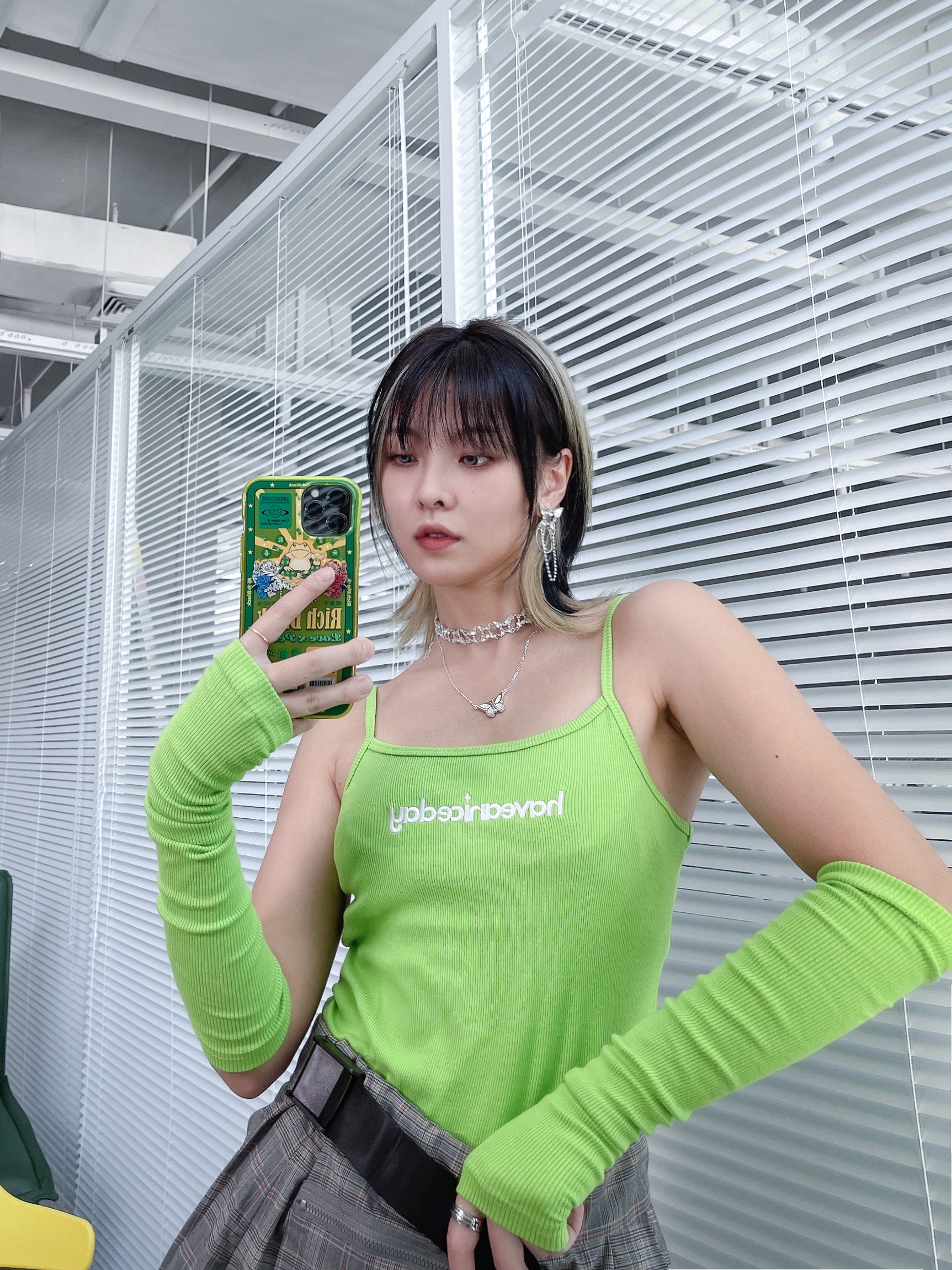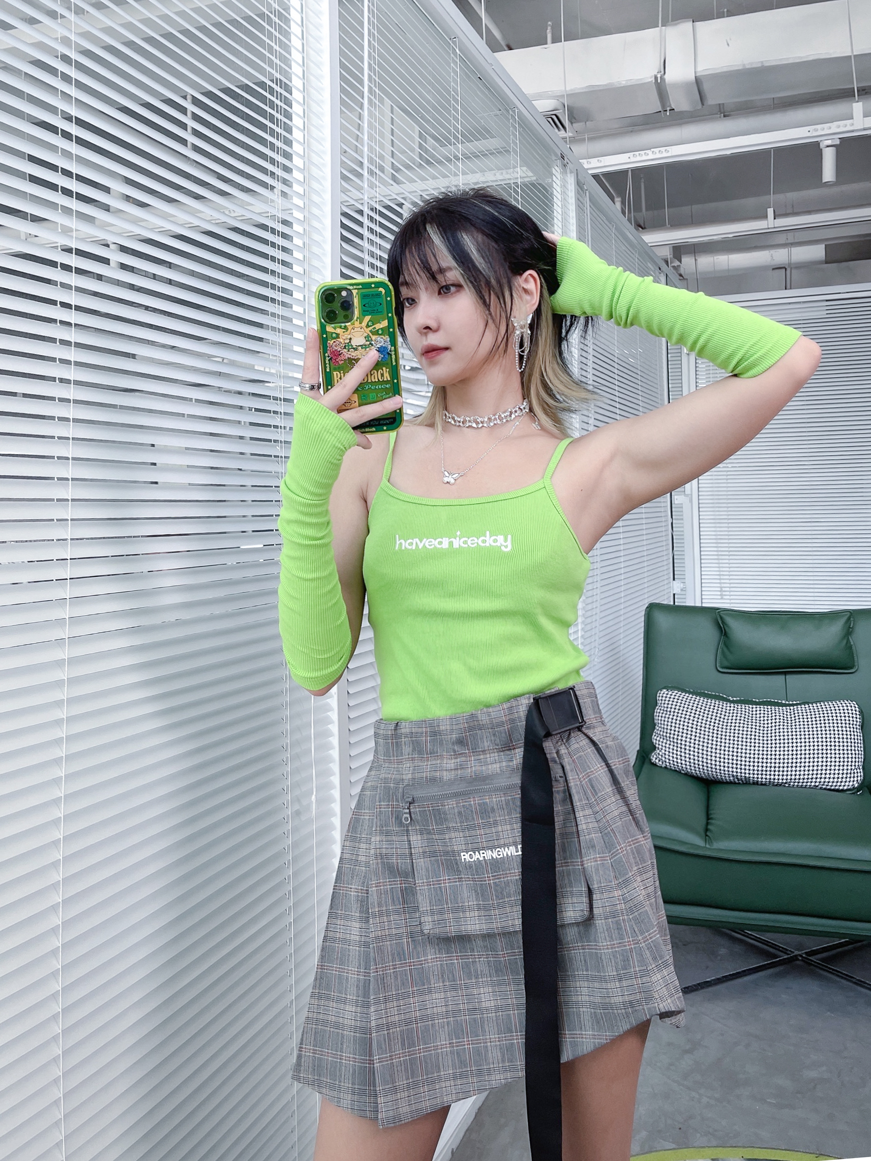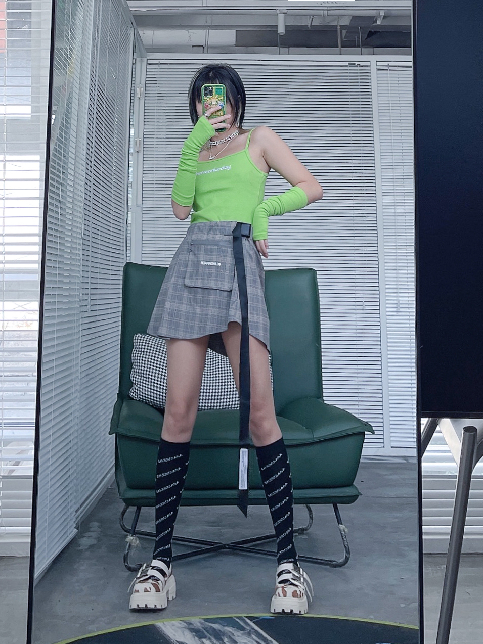 三坑少女的三次元穿搭,也绝对是必须要很有个性的! 颜色一定要跳!必须是绿绿最爱的绿色! 这套我买回家的时候,我妈以为我想开了要给家里做个卫生!打扰了!袖套可是很潮的好吗!夏天防晒又好看,超帅没话说!搭配技能风小裙子感觉亚的又很日常!! 亚文化女孩得鞋子肯定也不是普通的球鞋,怎么帅怎么来,增高5厘米不是问题!