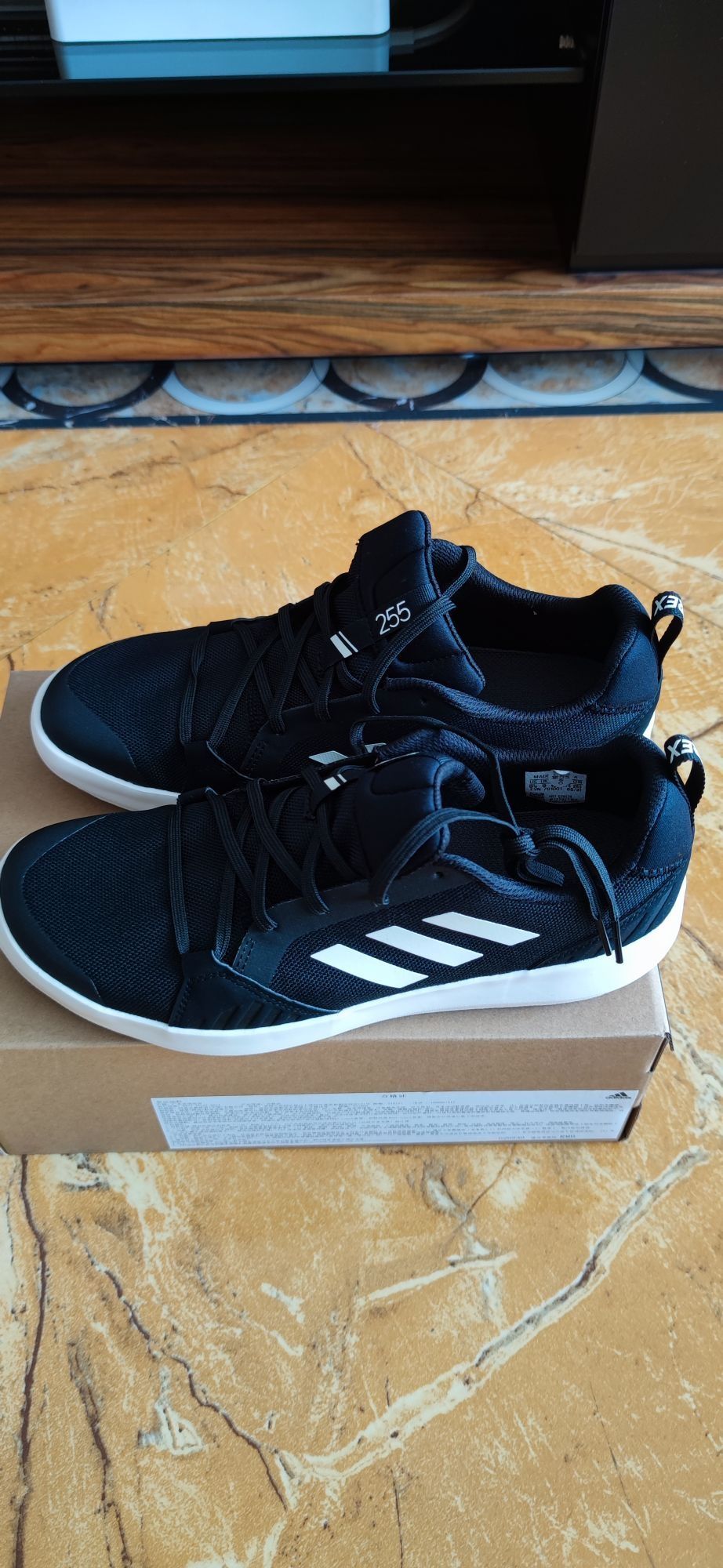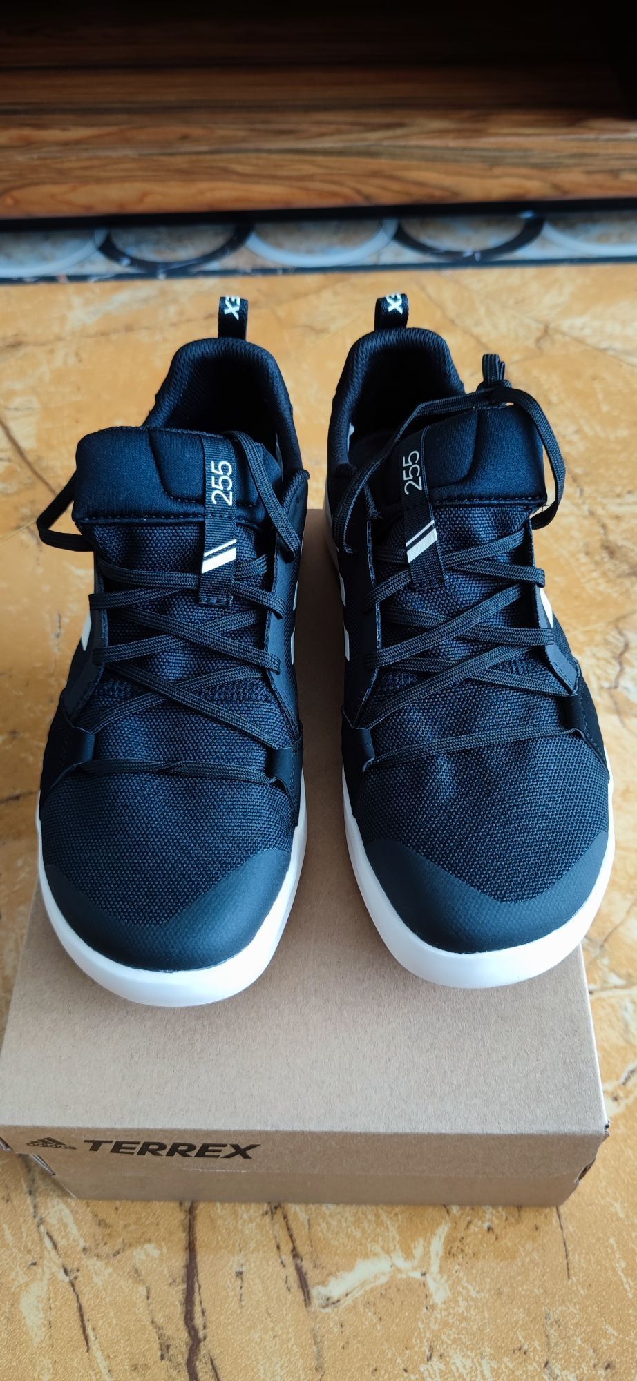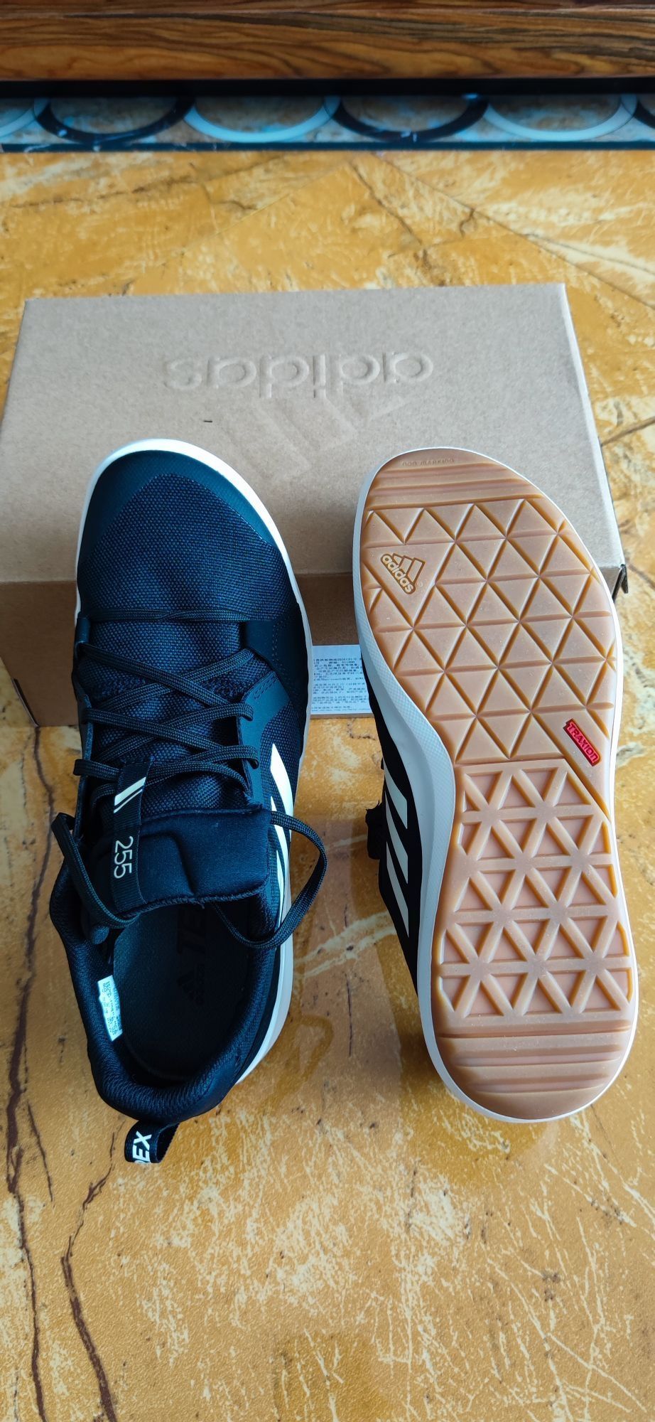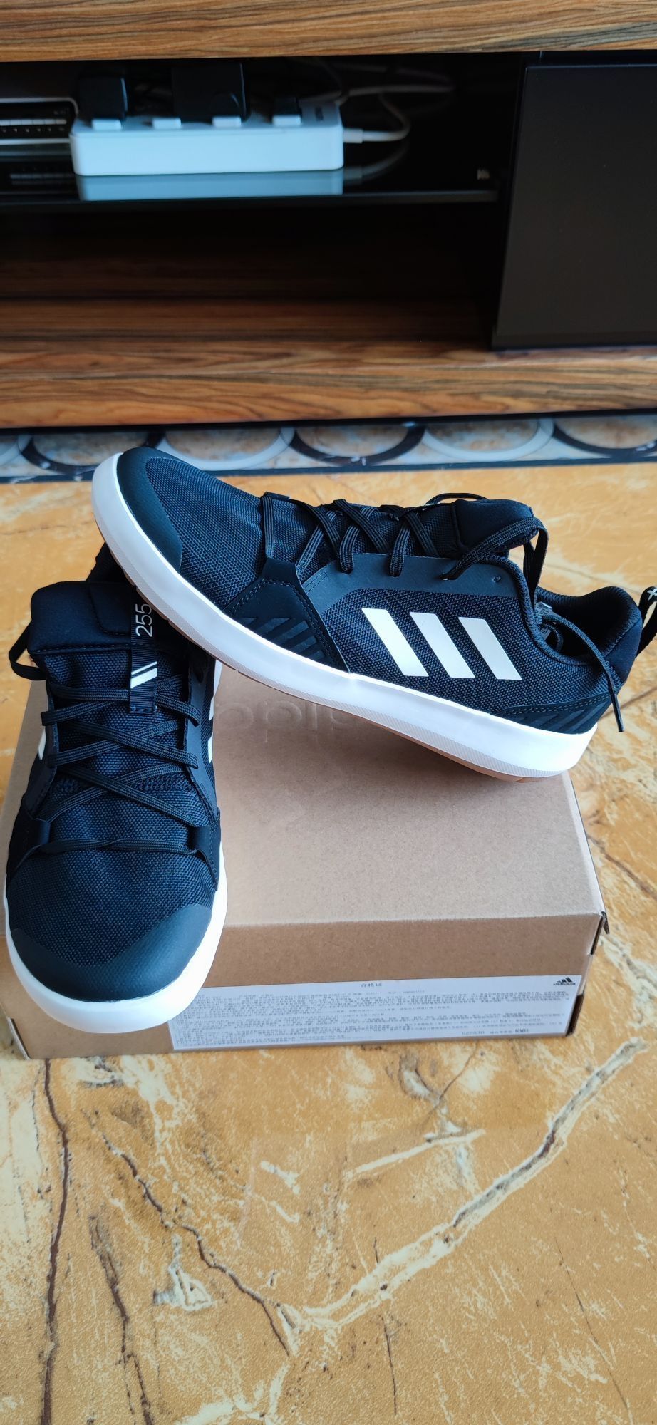 👟球鞋名称:Adidas Terrex Boat Lace Dlx 黑白 🔍设计亮点:简单明了 ⛹️实战感受(缓震/包裹/抓地力):上脚很舒服,很不错 📃总结评价:一双散步的鞋子