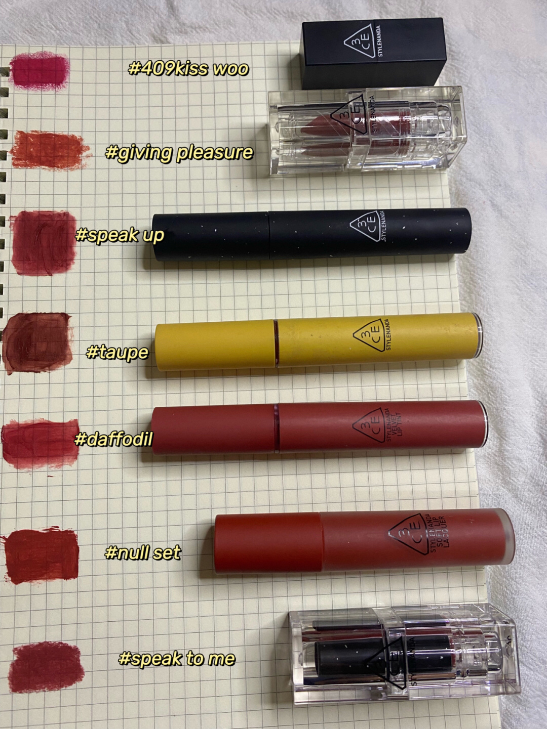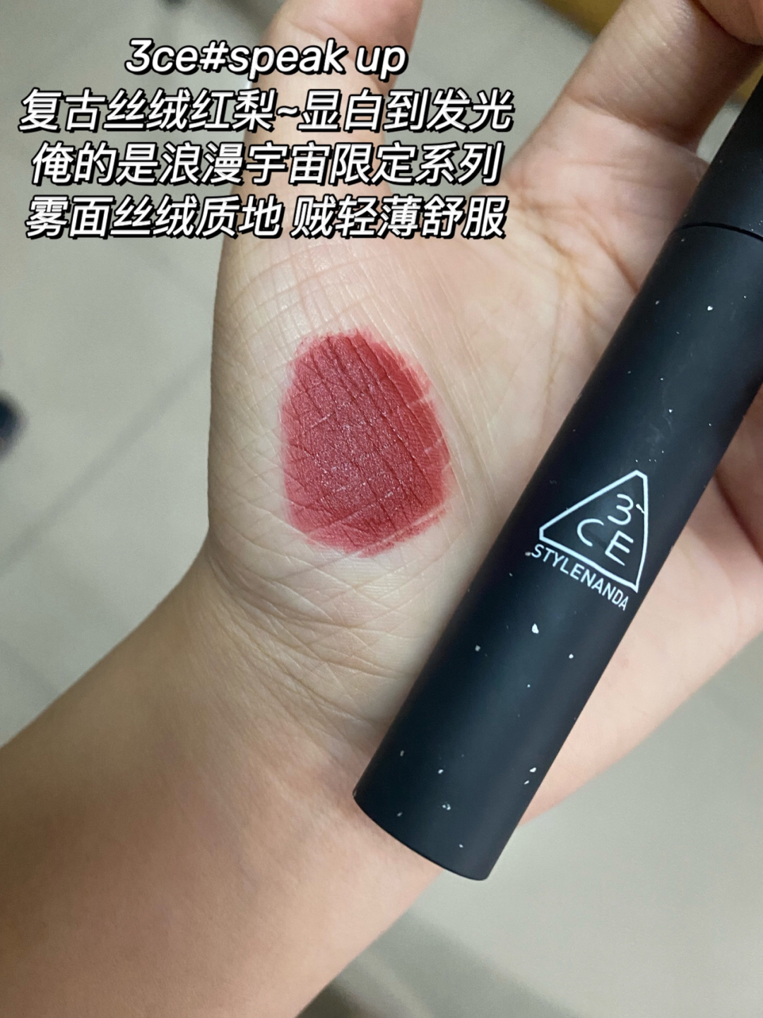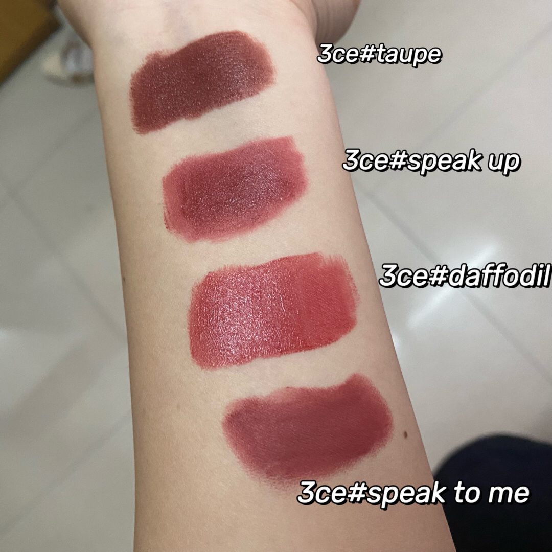 本篇笔记关联了3CE 不易脱色方管哑光口红 雾面 3.5g 222辣椒红STEP AND GO、3CE 云朵哑光雾面唇釉 4g 铁锈红IMMANENCE、3CE 亚克力透明壳柔雾哑光口红 丝绒 3.5g 裸桃粉Murumuring等商品,为用户提供真实的使用体验和购买参考。
