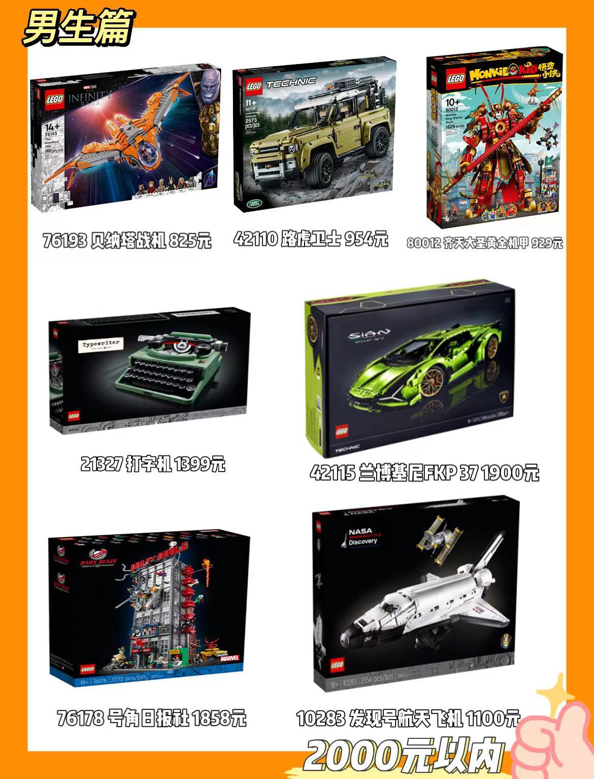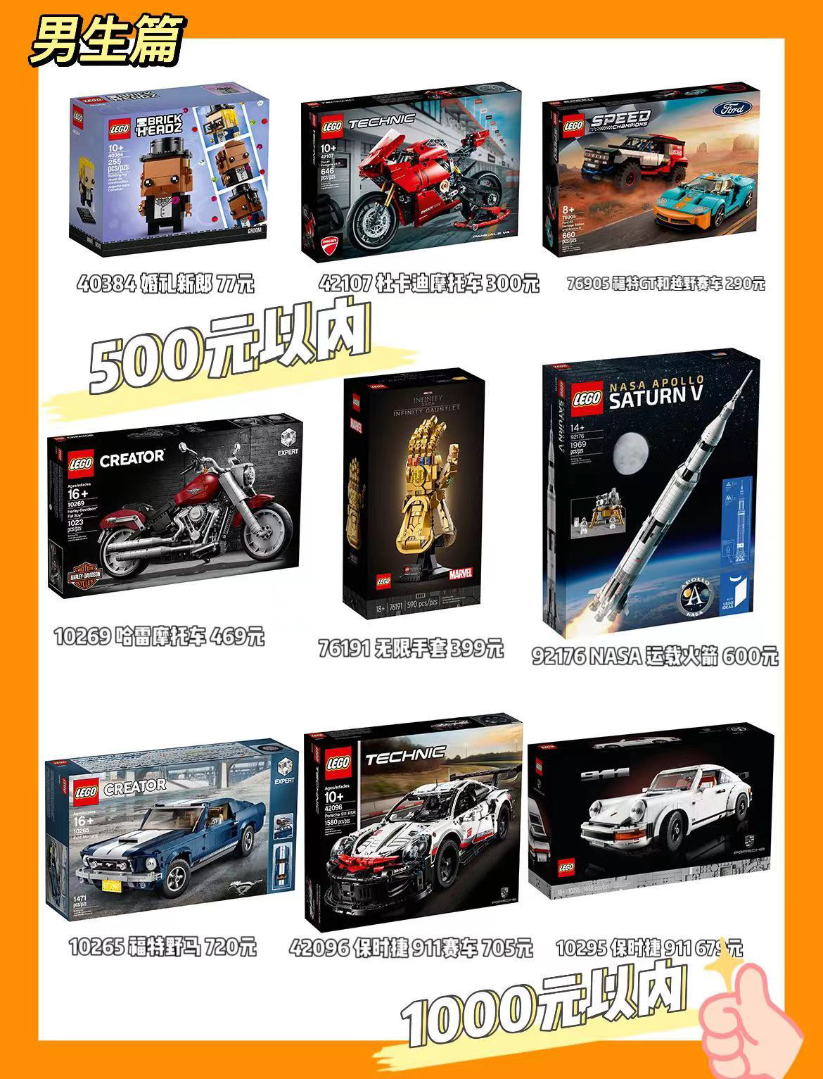 送男生: 300元以内 ⭐40384 婚礼新郎 77元 作为新郎的一份很棒礼物,在他的婚礼上或婚礼之前送给他吧 ⭐42107 杜卡迪摩托车 300元 象征着爱情的红色,以及风驰电掣的激情 ⭐76905 福特GT和越野赛车 290元 今年最漂亮的小车没有之一 500元以内 ⭐10269 哈雷摩托车 469元 每个男人心中都有一位“胖男孩” ⭐76191 无限手套 399元 送给漫威迷的他的好礼物...