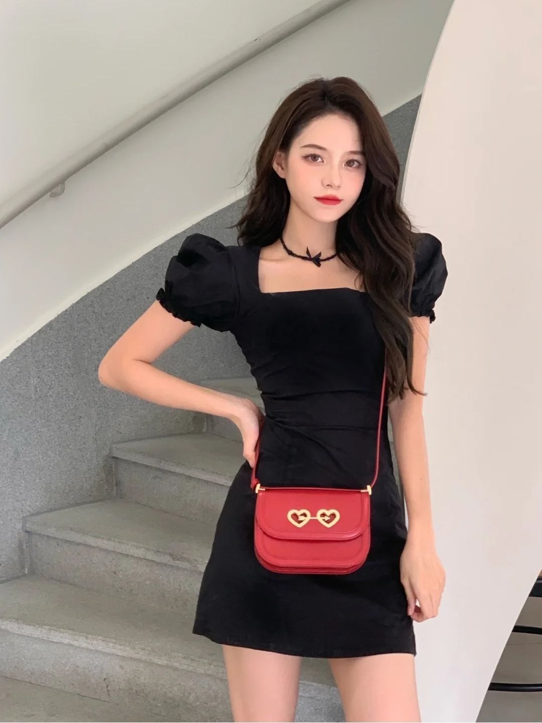 泡泡袖可以遮肩膀的肉肉,搭配了红色的包包,红与黑的搭配 yyds,还搭配了一双黑色半靴甜酷的感觉哦!黑色系约会穿搭好绝哦