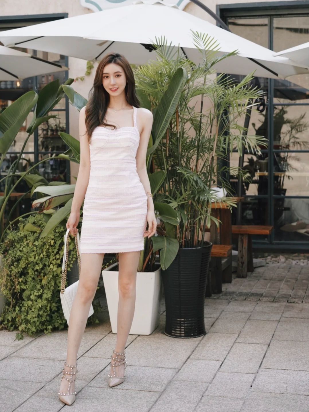 淡粉色比较凸显气质。自带胸垫的设计也很友好哦~搭配白色的竖 leboy 和裸色 valentino 三环高根鞋,妥妥的踩中直男的审美中心。