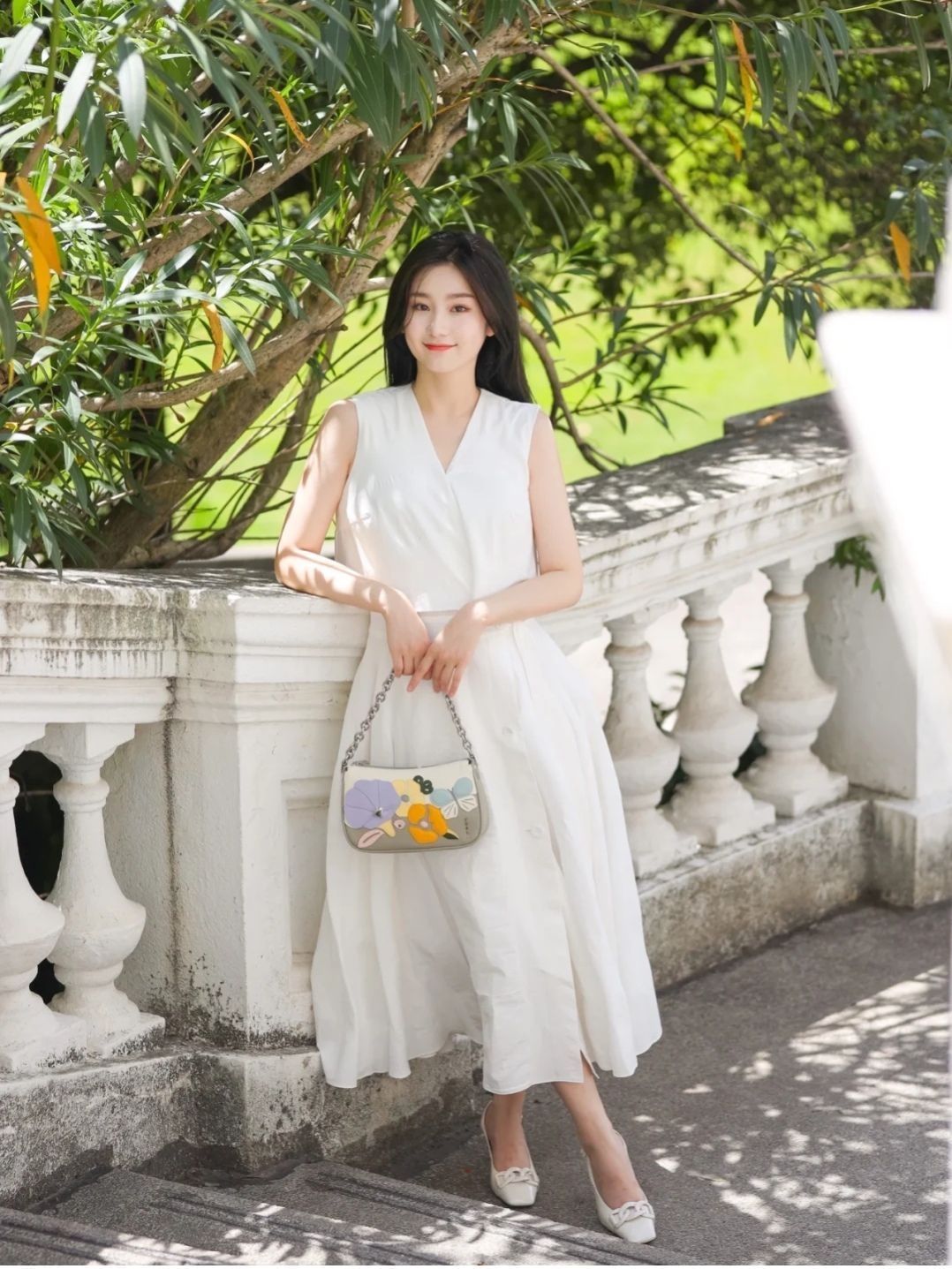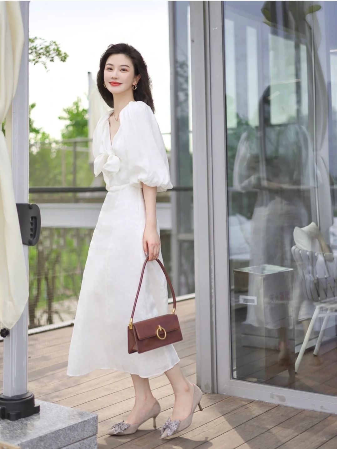 一身白色连衣裙百搭男神的同时又有女神范儿,低胸设计加上俏皮蝴蝶结,非常nice。若担心一身过素,酒红蜥蜴纹复古腋下包经典又优雅,放在一身素白连衣裙中,竟有惊鸿一瞥的精雅。