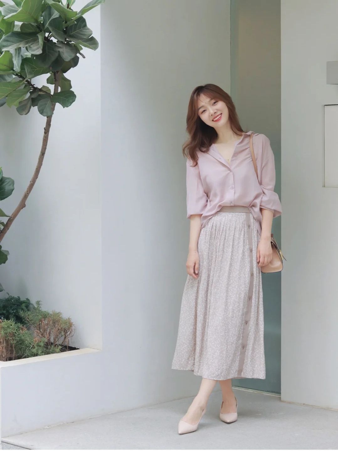 今天的粉色衬衫特别喜欢,微透的浅浅蜜桃粉穿身上1秒变温柔,做防晒衫也是非常赞,花型小、低饱和度的碎花更适合我们亚洲人~半裙是奶茶色+白色碎花和粉色衬衫、裸色鞋包是同色系
