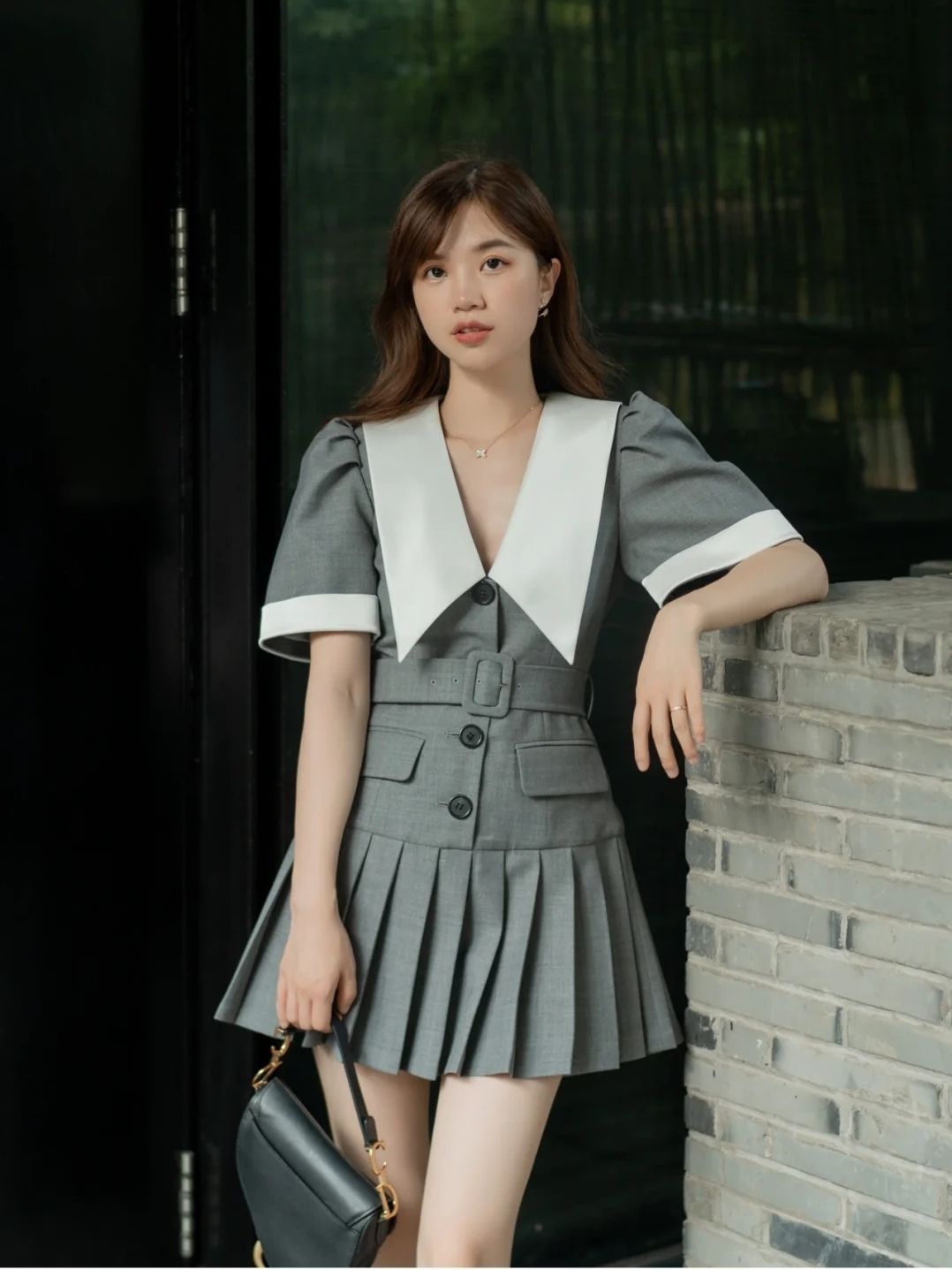 灰白撞色搭配百褶裙就很学院,谁穿谁是18岁美少女哈哈哈,大方简单的大翻领和泡泡袖又带了一点法式复古感,大 V 领展示修长肩颈,高腰短裙拉长腿型✨