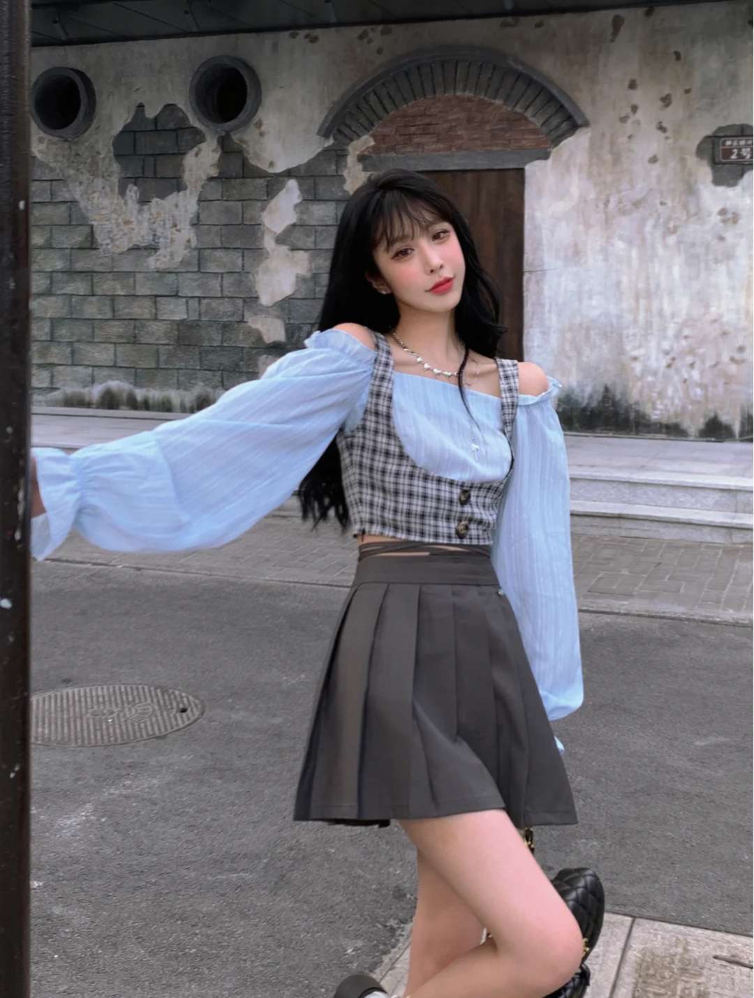 蓝色的防晒小衫绝绝子,又辣又甜的富家千金即视感。一字上衣显白又显瘦,外面叠穿一个马甲有复古的感觉,又纯又欲炒鸡显身材,百褶裙腰部绑带也很有设计感!