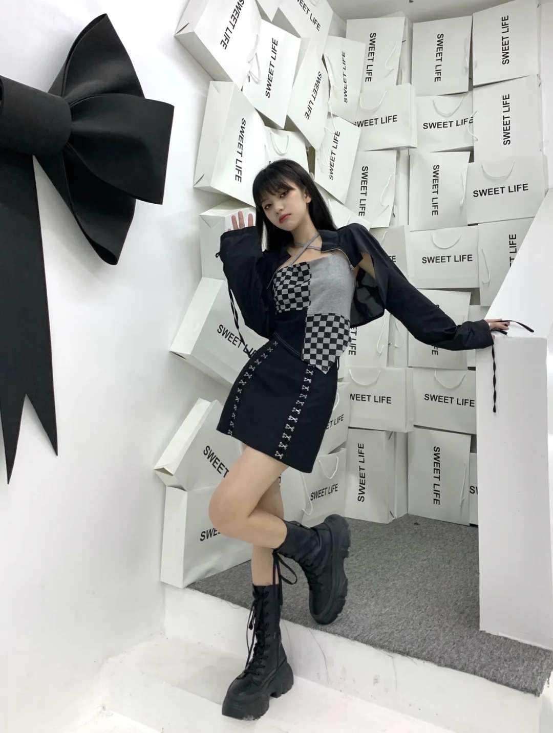 最近大火的棋盘格元素,胸前交叉绑带设计辣里辣气的。A字版型最显腰细!胯宽的姐妹也不用怕,统统都能遮住~