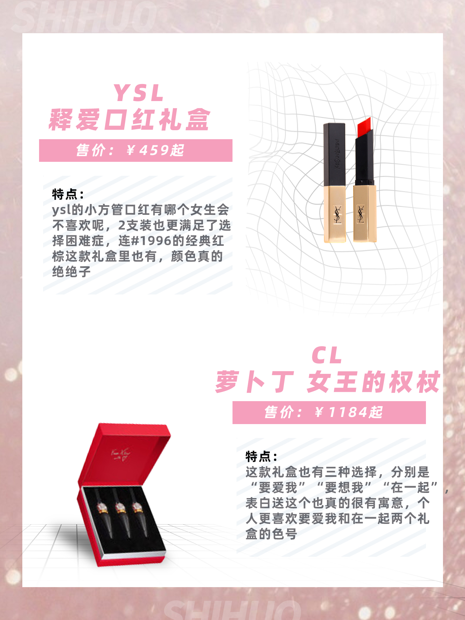 一吻定情|这些口红男朋友送起来! 女孩子的化妆包里一定少不了口红,口红色号太多不知道怎么选择?不妨尝试一下口红套装,一次性满足多个愿望 1.完美日记 小细跟口红礼盒3支装 ¥ 216起 被外观吸引过来的,颜值太高了,配色都很漂亮,很好搭配妆容。上妆很显色,外观洋气,小巧,放到包包里不占地方,虽然是哑光的但是一点儿不显唇纹,颜色很显白 2.MAC/魅可 冰纷烟花尤雾弹口红礼盒 ¥448起 小...