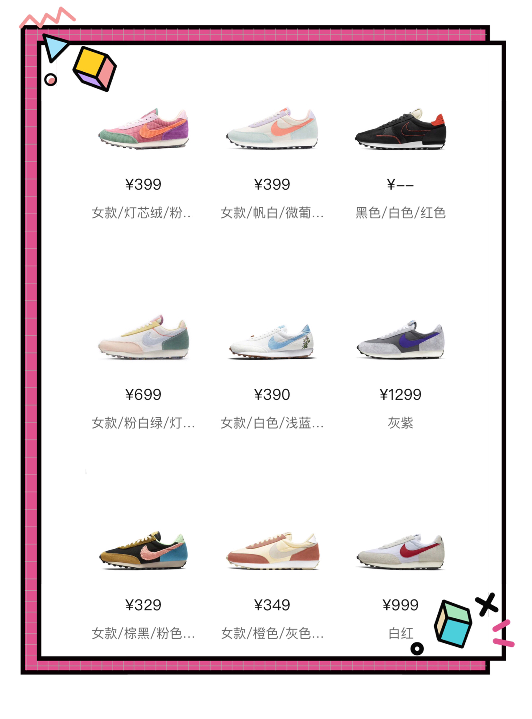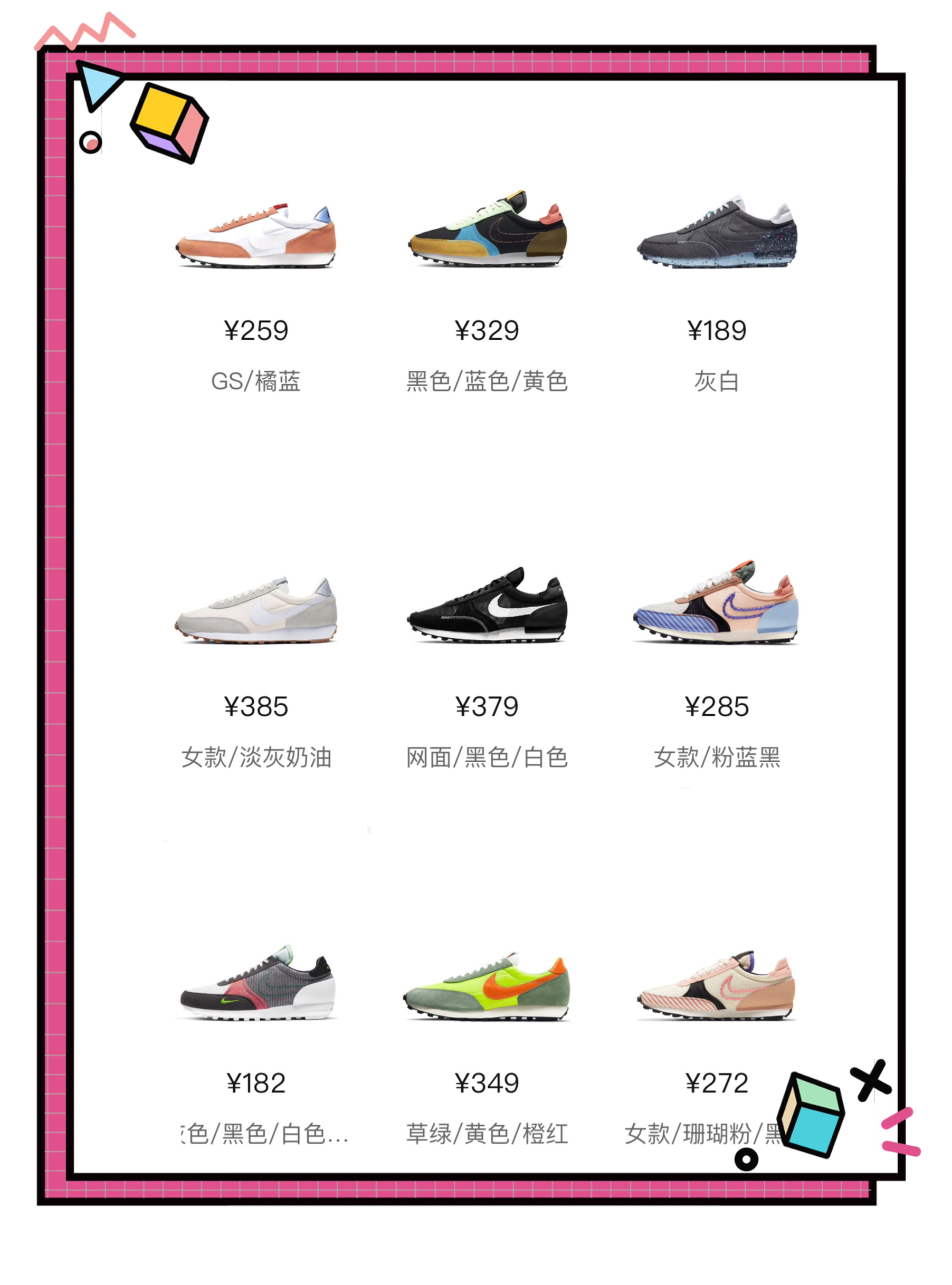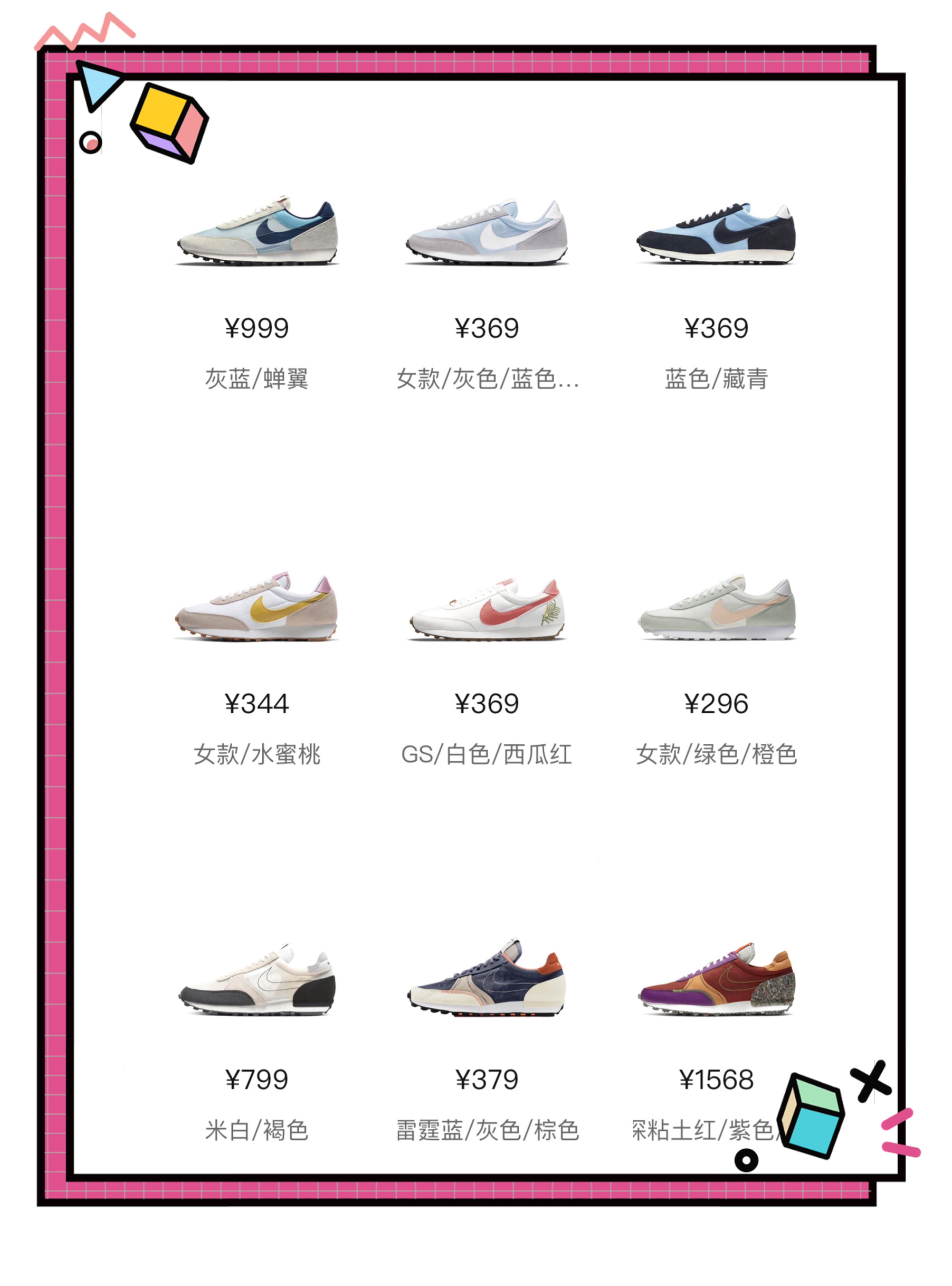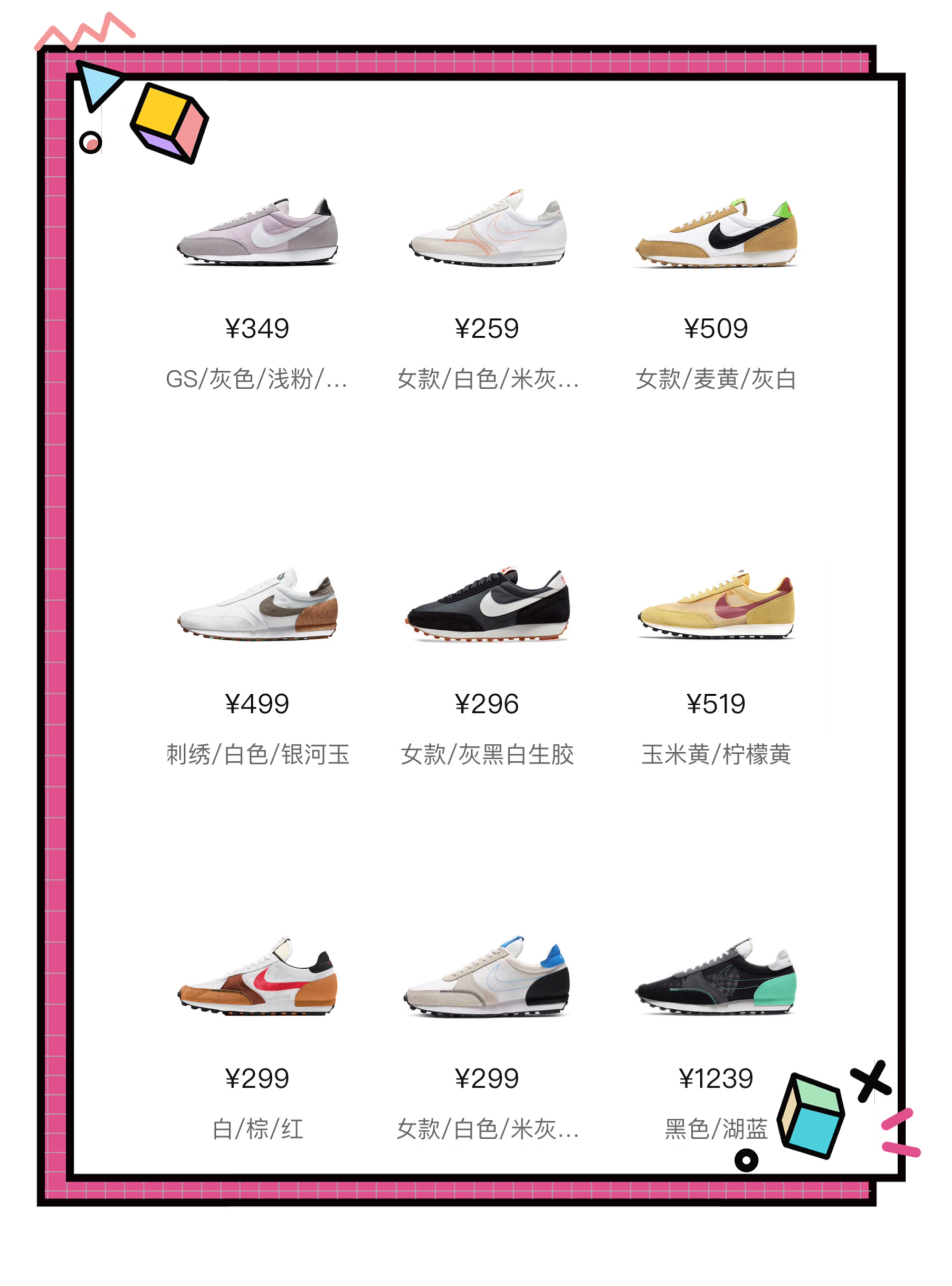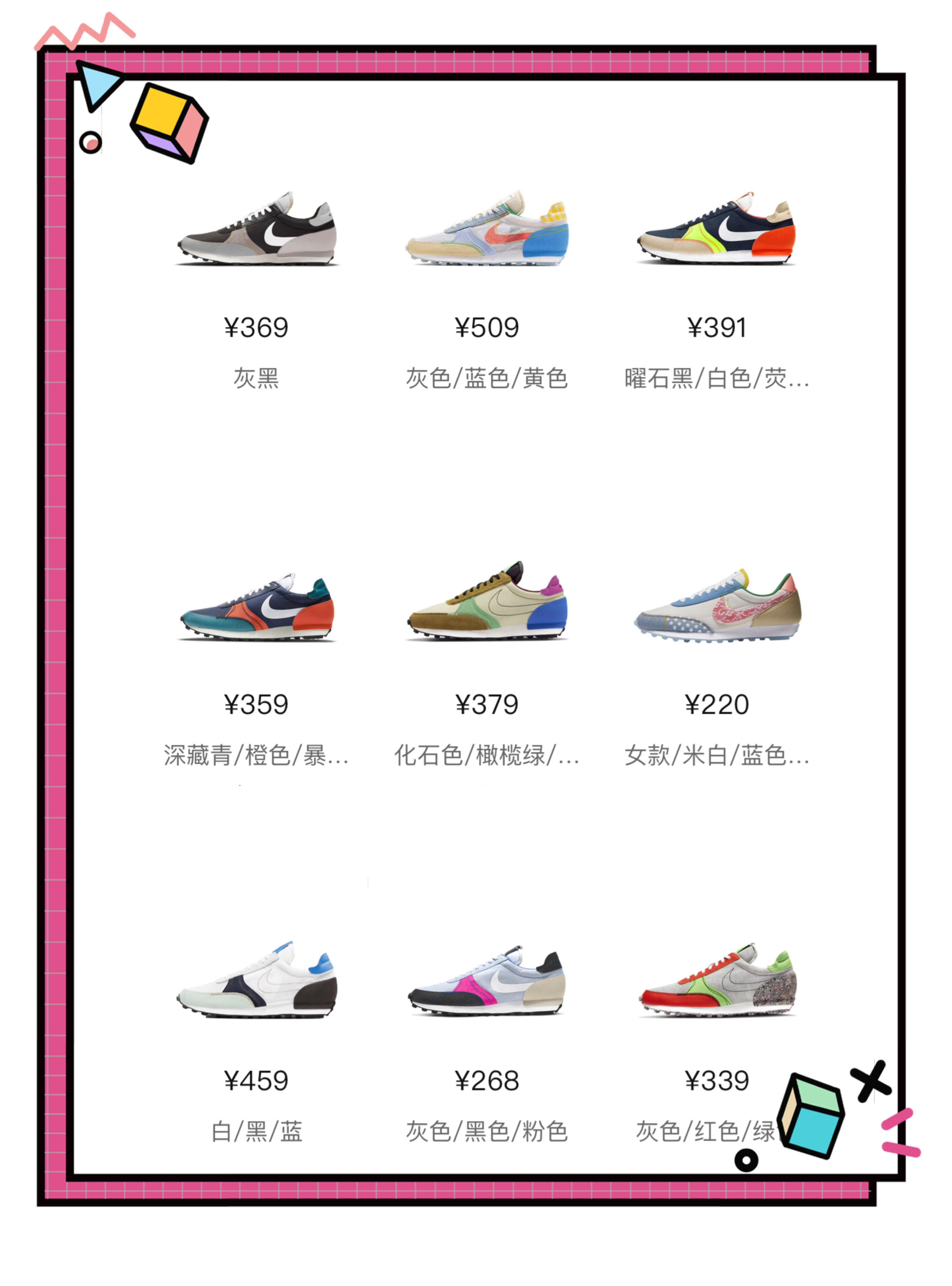 本篇笔记关联了Nike Daybreak 解构 跑鞋 华夫鞋 复古耐磨舒适休闲轻便透气织物运动合成革减震防滑低帮 灰色/蓝色/黄色、Nike Daybreak 解构 跑鞋 华夫鞋 复古耐磨舒适休闲轻便透气织物运动合成革减震防滑低帮 女款/米白/蓝色/粉色、Nike Daybreak 解构 跑鞋 华夫鞋 复古耐磨舒适休闲轻便透气织物运动合成革减震防滑低帮 曜石黑/白色/荧光黄等商品,为用户提供真实的使用体验和购买参考。