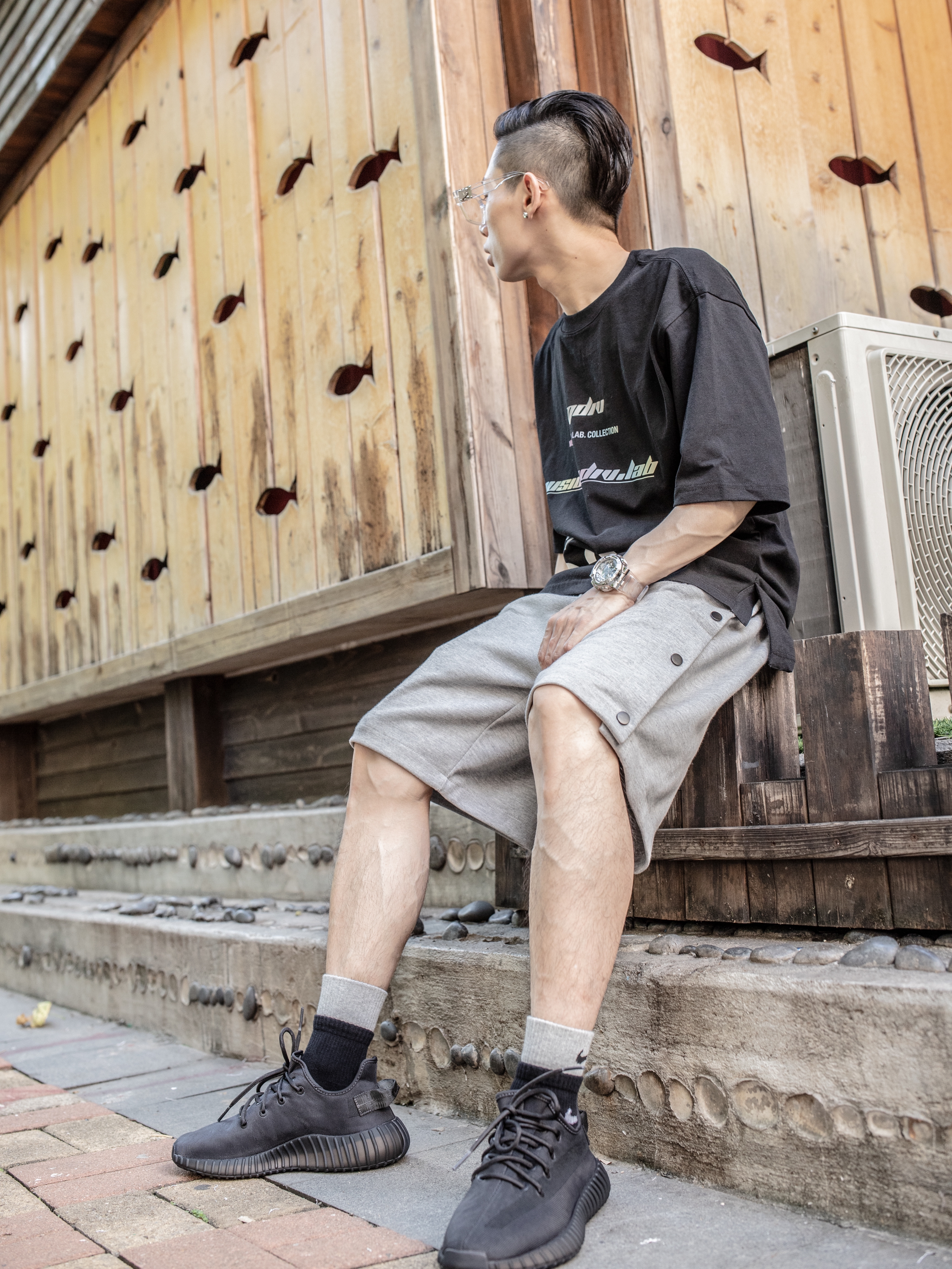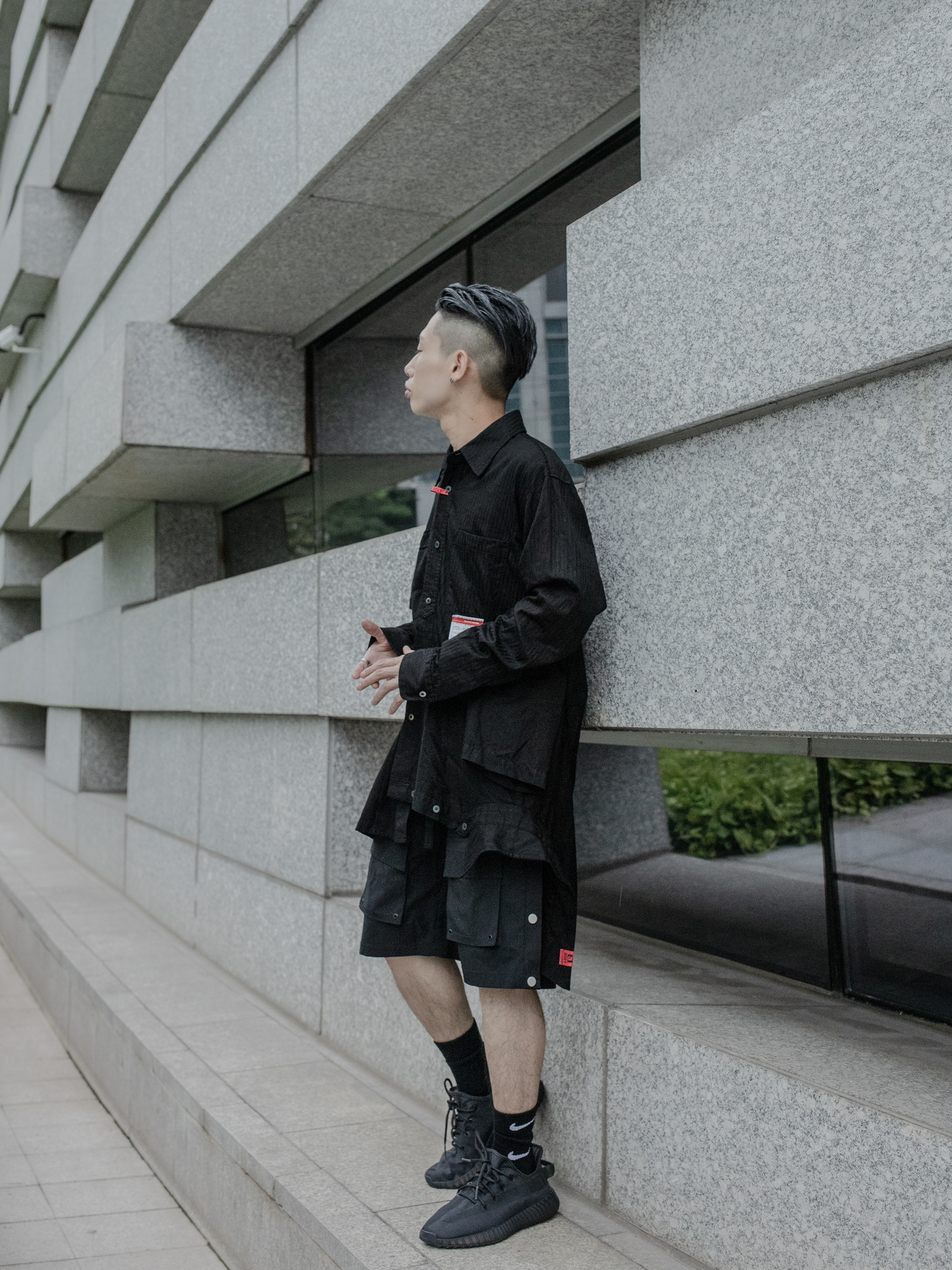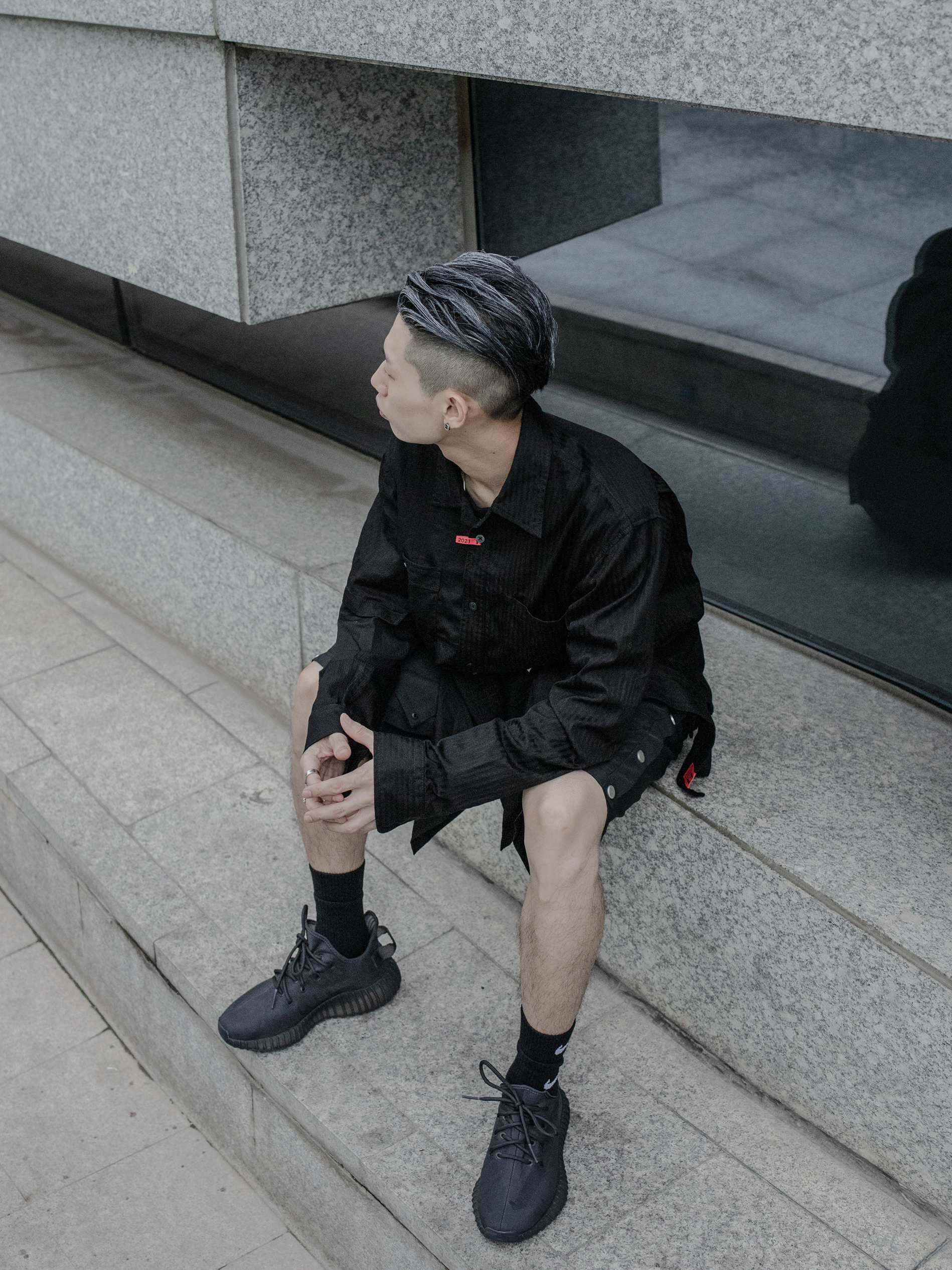 黑色总给人一种优雅和冷酷感~ 说到玩不规则剪裁和拼接还是上身这件“MADE IN JAPAN”的黑衬衫~🪐 为了让整体效果更加的有层次感这次特意搭配黑色排扣短裤而不是长裤~👑 🧦和👟还是都用了黑色去更好的营造“total black”效果🎓~ 👔:MIHARA 🩳:M5IS 👟:YEEZY 350 MONO