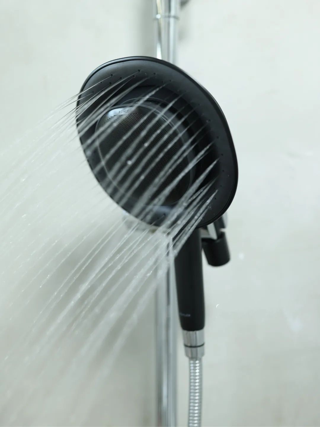 之前的那只花洒就是很普通的花洒,最近跟着吉克隽逸的红书视频入手了科勒的Moxie音乐魔雨花洒,真的体验感完全不同,它是内置哈曼卡顿无线音响的,换句话说,它是一款:“能够让你听歌的花洒🚿”。