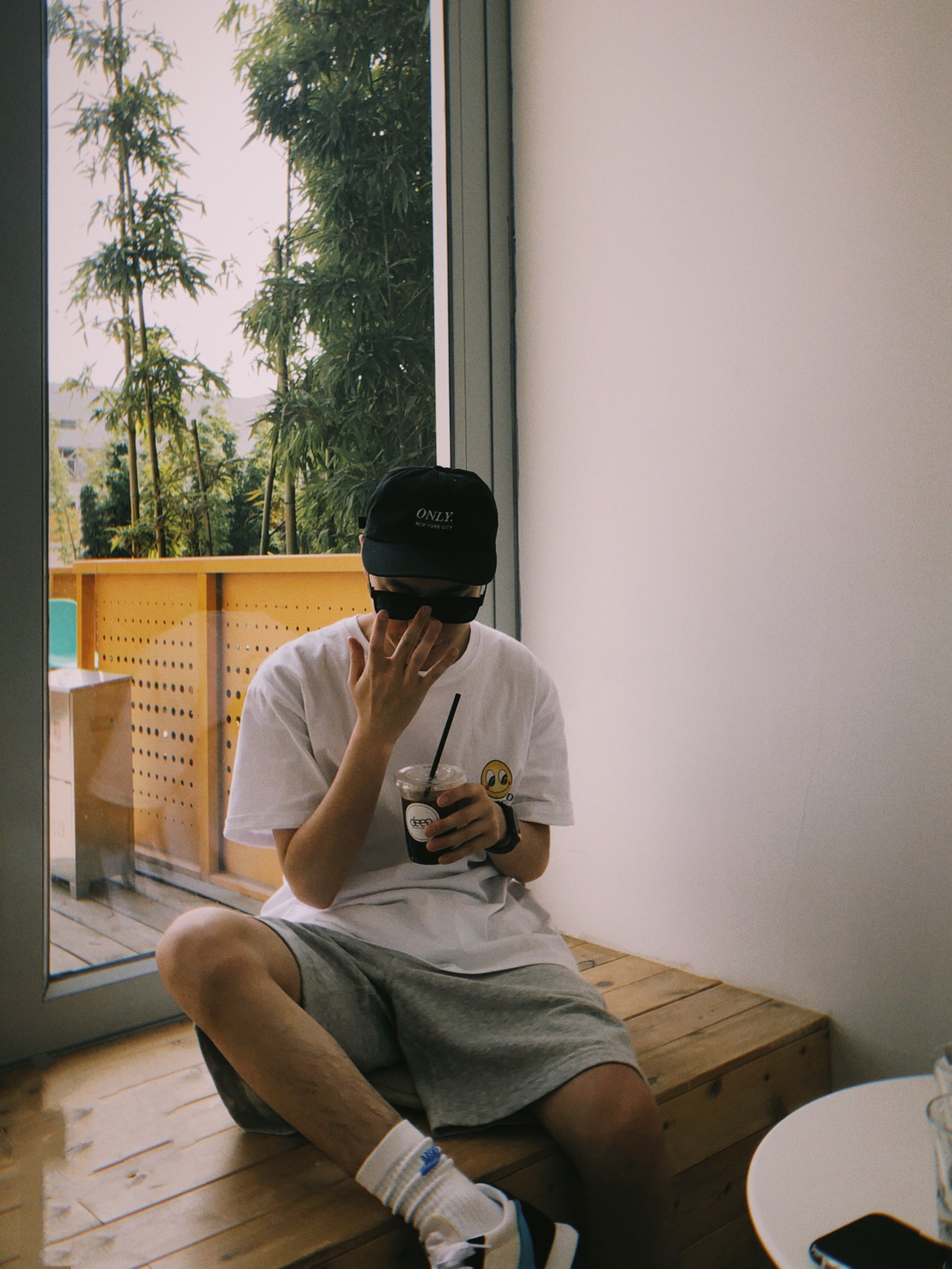 hey~今日份新鲜出炉的新look. 每次去咖啡馆都是一种新的体验,喝上一杯nice的冰美式会让你忘却路程的炎热. 今天穿搭白色系,选择了一件笑脸😊插画短袖、搭配一条浅灰色运动短裤. 棉质短裤透气性好,轻薄. 🧢:ONLY NY 👕:17Y6 🩳:HM 👟:Nike Tailwind 79