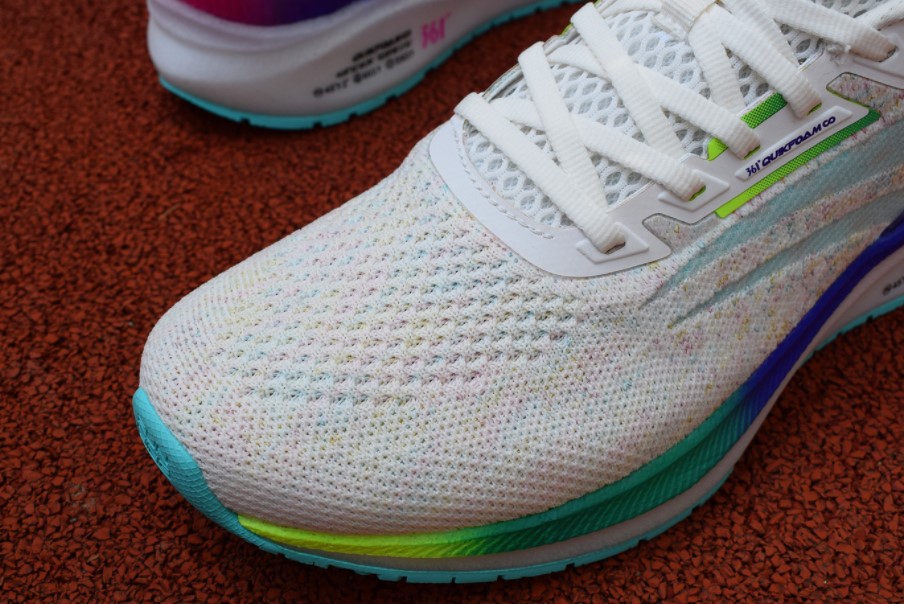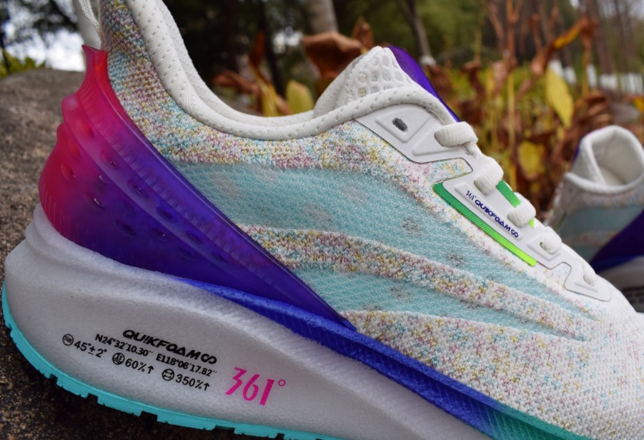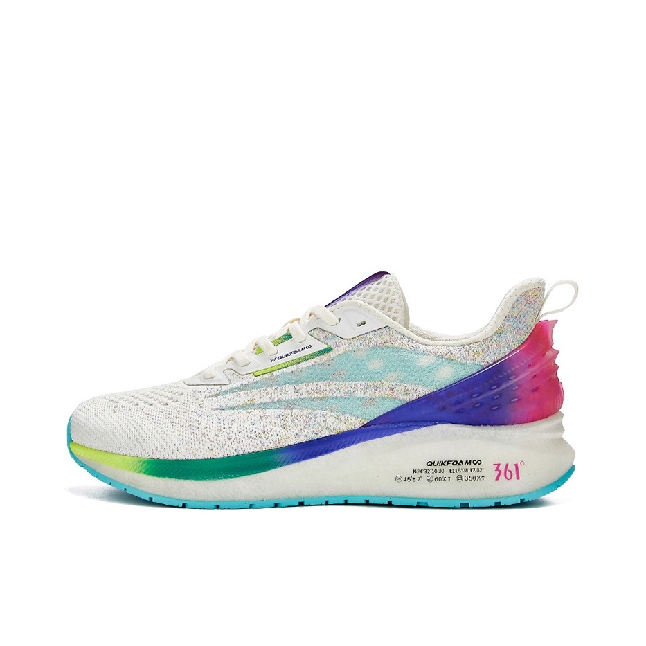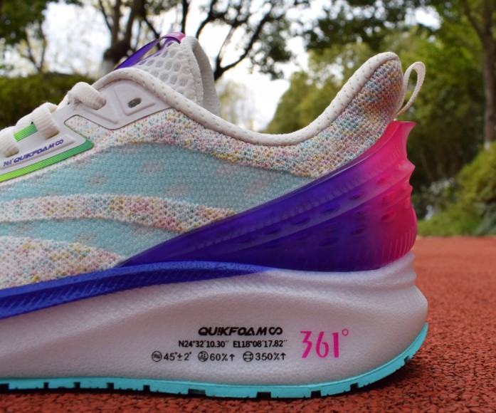这款361°Q弹超跑鞋色彩运用大胆前卫,如此妖艳的跑鞋吸睛力十足。 361°Q弹超跑鞋的针织鞋面掺入了大量彩色MONO纱线,两侧中足区域窗纱式设计。 361°Q弹超跑鞋紫红渐变色后帮极具视觉冲击感,大面积环抱式TPU两侧向前延伸的幅度很大且质地坚硬,如此设计为用户提供了良好的支撑和稳定性保护。 361°Q弹超跑鞋使用的Q弹科技是361°最新的中底材料,是通过特殊发泡结构的高性能材料打造。从外观上...