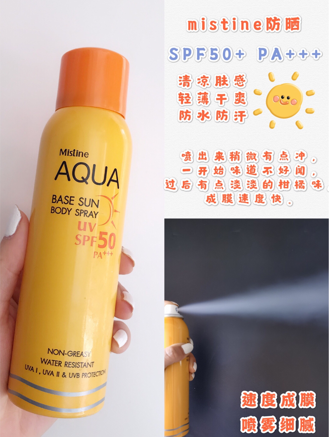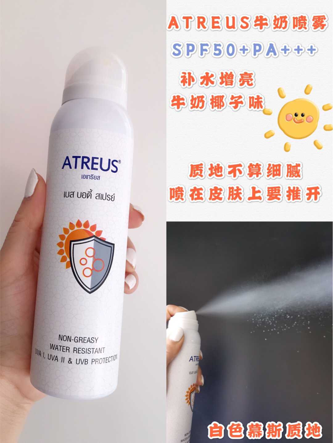本篇笔记关联了Mistine/蜜丝婷 小黄帽防晒喷雾 防水保湿清爽 【国版】SPF50+、ATREUS/爱醇诗 牛奶防护隔离喷雾 150ml等商品,为用户提供真实的使用体验和购买参考。