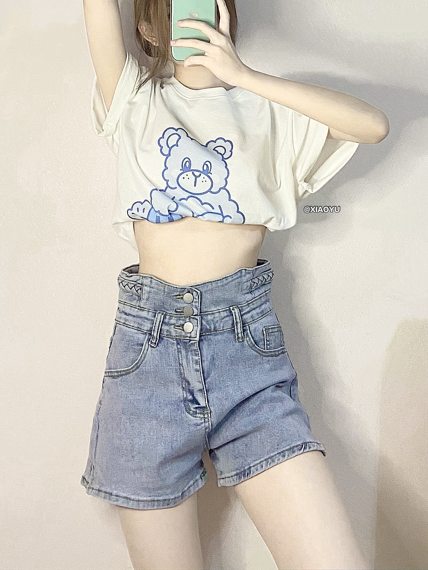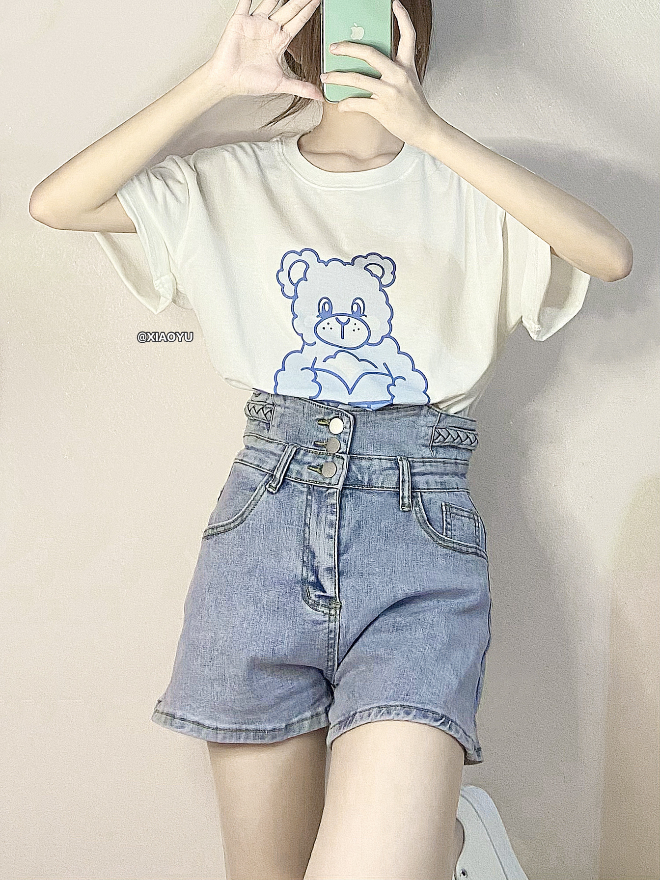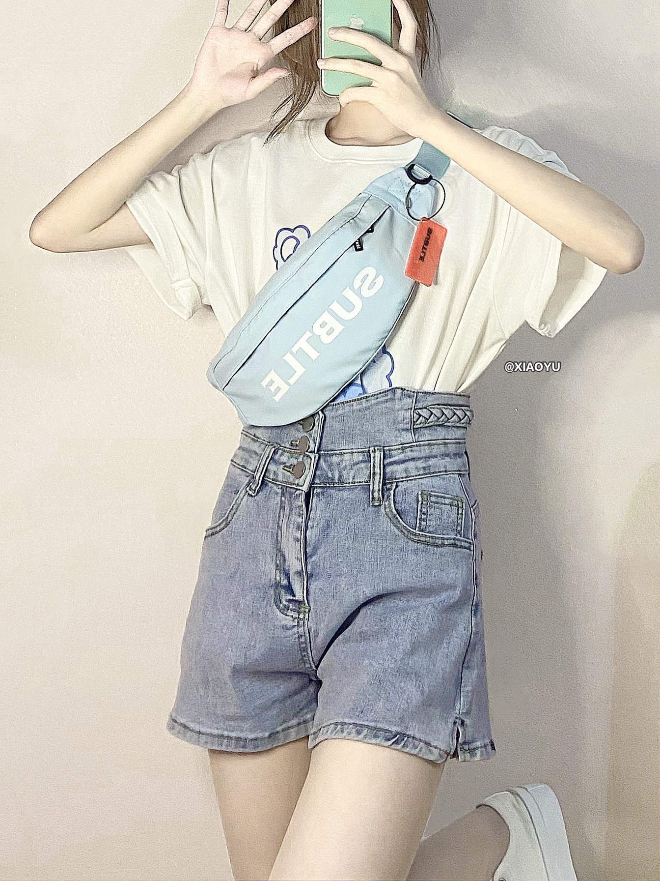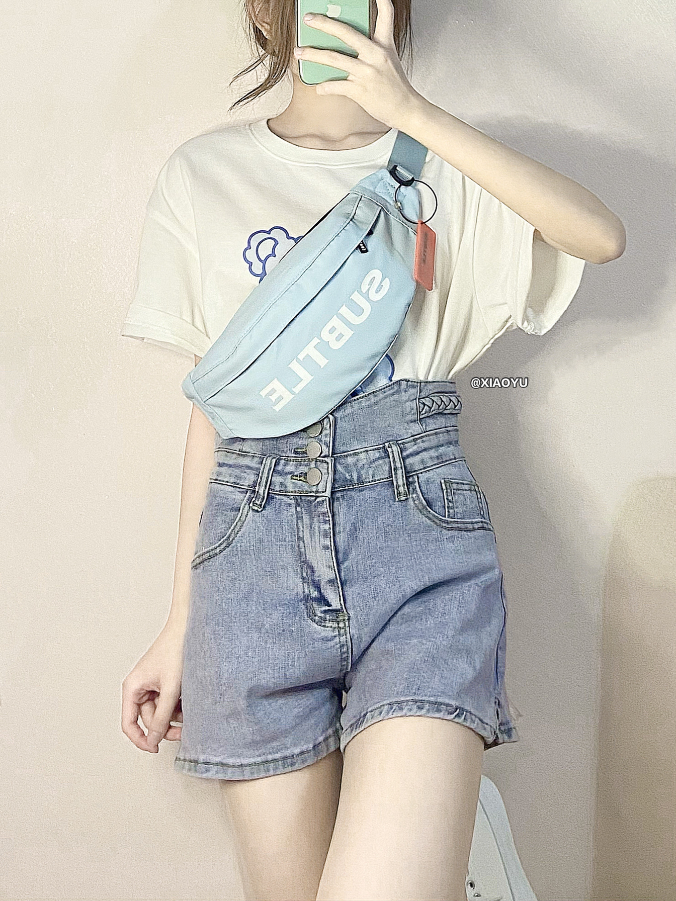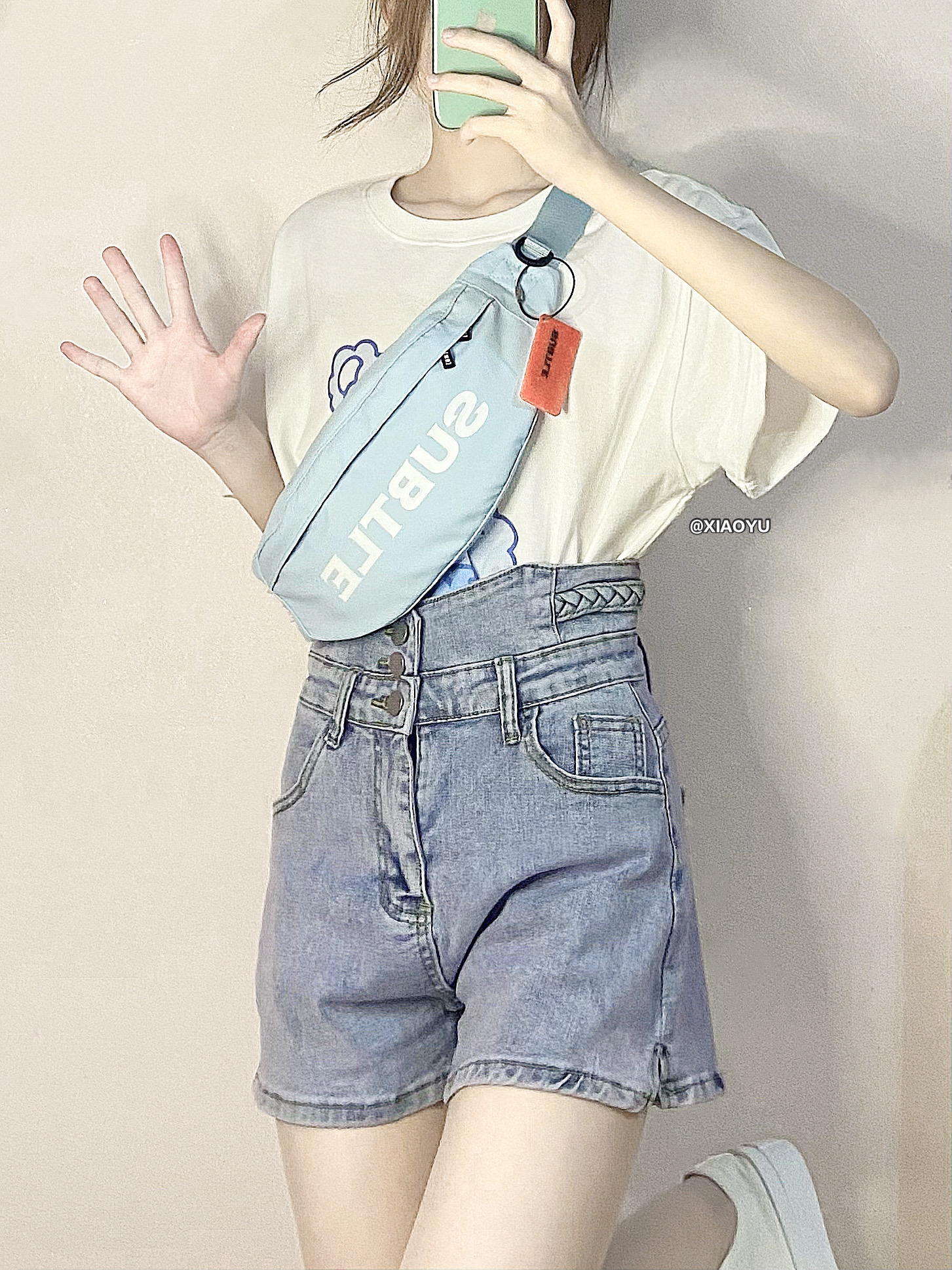hey 大家好 这里是小羽✨ 🎒奶蓝色的腰包是SUBTLE家的小饺子包 💰199 一款男女都能背的运动胸包 背着很舒服完全不勒肩膀 包装是很高档的橙盒 送男朋友作节日礼物很合适~ 容量比较大 肩带也是可以调节的 面料防水很实用 👔小熊短袖🔍🍑LK STORE 💰158 这个t恤也太可爱了!奶蓝色的小熊真的好软萌555 🩳短裤🔍🍑安安好ANANHAO 💰68 这个牛仔短裤很显瘦 很平价才六...