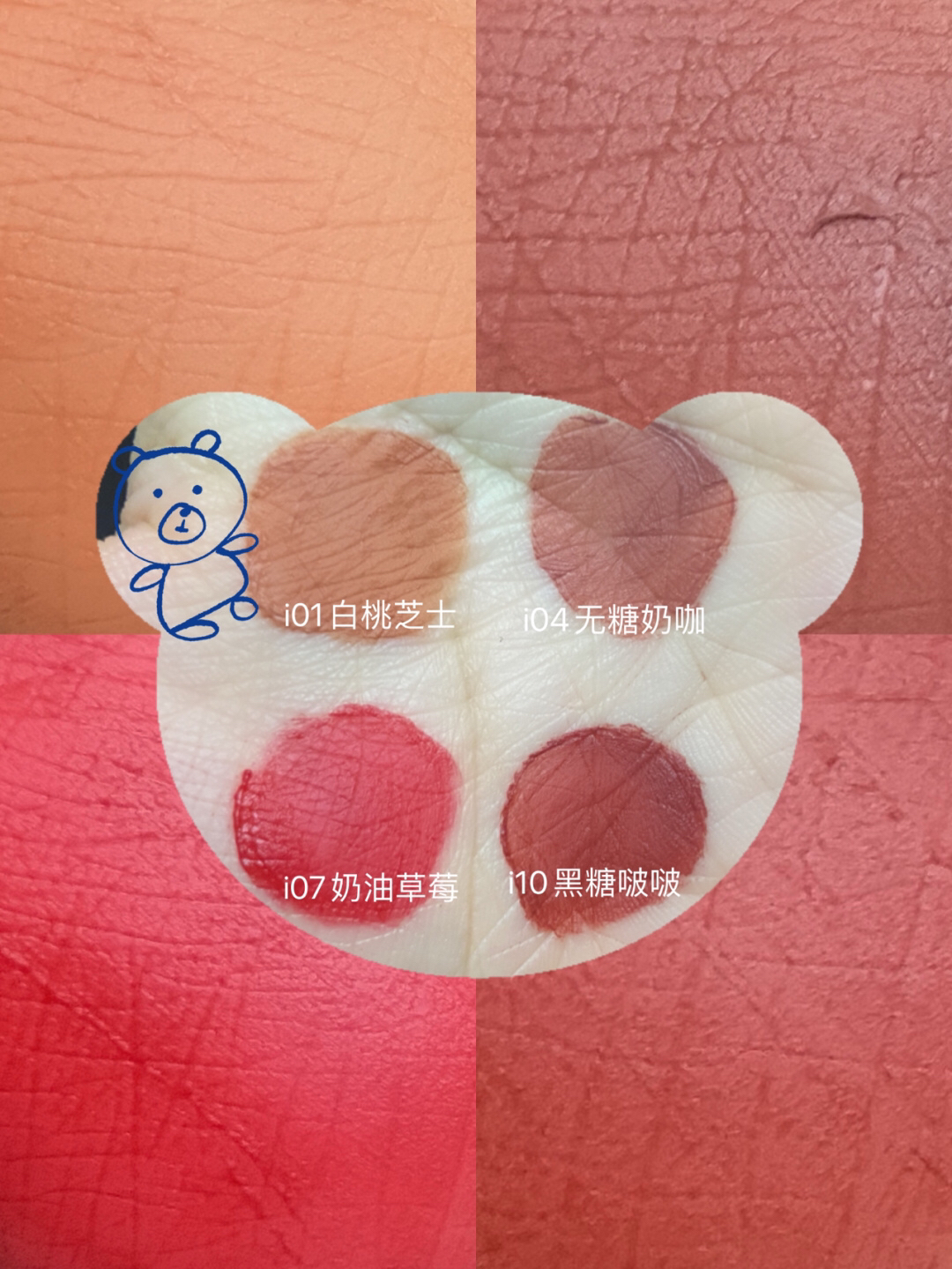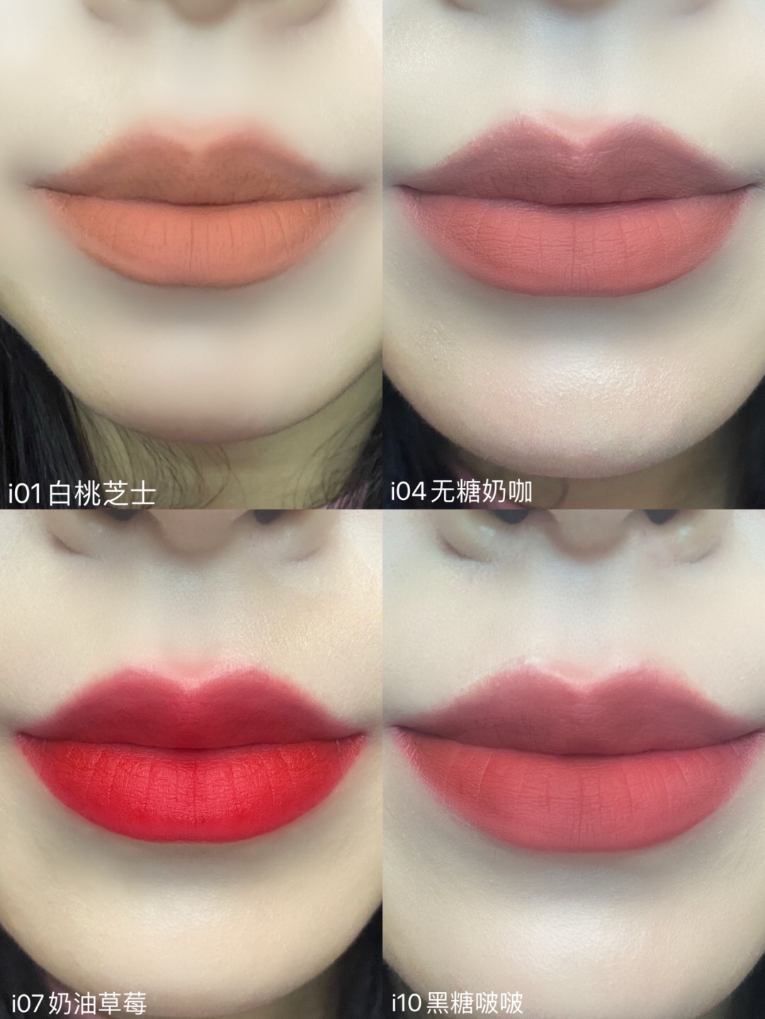 稚优泉奶霜唇釉4支试色 i01白桃芝士 我坠喜欢的一支,用来叠涂打底绝绝子!所有皮女孩给我冲!!!!!深浅唇都冲!因为很显色,不在乎你深唇还是浅唇! i04无糖奶咖 温柔的奶茶色 i07奶油草莓 有气质的草莓红 i10黑糖啵啵 辣妹红棕色!谁涂谁拽!拽就完了!