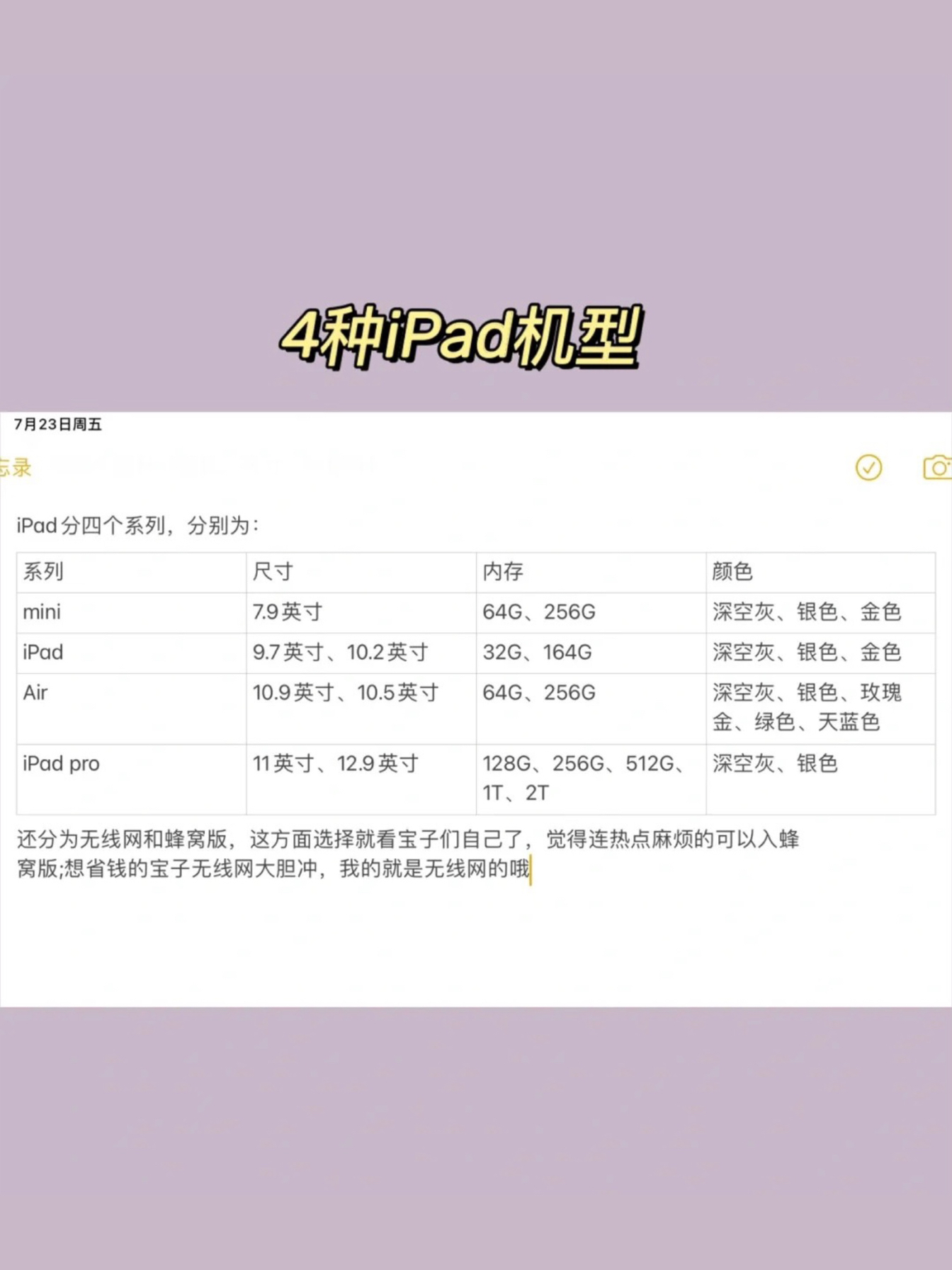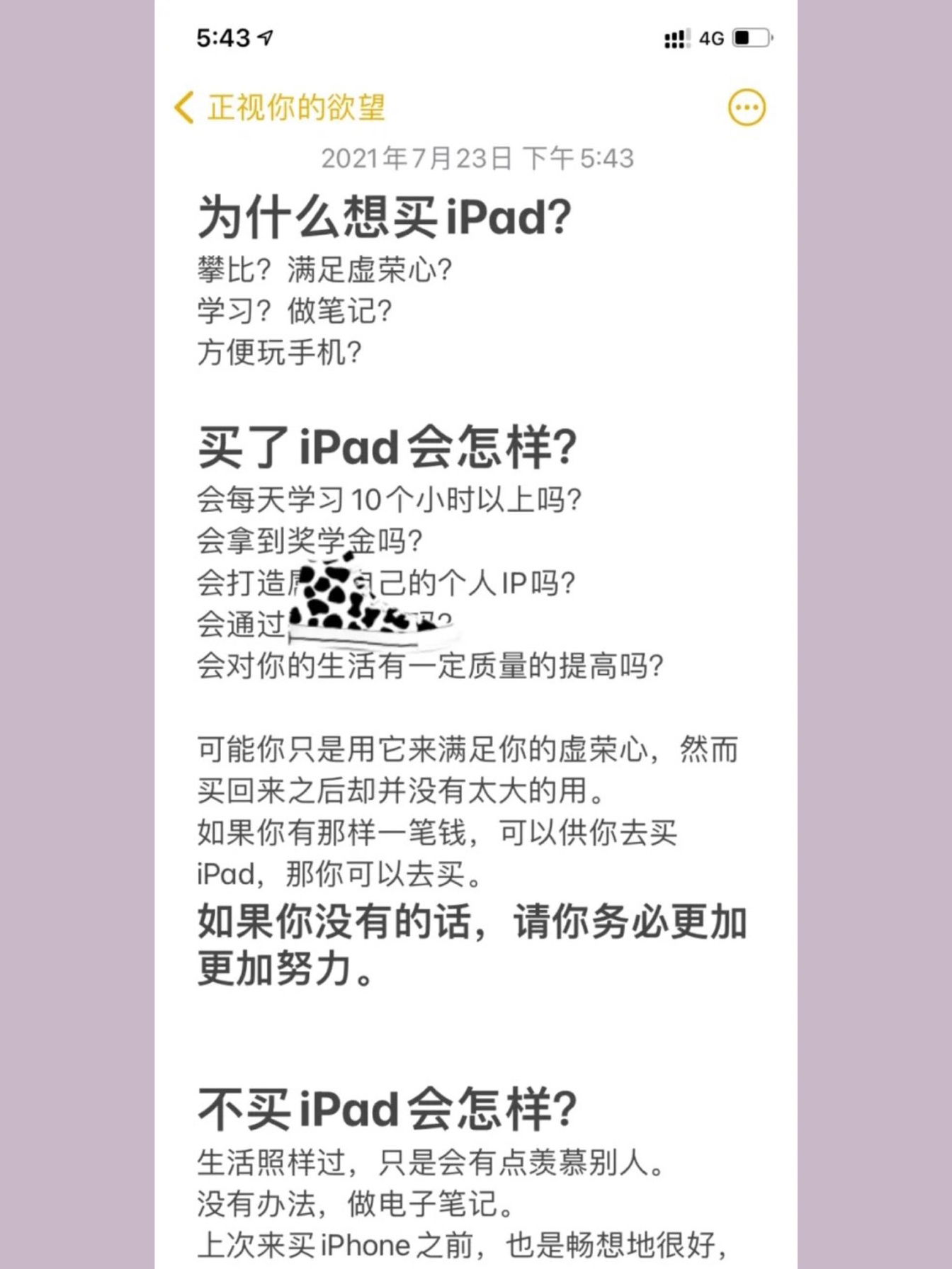 专门针对学生党的iPad购买指南出来啦!!! 我们选购时可以按照以下三个步骤逐步去思考,挑选适合我们的iPad。我也会给出我的建议供宝子们参考哦 🌵 1、要不要买 为什么想买?买了会怎样?不买又会怎样?这些是最基本的问题,也是我一开始买iPad前纠结时间最长的问题。图2是我在纠结时写下的矫情文字🤪 - 我们大多数人都有从众心理,我一开始被种草iPad,就是因为看见别的博主们用iPad学习很方便,但...