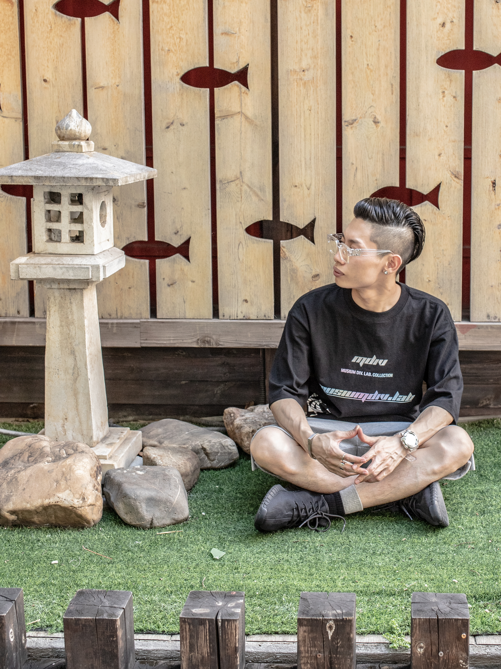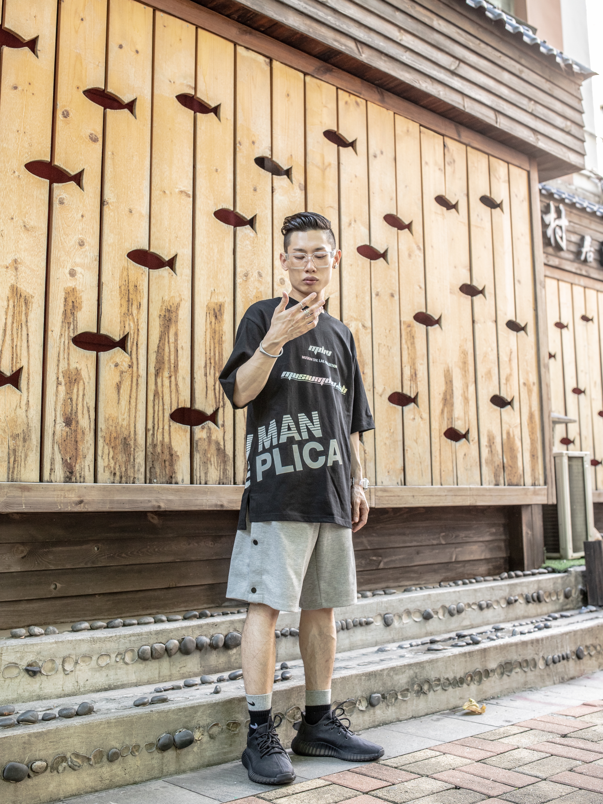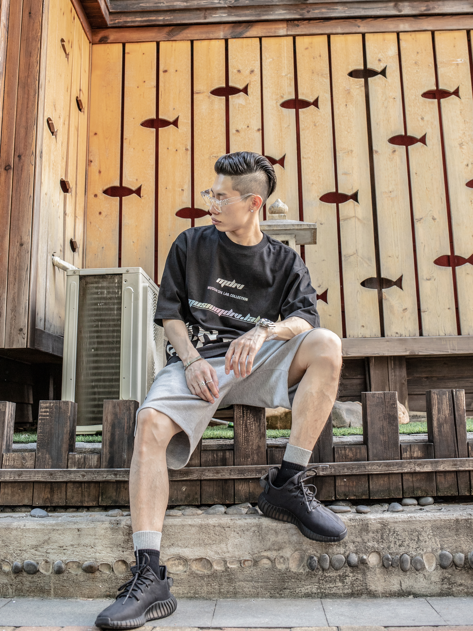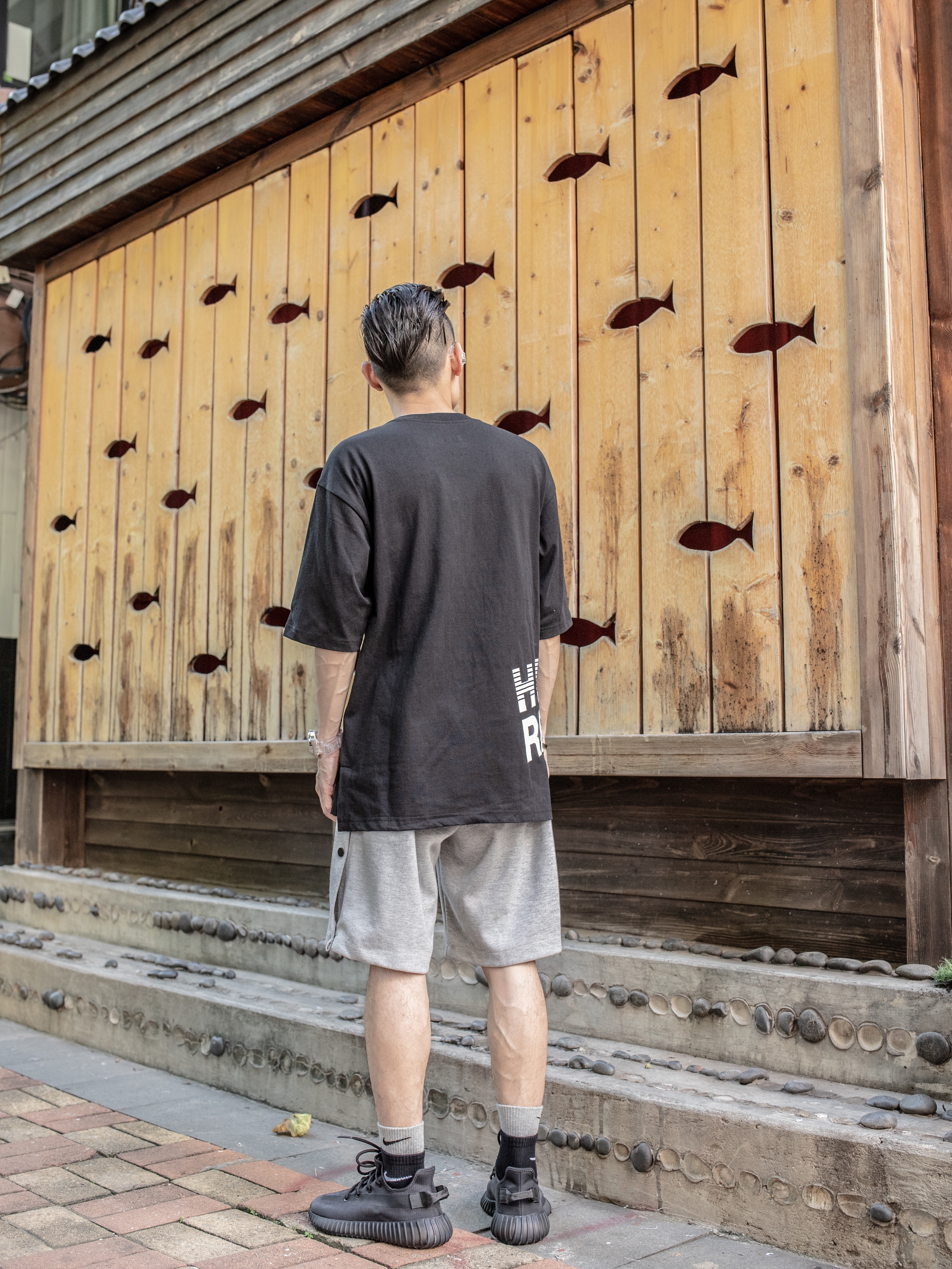 今天来到这里吃日本菜,店外面是一个和式风格的外墙,鱼的图案让人想起当地民间的一些旗帜🐟🏁~ 映衬的是我身上一套灰黑色奥利奥穿搭~🥯 浅灰色裤子和黑色t恤有鲜明颜色碰撞💥 接着压抑也是灰黑拼色的,加上黑色低帮球鞋的确是一个很棒的颜色模块~⭐️💫 👓:LV 🩳:M5IS 👟:YEEZY 350 MONO