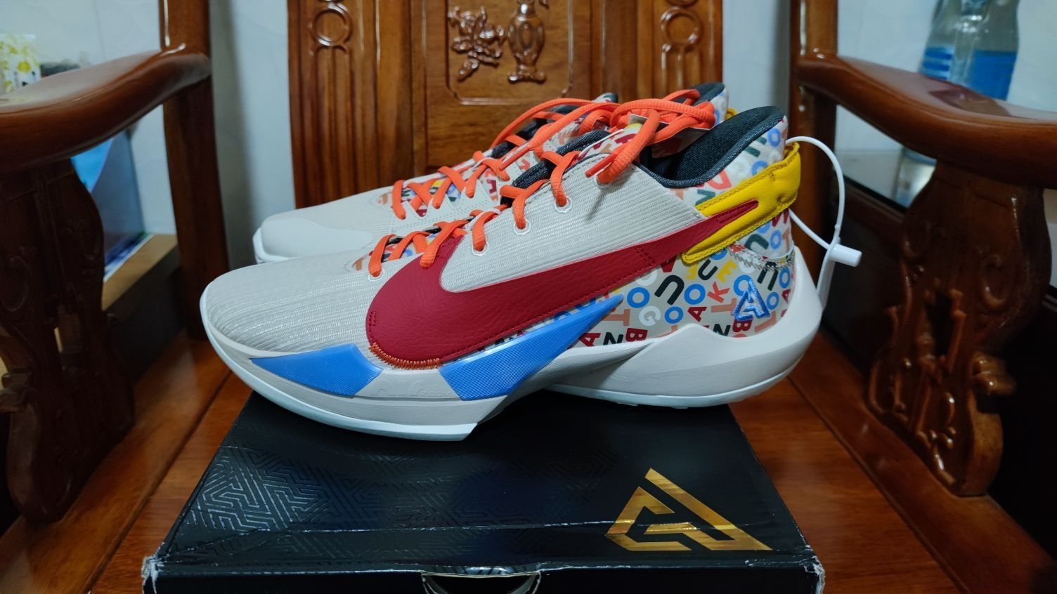 字母哥2代从发售便一直惦记着,终于入手了! 首先鞋子这个配色我觉得好顶,宁可多加200块买下它。鞋子的性能没得踩了,前掌一厘米厚的扇形zoom气垫脚感真的很爽,后掌的phylon泡棉挺弹的,防侧翻做的超棒,加宽设计和低重心,绝对安全。在我看来字母哥2代就是PG1-3代的平替,三百多就可以买到,性价比特别赞,这双鞋首推给锋线。当然有几个小缺点,一个是tpu容易掉线开胶,这个好像是这双鞋的通病,不过后...