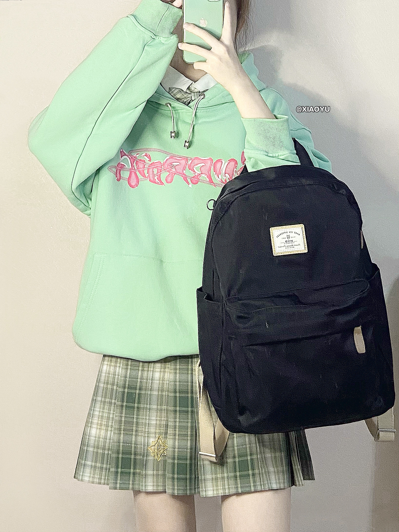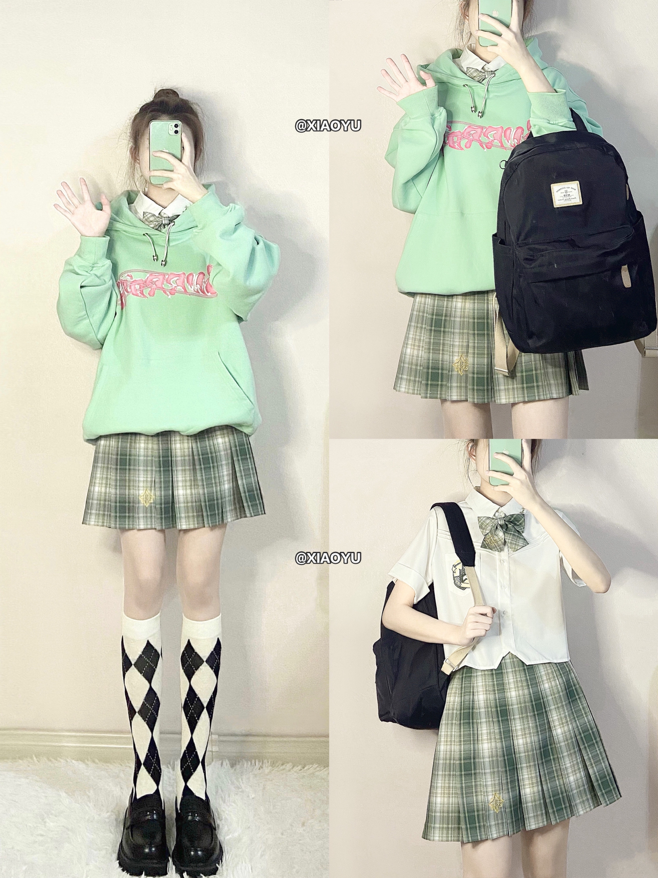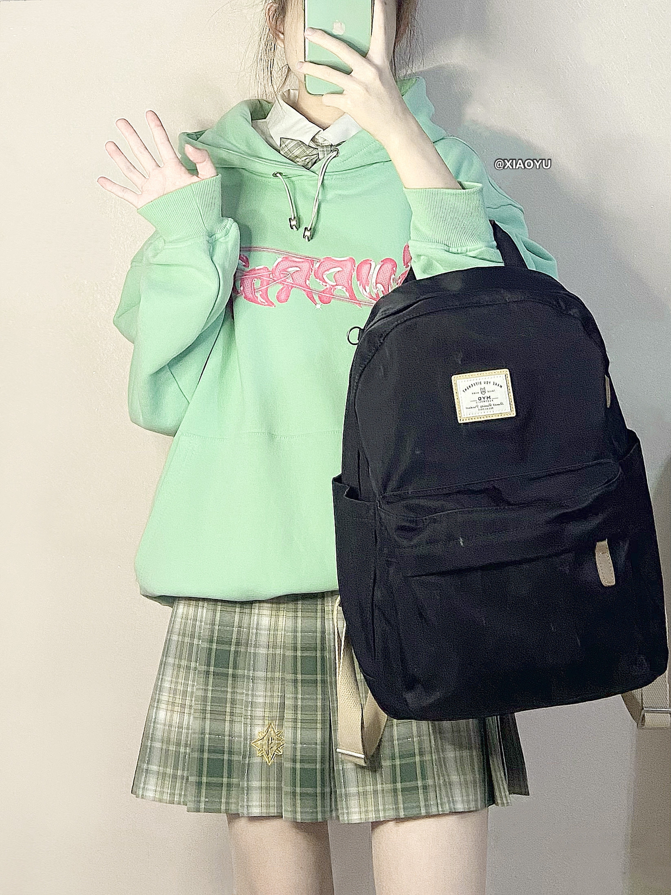 hey 大家好 这里是小羽✨ 秋天的D1套穿搭 绿色真的好嫩🍀 - 👔果冻卫衣🔗chrrota 是那种很厚的帽衫卫衣 穿上很暖和 软软的 绿色配粉色的印花真的敲可爱! 🎒双肩包🔗myd 奶茶系列黑莓色 黑色的背包是不会出错的 耐脏又百搭 myd家的这个容量很大 收纳的隔层很多 上次出去旅行就是背的myd家的包 特别方便! 学生党上学背也是够用的 每个颜色都很好看 👗衬衫&格裙🔗御茶家JK制...