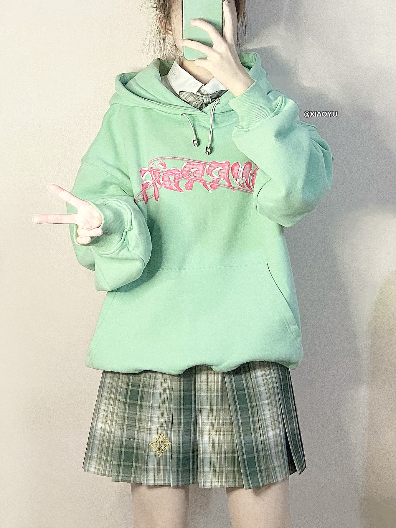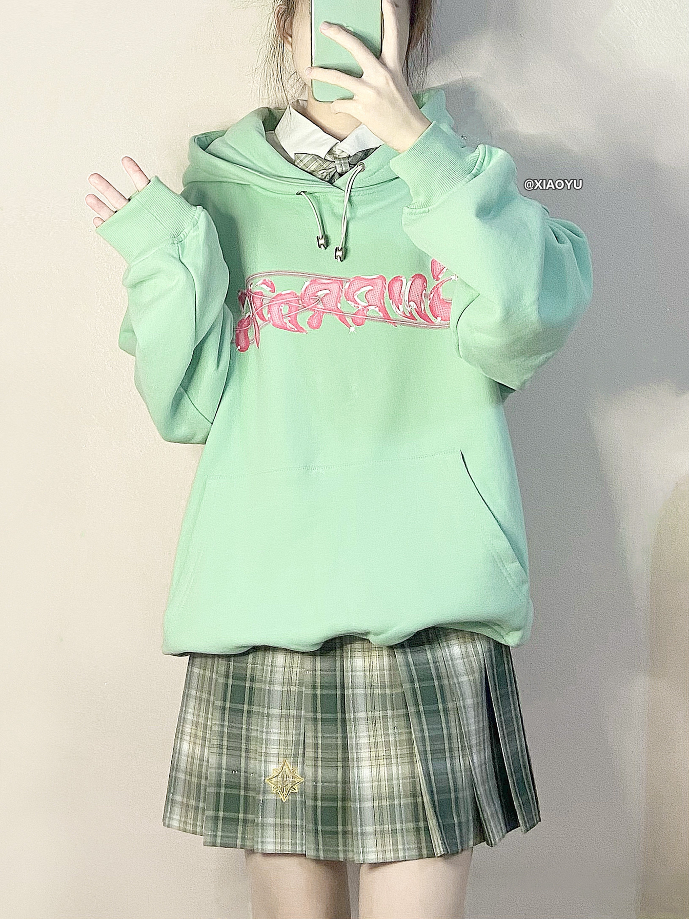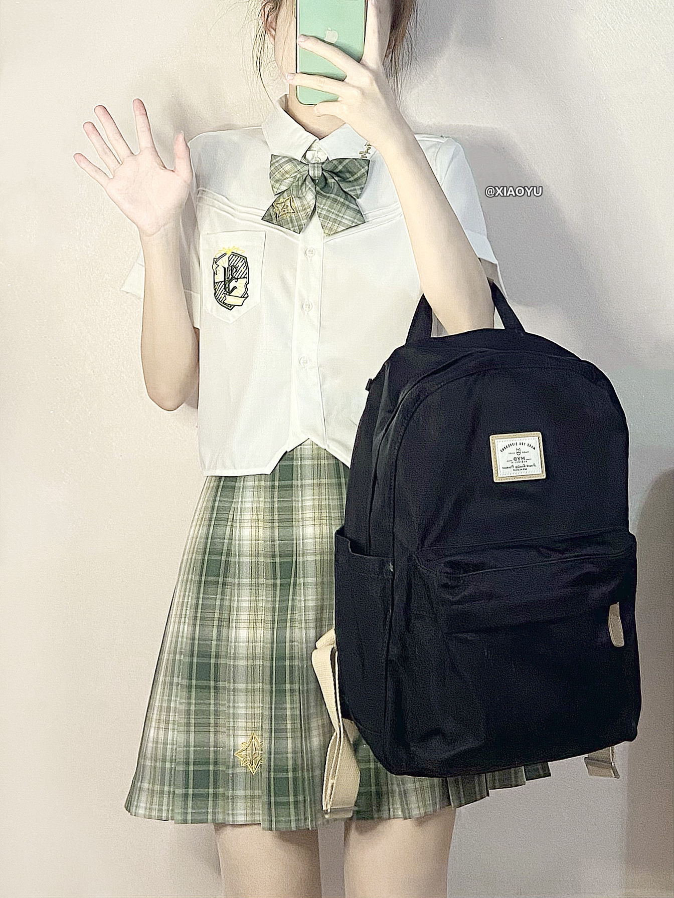 hey 大家好 这里是小羽✨ 秋天的D1套穿搭 绿色真的好嫩🍀 - 👔果冻卫衣🔗chrrota 是那种很厚的帽衫卫衣 穿上很暖和 软软的 绿色配粉色的印花真的敲可爱! 🎒双肩包🔗myd 奶茶系列黑莓色 黑色的背包是不会出错的 耐脏又百搭 myd家的这个容量很大 收纳的隔层很多 上次出去旅行就是背的myd家的包 特别方便! 学生党上学背也是够用的 每个颜色都很好看 👗衬衫&格裙🔗御茶家JK制...
