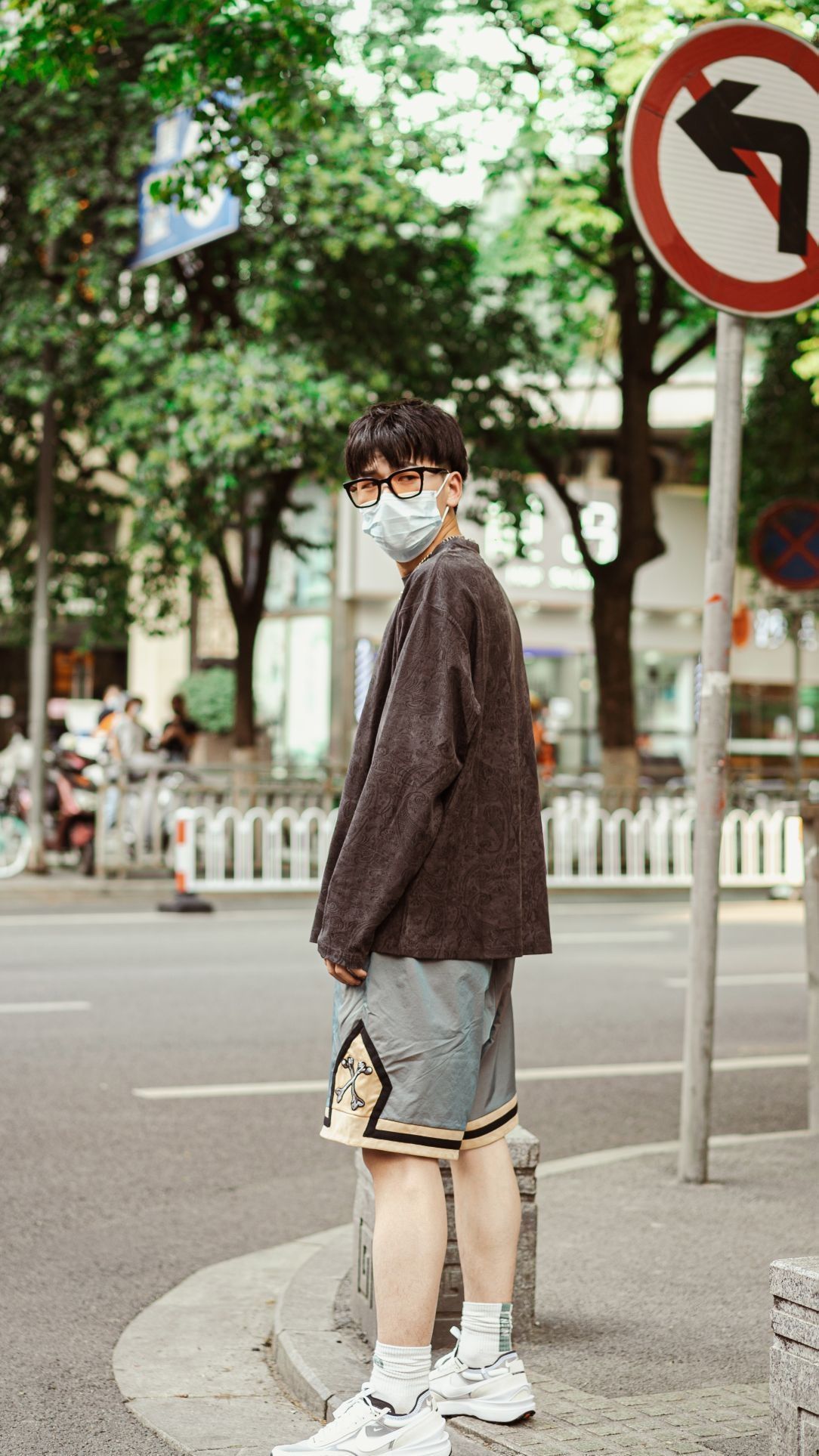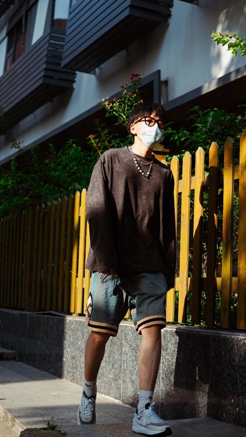 👕:boneless 麂皮材质,上身很有质感,用的是暗纹腰果花的刺绣设计,美式街头风尽显,深色系,内穿外搭怎么都好看。 👖:boneless 裤子采用变色拼接的骨头印花,上身大概在膝盖位置,五分裤,很宽松,上身没有束缚感,运动感满满 👟:Nike waffle one 后跟是解构风设计,部分采用麂皮材质,提升质感,前脚掌部分网眼面料,很透气